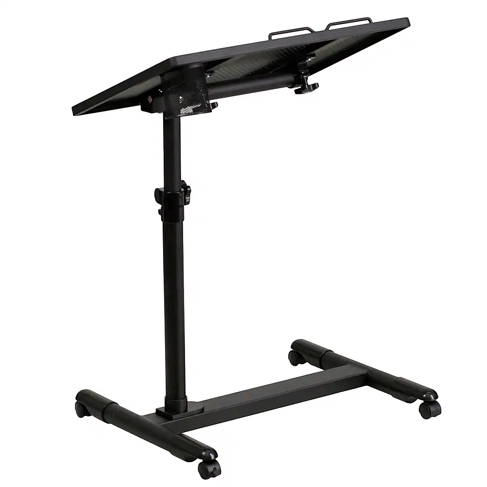 Get moving…or stay put on this mobile computer desk with adjusting capabilities. No need to purchase a cooling pad, the perforated surface allows your laptop to cool down with proper air circulation. Top swivels a full 360 degrees, tilts and has a top and bottom lip to prevent papers from falling. The height adjustable frame allow user to adjust the table to their height preference. Keep this piece looking great with a water-based cleaner. This computer stand will serve as a great option for arts and crafts.