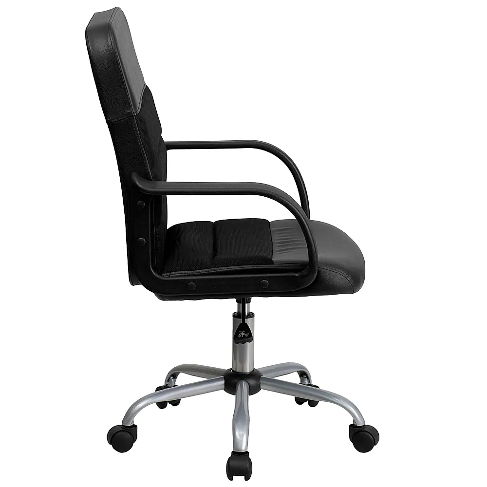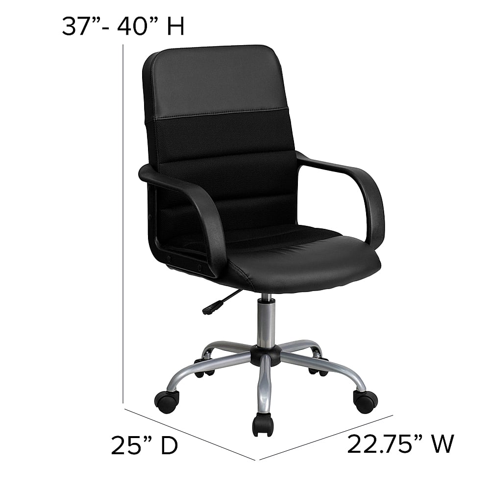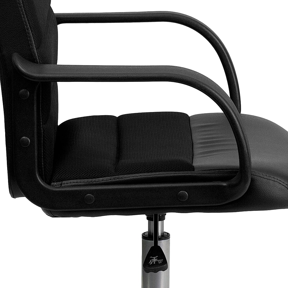 Upgrade your seating at work with this LeatherSoft and mesh upholstered office chair. The combination upholstery will complement your office whether it is downtown or you work from home. Mesh office chairs can keep you more productive throughout your work day with their comfort and ventilated design. The breathable mesh material allows air to circulate to keep you cool while sitting. LeatherSoft is leather and polyurethane for added softness and durability. A mid-back office chair offers support to the mid-to-upper back region. Chair easily swivels 360 degrees to get the maximum use of your workspace without strain. The pneumatic adjustment lever will allow you to easily adjust the seat to your desired height.