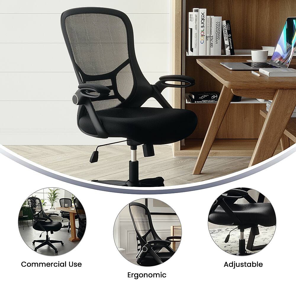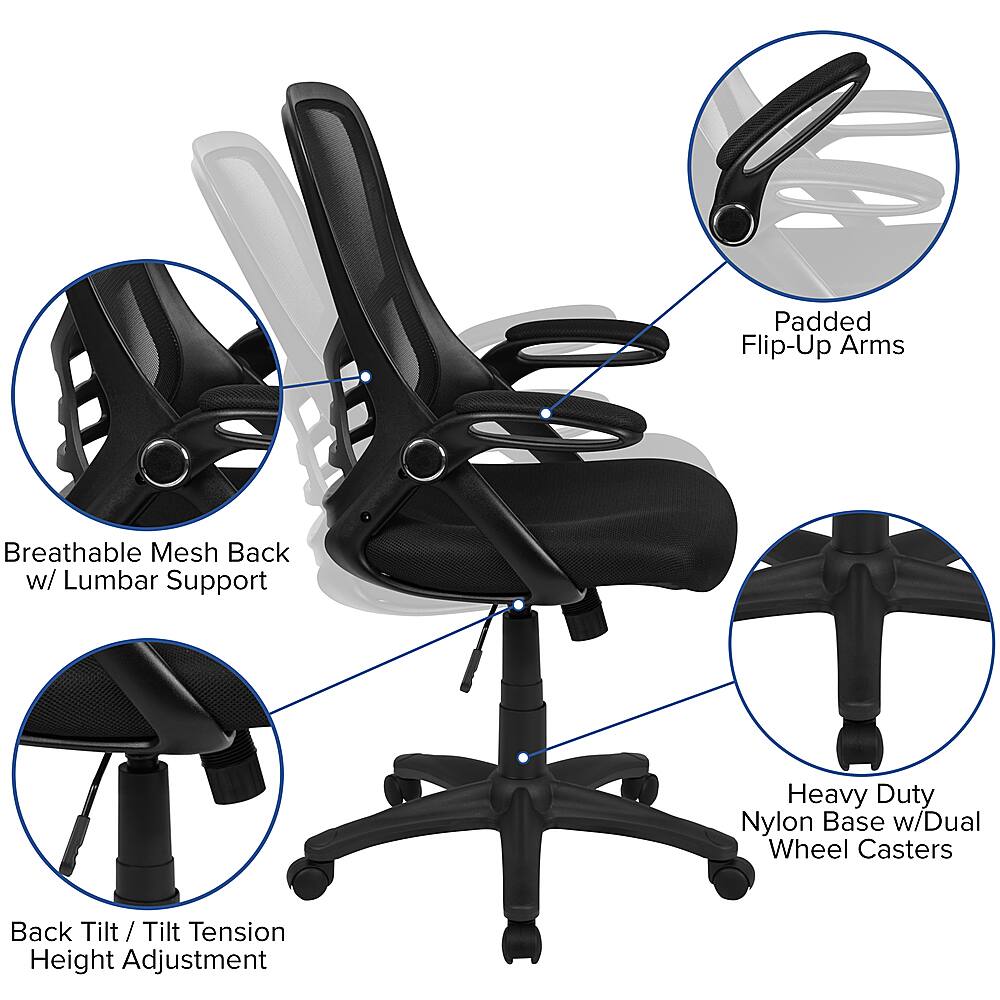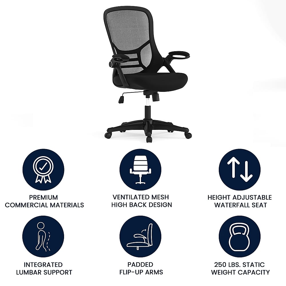 Fall into comfort on this ultra-padded swivel office chair that’ll add personality to your home office or professional office space. Put that old chair to rest, having the support of an ergonomic office chair will help improve your attitude when you no longer must sit in discomfort. This modern office chair is equipped with a lever to control the seat height and activates the seat recline. Mesh office chairs are popular due to their ventilated mesh material that allow air to circulate to your back, keeping you cool and calm. Paired with a contoured padded seat with pressure relieving waterfall edge and a high back this executive office chair will integrate into any space. If you like working with your chair raised high a flip-up arm chair is perfect allowing you to flip the arms upward like an armless chair while pulling yourself close to your desk. You’ll have no problem taking charge of your workday perched on this high back ergonomic office chair with flip-up arms. You’ll wish you had purchased this chair sooner, whether as a personal purchase or to accommodate your entire staff.