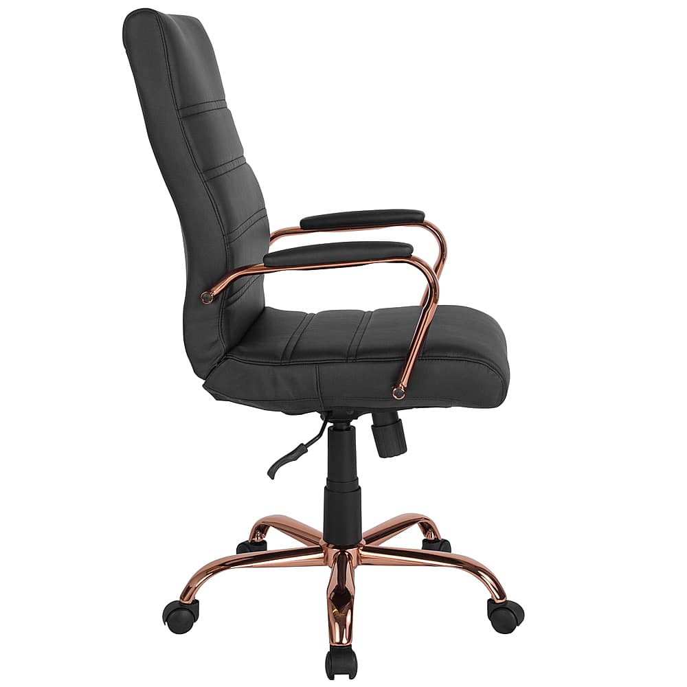 An elegant blend of comfort and style, this high-back LeatherSoft office chair is the perfect seating solution for your workspace. Crafted from black LeatherSoft material with rose gold arms and base, the ergonomic design brings a sleek look with ample durability and support for long-term use.