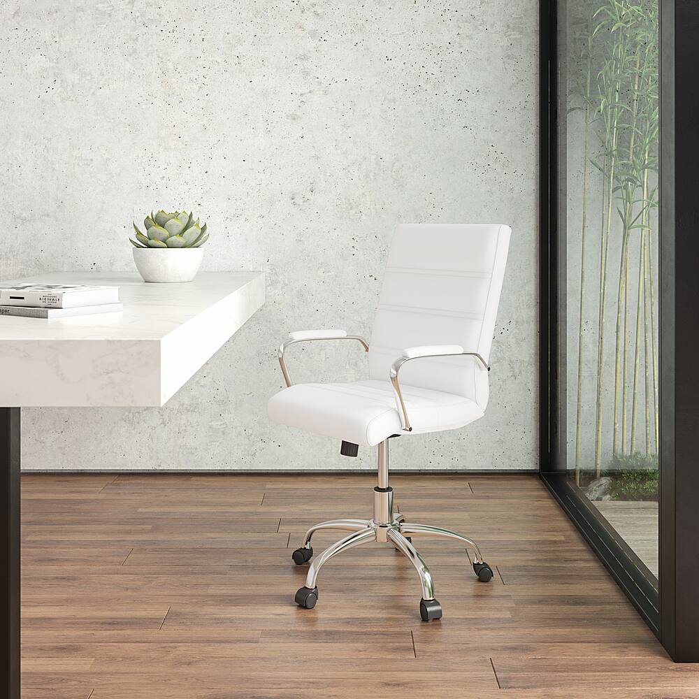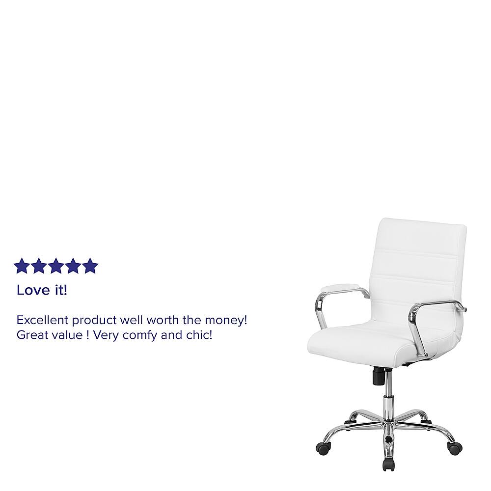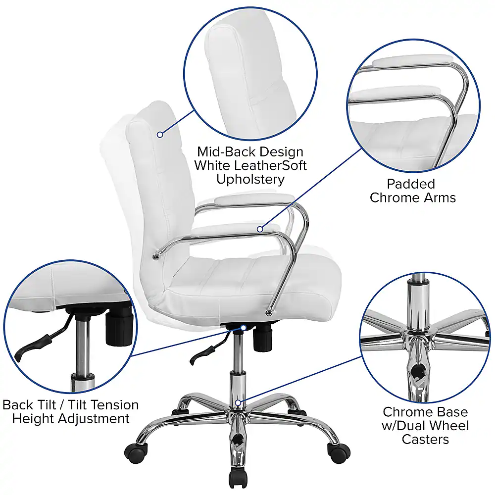 Improve the look at your desk or work area with this stylish Mid-Back White LeatherSoft Office Chair with Chrome Base that is highlighted by attractive horizontal line stitching. A waterfall front edge seat reduces pressure off your legs while the armrest pads relieve the pressure off your necks and help round out the look and comfort of this chair.