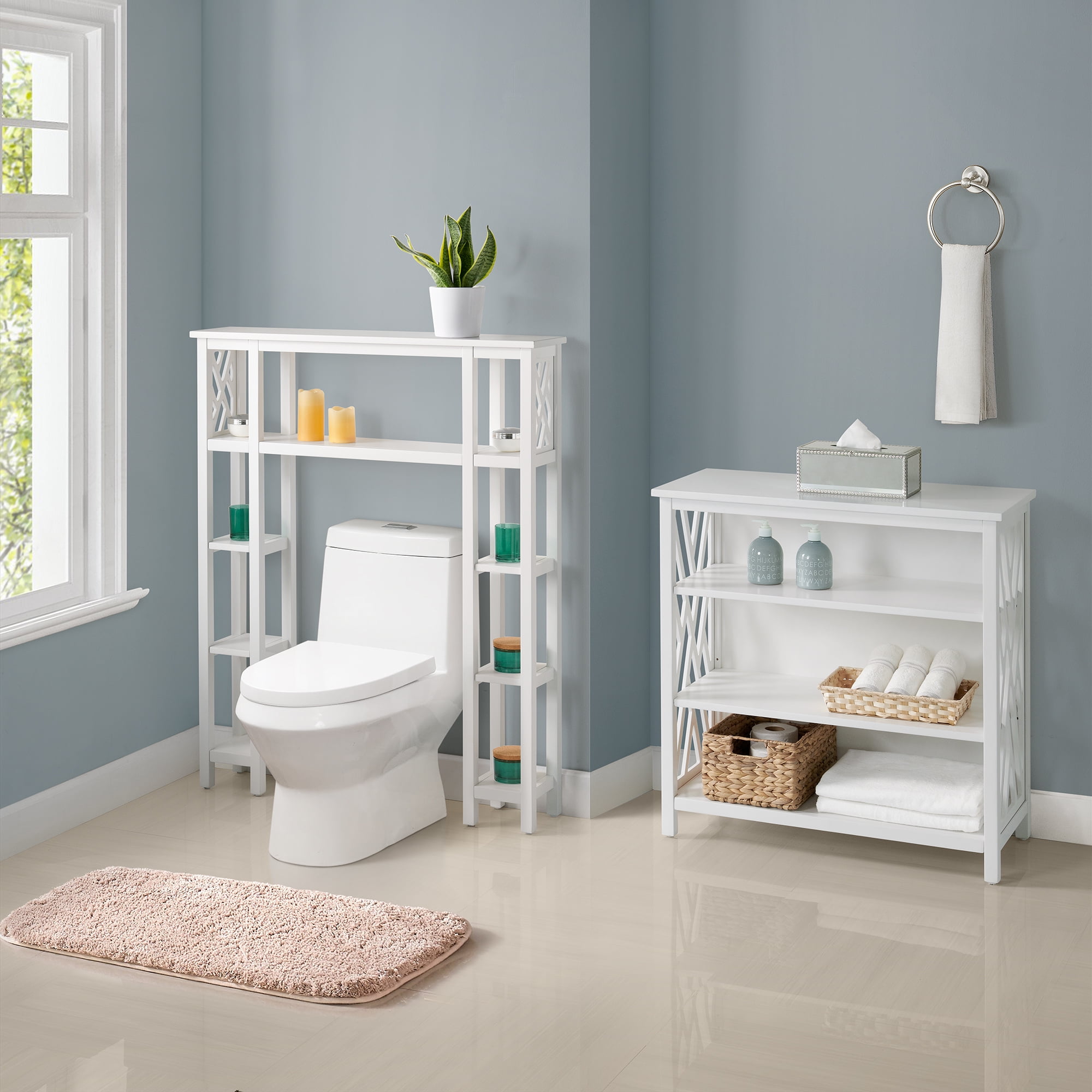 Over toilet open shelving unit with side shelves dimensions: 39″W x 8″D x 48″H; bath storage shelf dimensions: 32″W x 15″D x32″H Space saver organizer is 35″H from ground, allowing it to fit over most standard toilets Over-the-toilet storage unit and bath storage shelf add style and utility to your bathroom space