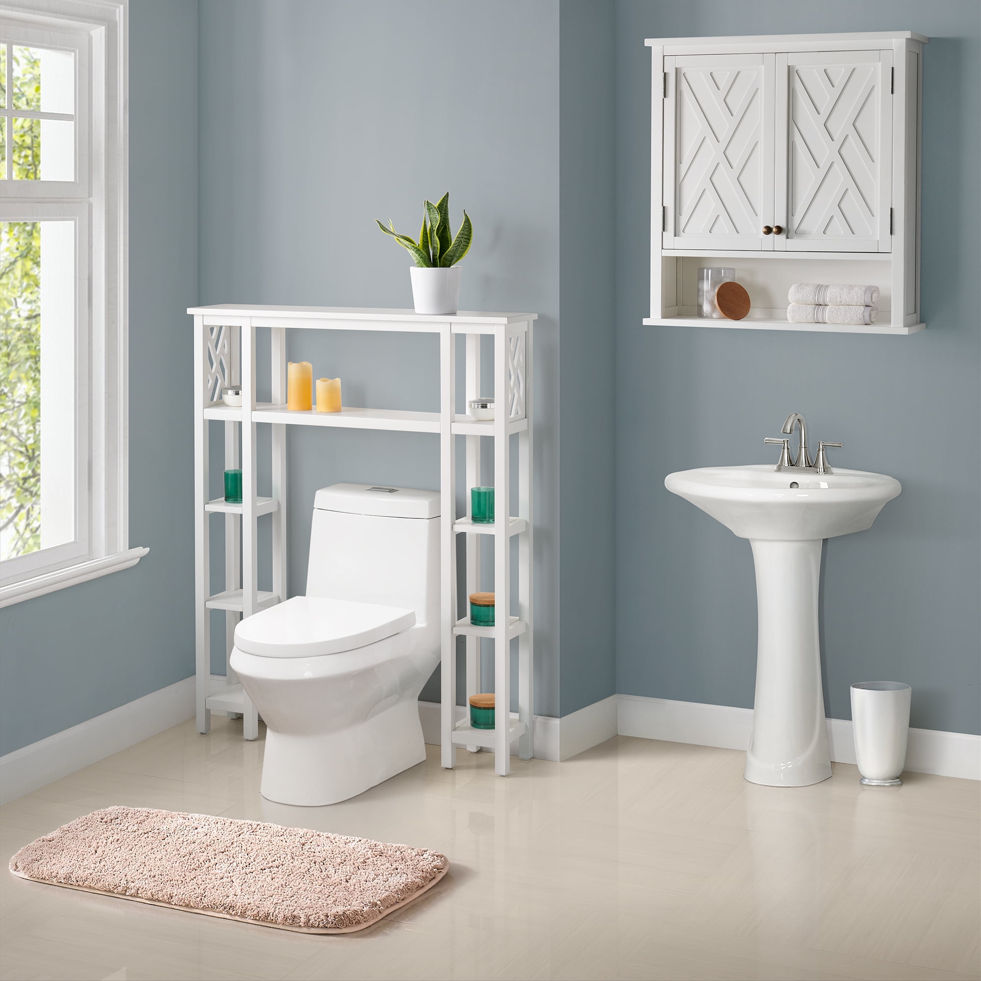 Over toilet open shelving unit with side shelves dimensions: 39″W x 8″D x 48″H; wall mounted storage cabinet dimensions: 27″ W x 8″ D x 29″ H Space saver organizer is 35″H from ground, allowing it to fit over most standard toilets Over-the-toilet storage unit and wall mounted cabinet add style and utility to your bathroom space