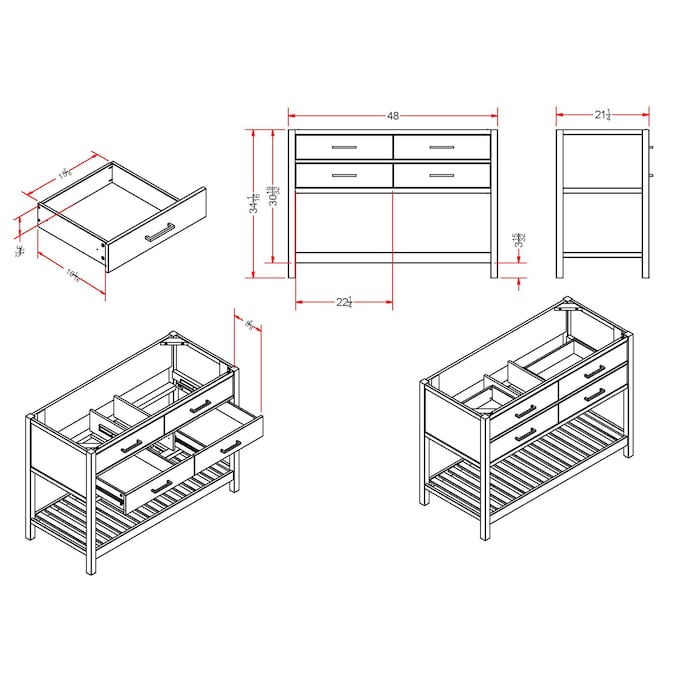 - Overall dimensions: 48in W x 21 1/4in D x 34in H