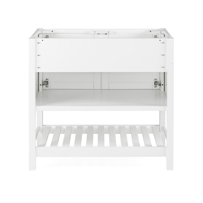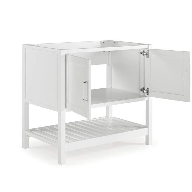 Enhance your bathroom or powder room space with this freestanding vanity base cabinet that has a classic look as well as ample storage space. Made from solid pine wood and composite wood, the base features two paneled shaker doors with sleek nickel handles that allows you to store cleaning supplies and other bathroom essentials. An open, slatted bottom shelf offers additional room for bath towels or accessories. The clean white finish complements a wide range of decors. Vanity top and sink are not included.