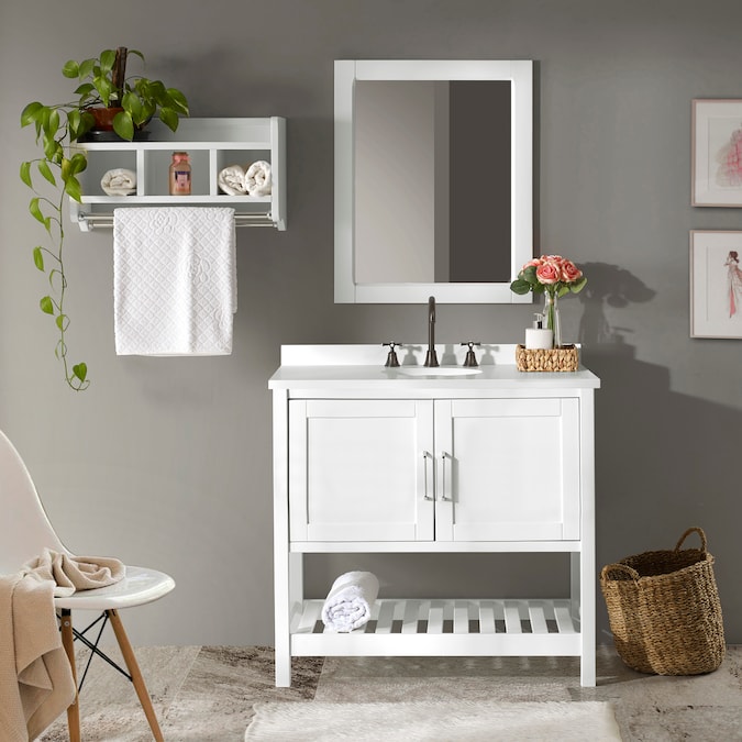 - Free standing vanity is seated on the floor providing a functional design that doesn’t overwhelm the space; Distance from floor to bottom shelf: 3 1/2in