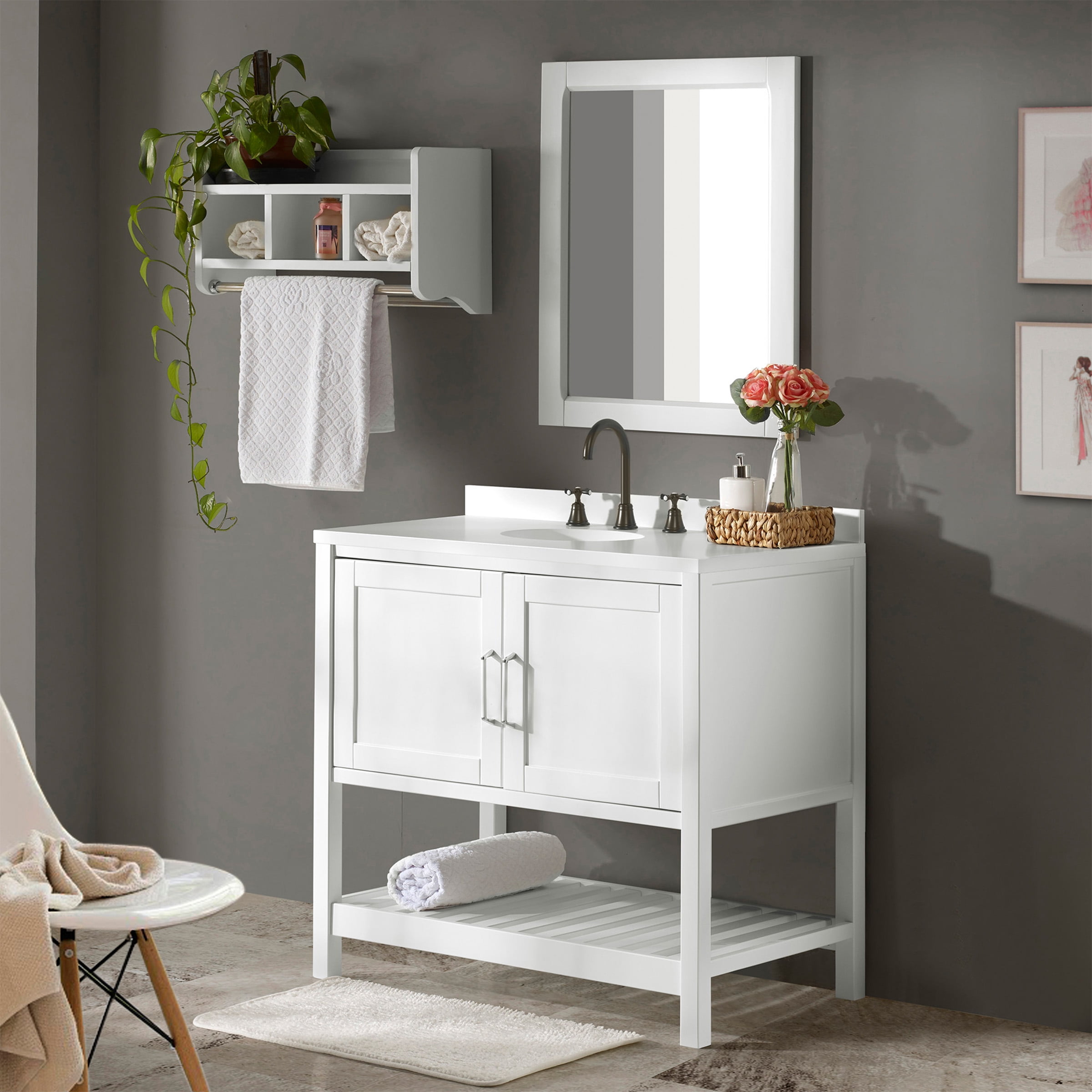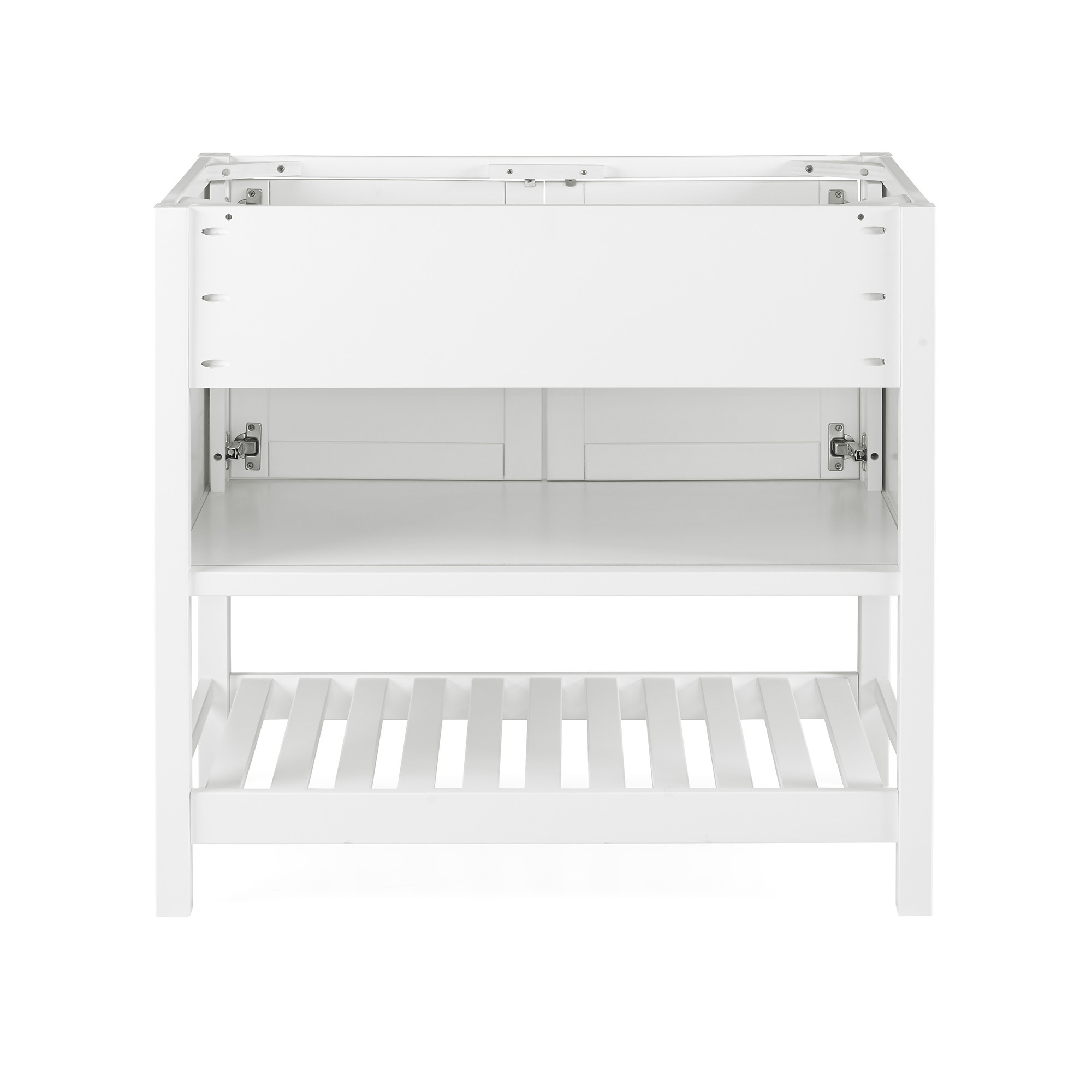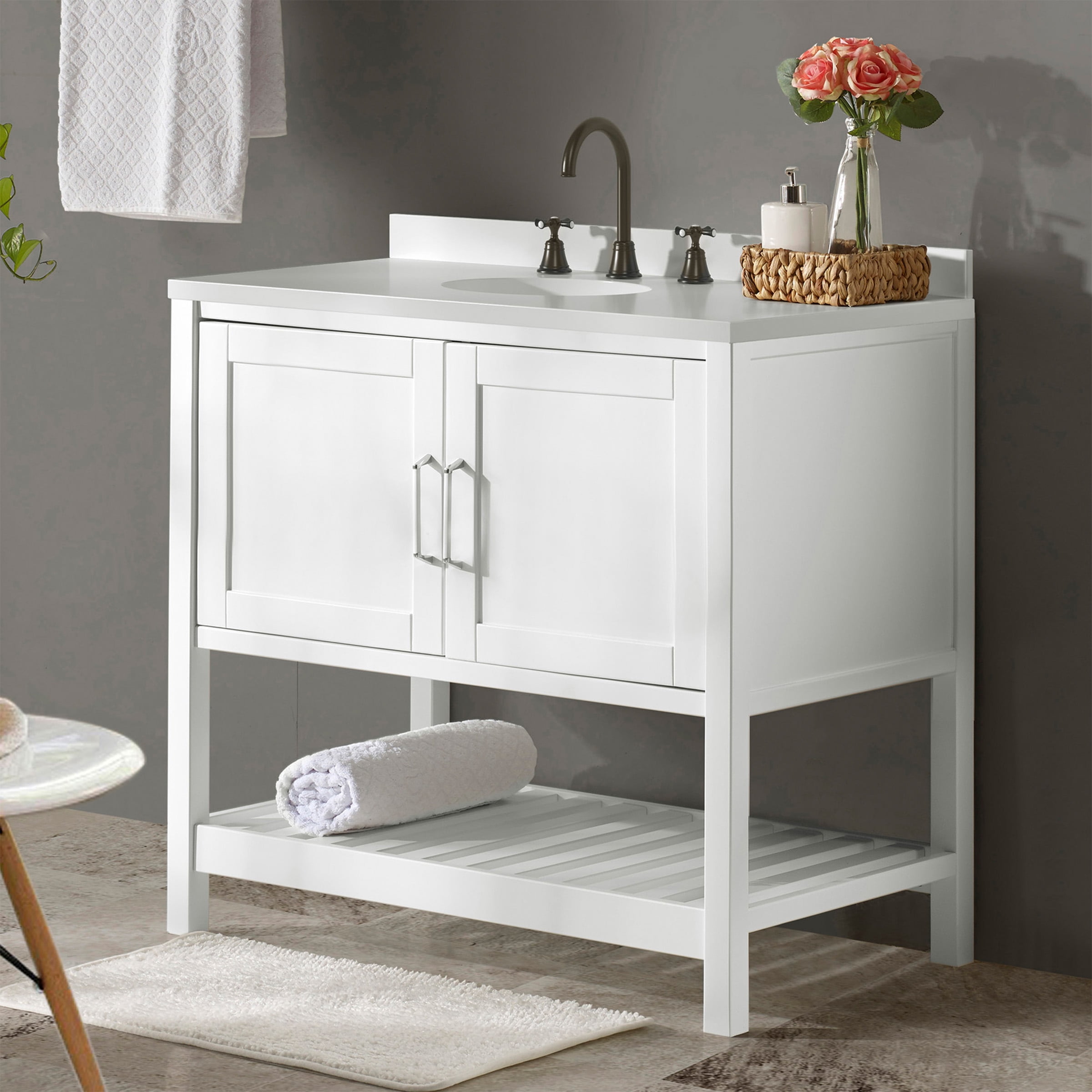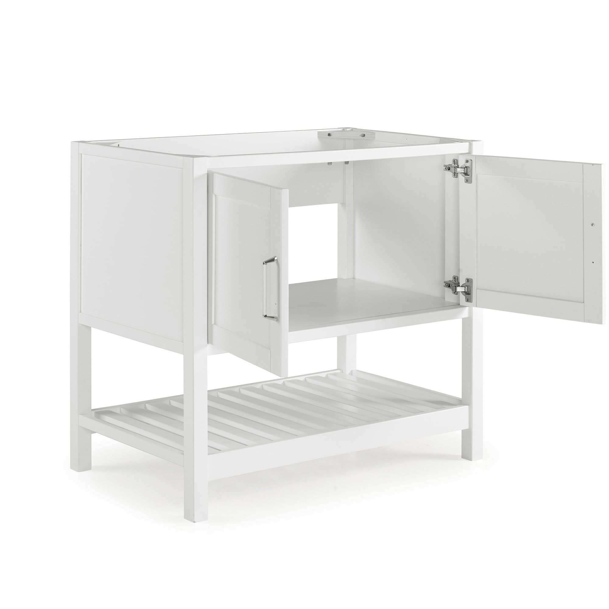 Enhance your bathroom or powder room space with this freestanding vanity base cabinet that has a classic look as well as ample storage space. Made from solid pine wood and composite wood, the base features two paneled shaker doors with sleek nickel handles that allows you to store cleaning supplies and other bathroom essentials. An open, slatted bottom shelf offers additional room for bath towels or accessories. The clean white finish complements a wide range of decors. Vanity top and sink are not included. Features: Overall dimensions: 36″ W x 21 1/4″ D x 34″ H Slatted shelf dimensions: 33″W x 18″D x 9.5″H Interior cabinet dimensions: 34 1/2″W x 19 3/8″ D x 17 1/2″ H Soft-close doors, nickel hardware and hinges, adjustable height levelers Cabinet offers generous space for linens, toiletries, or other bath essentials Free standing vanity is seated on the floor providing a functional design that doesn’t overwhelm the space; Distance from floor to bottom shelf: 3 1/2″ Faucets, sinks, and countertop not included Assembly required. Specifications: Cabinet Dimensions: 36″ W x 21 1/4″ D x 34″ H Seat Depth: 21.5″ H x 23.5″ W Stool Dimensions: 33″ W x 17.5″ D