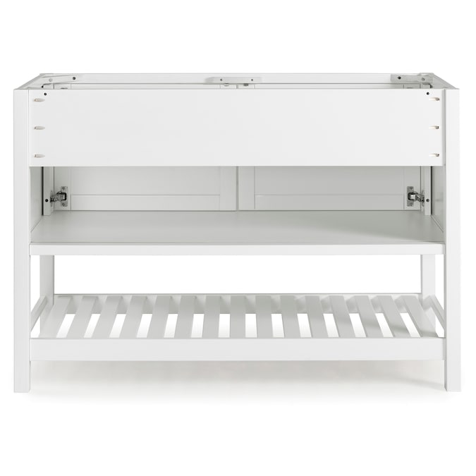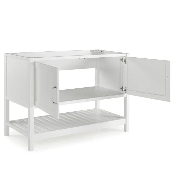 Enhance your bathroom or powder room space with this freestanding vanity base cabinet that has a classic look as well as ample storage space. Made from solid pine wood and composite wood, the base features two paneled shaker doors with sleek nickel handles that allows you to store cleaning supplies and other bathroom essentials. An open, slatted bottom shelf offers additional room for bath towels or accessories. The clean white finish complements a wide range of decors. Vanity top and sink are not included.