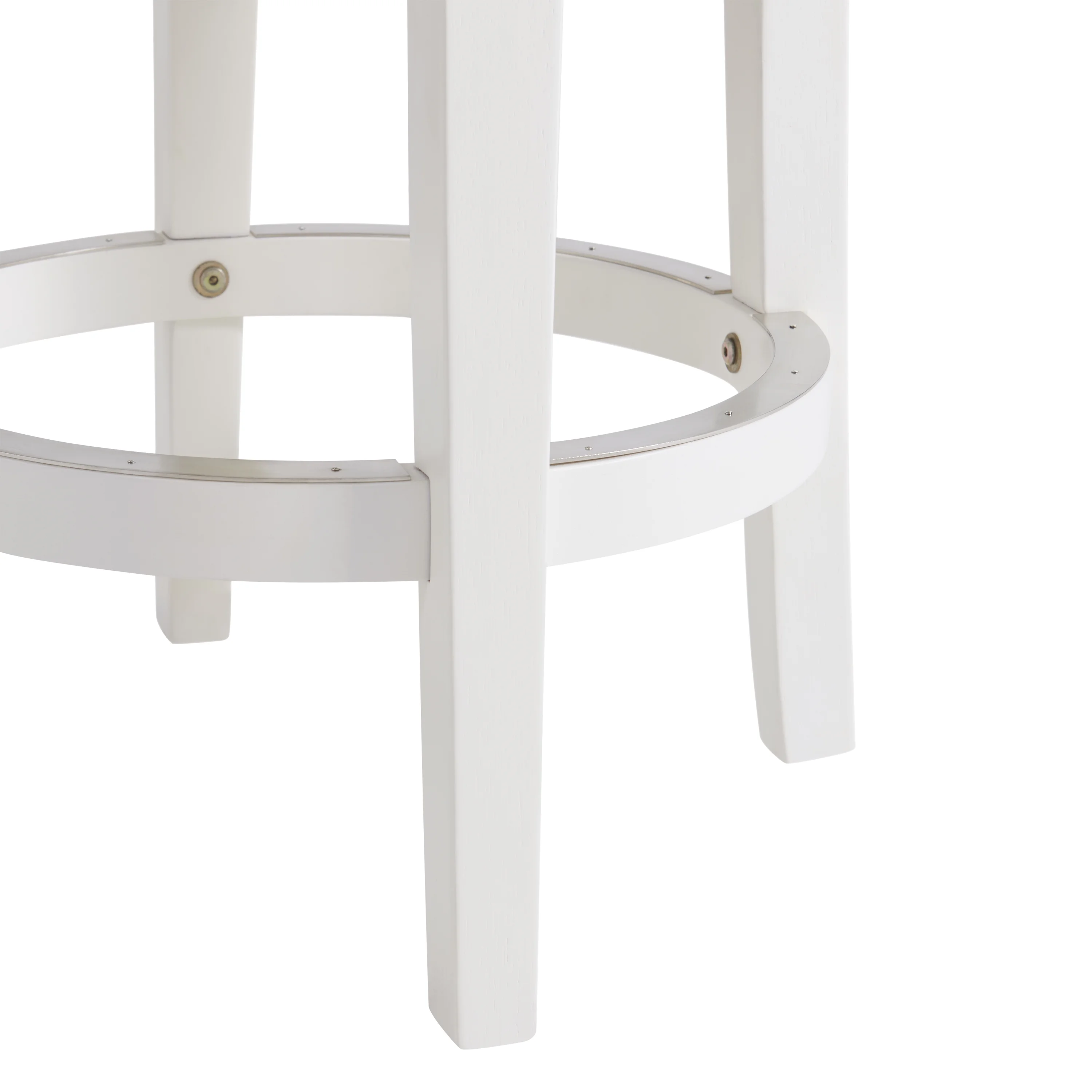 This timeless and elegant counter height stool is sure to be the perfect accent in your home. This stool is the perfect addition to your bar, kitchen island or bistro table. It features a backless design, a built-in footrest, 360-degree swivel range, and nail head trim. Exquisitely crafted from rubberwood and linen like upholstery. This stool features legs that are flared for stability and a metal-plated footrest for durability. Easily tuck in this backless stool to keep your look clean.
