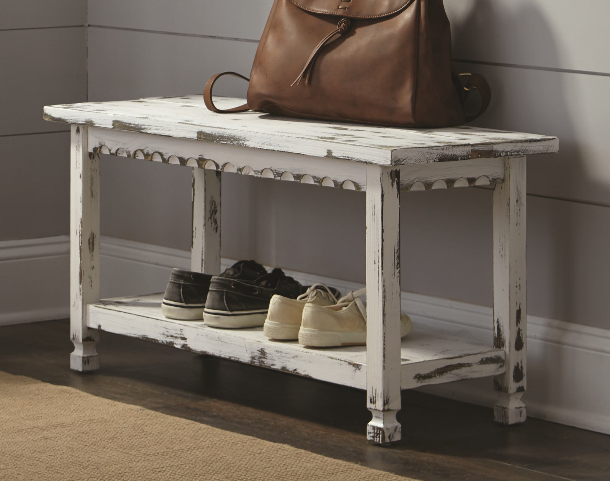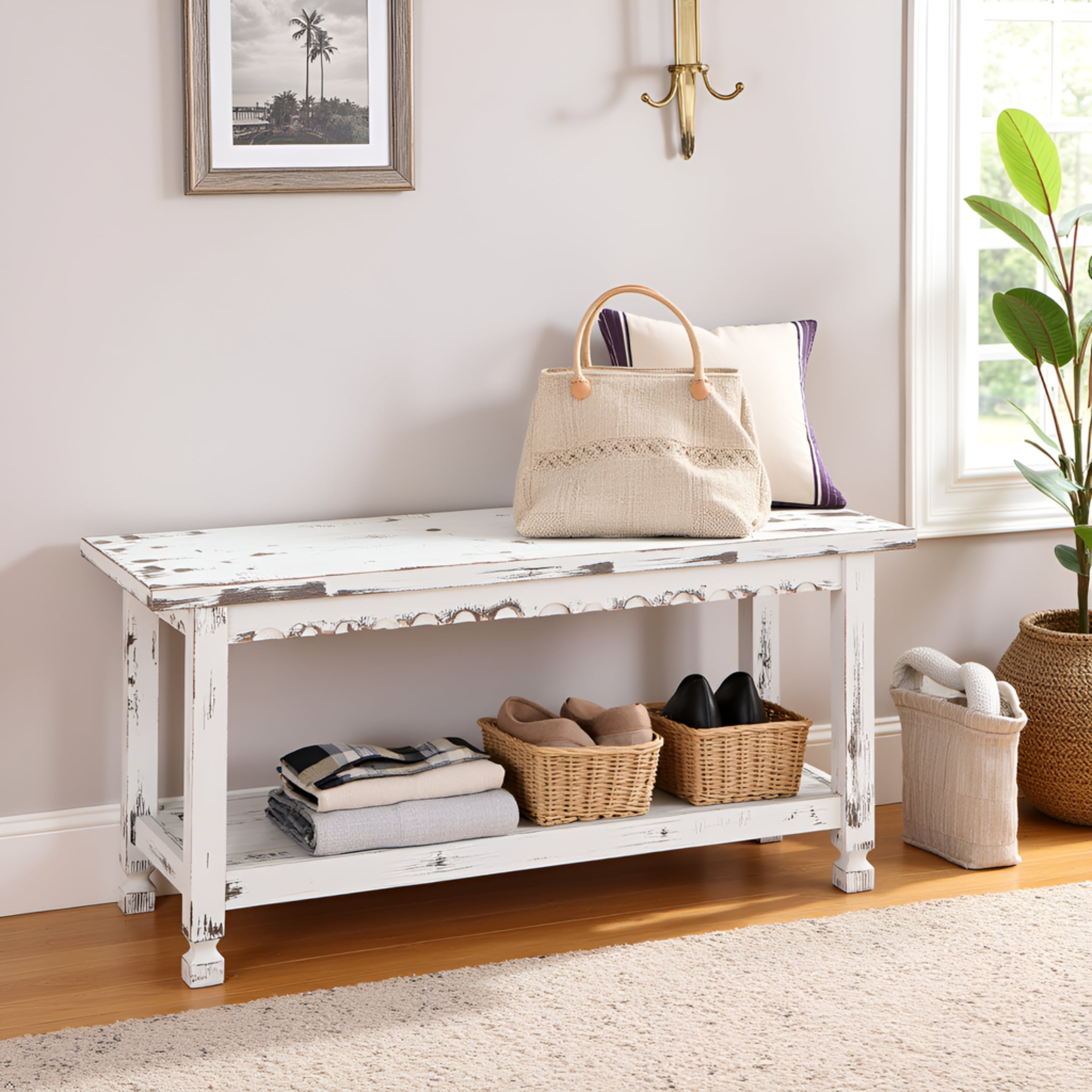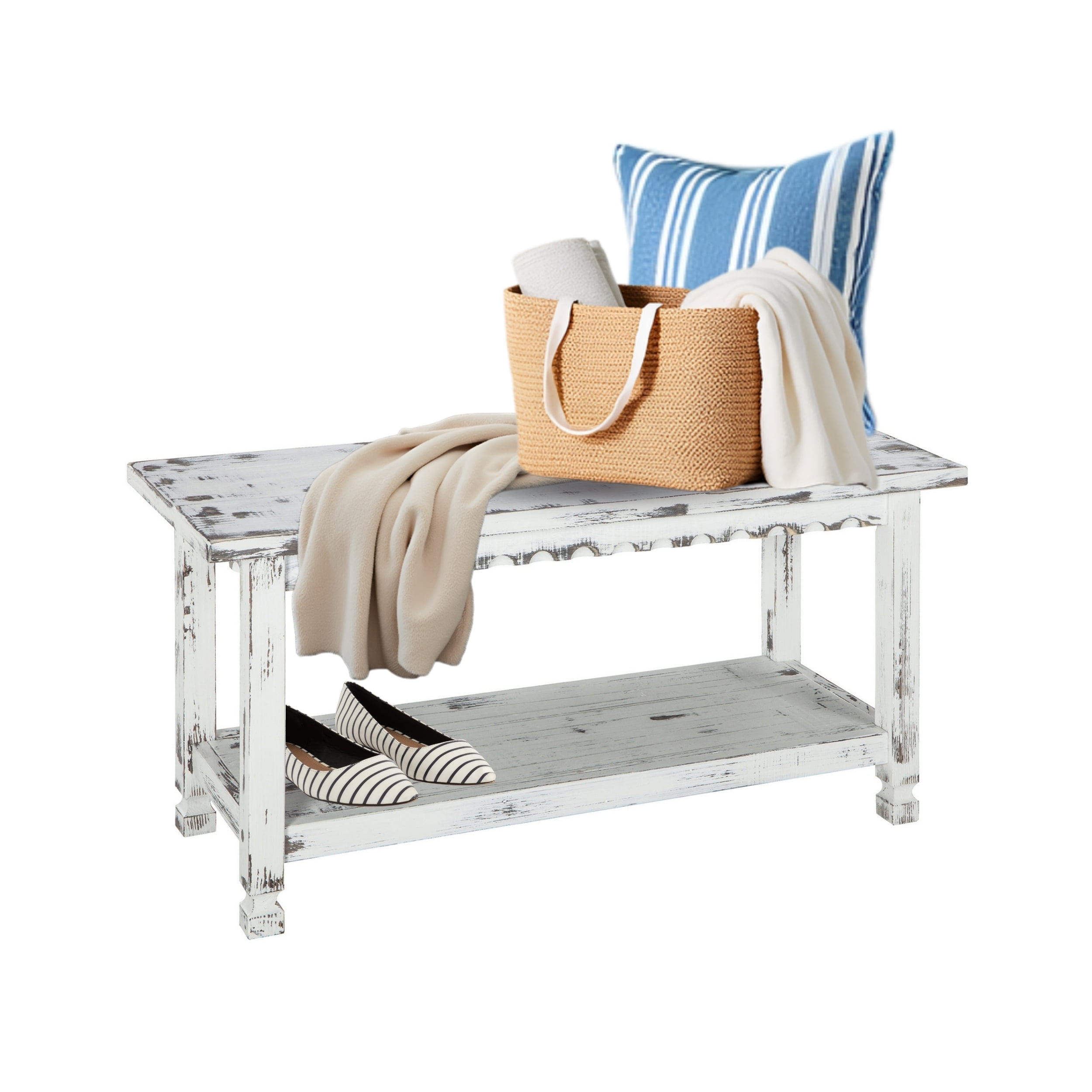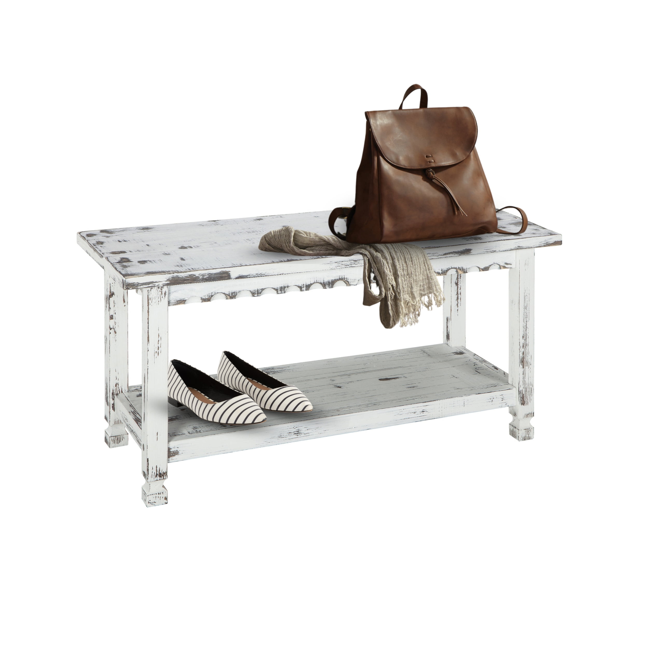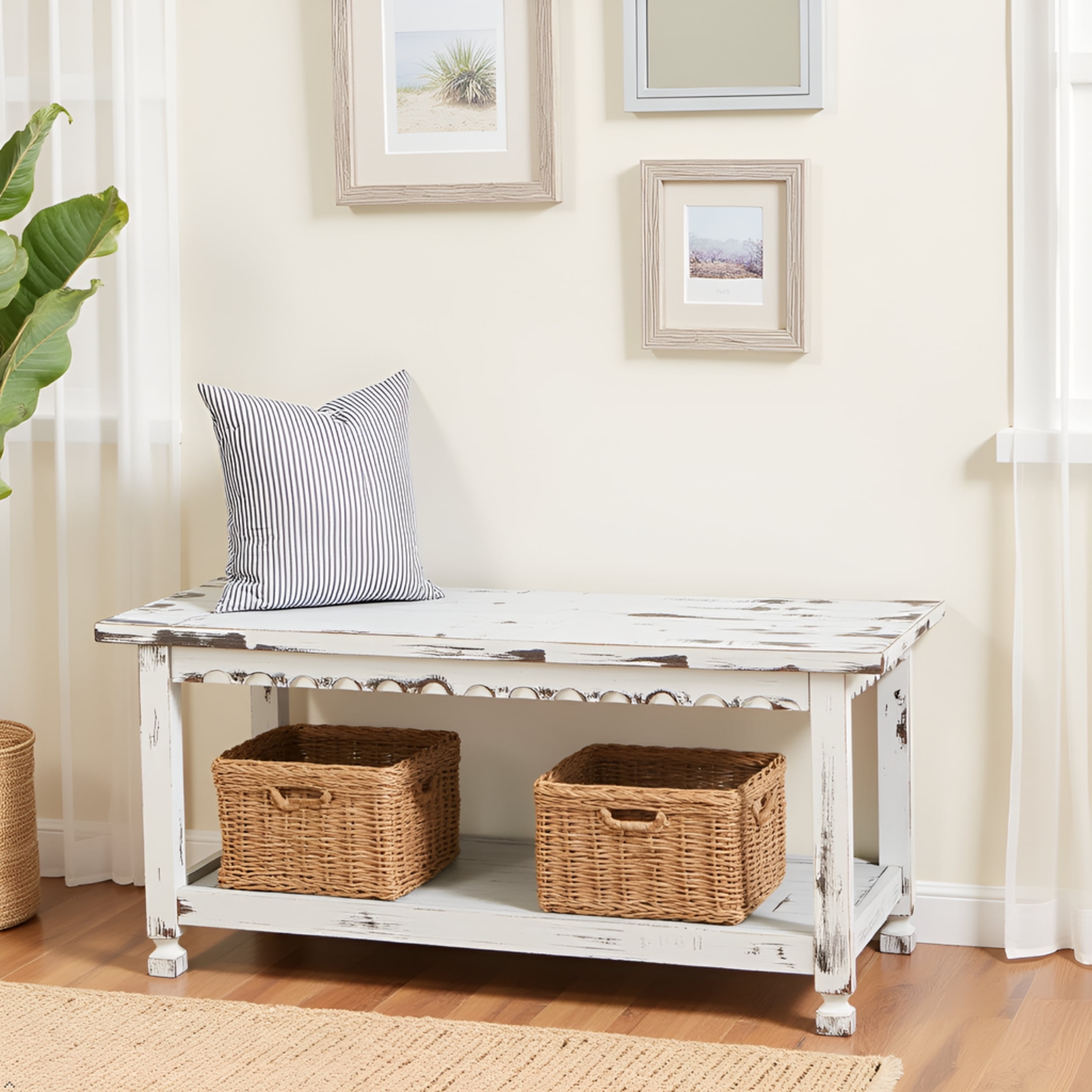 FUNCTIONAL DESIGN – This rustic cottage bench with classic dental work & square, turned legs offers an eye-catching farmhouse style design; #shelf measures 29″x9″x10″H; #dimensions: 36″Wx14″Dx18″H; #Constructed of select hardwoods & composite wood UNIQUE & DISTINCTIVE – Add a charming accent to your home with this white antique bench; distressed finish adds a unique, rustic touch to any living space & is sure to add character to your décor EASY TO CLEAN – Wipe clean with a dry cloth; conveniently maintenance free for a polished look STURDY AND DURABLE CONSTRUCTION – Made from select hardwoods, this Rustic Cottage Bench ensures durability and is perfect for high-traffic areas; assembly required VERSATILE & MULTI-PURPOSE – Perfect for adding seating to any area in your home] living room, entryway, bedroom, or hallway