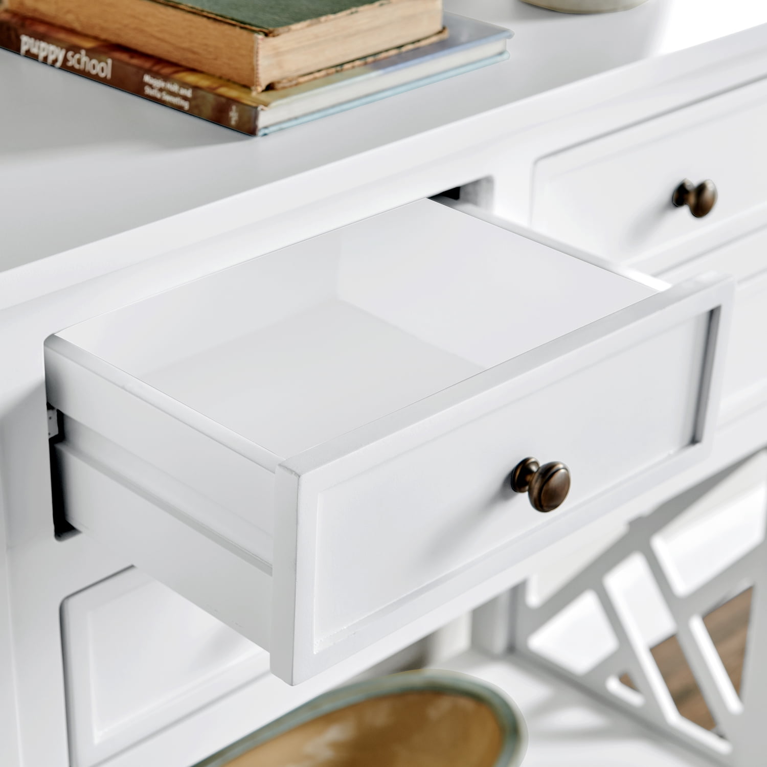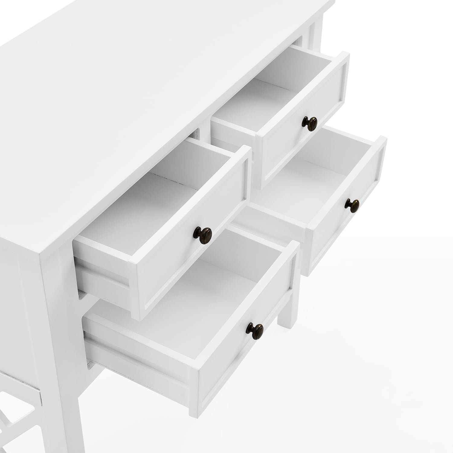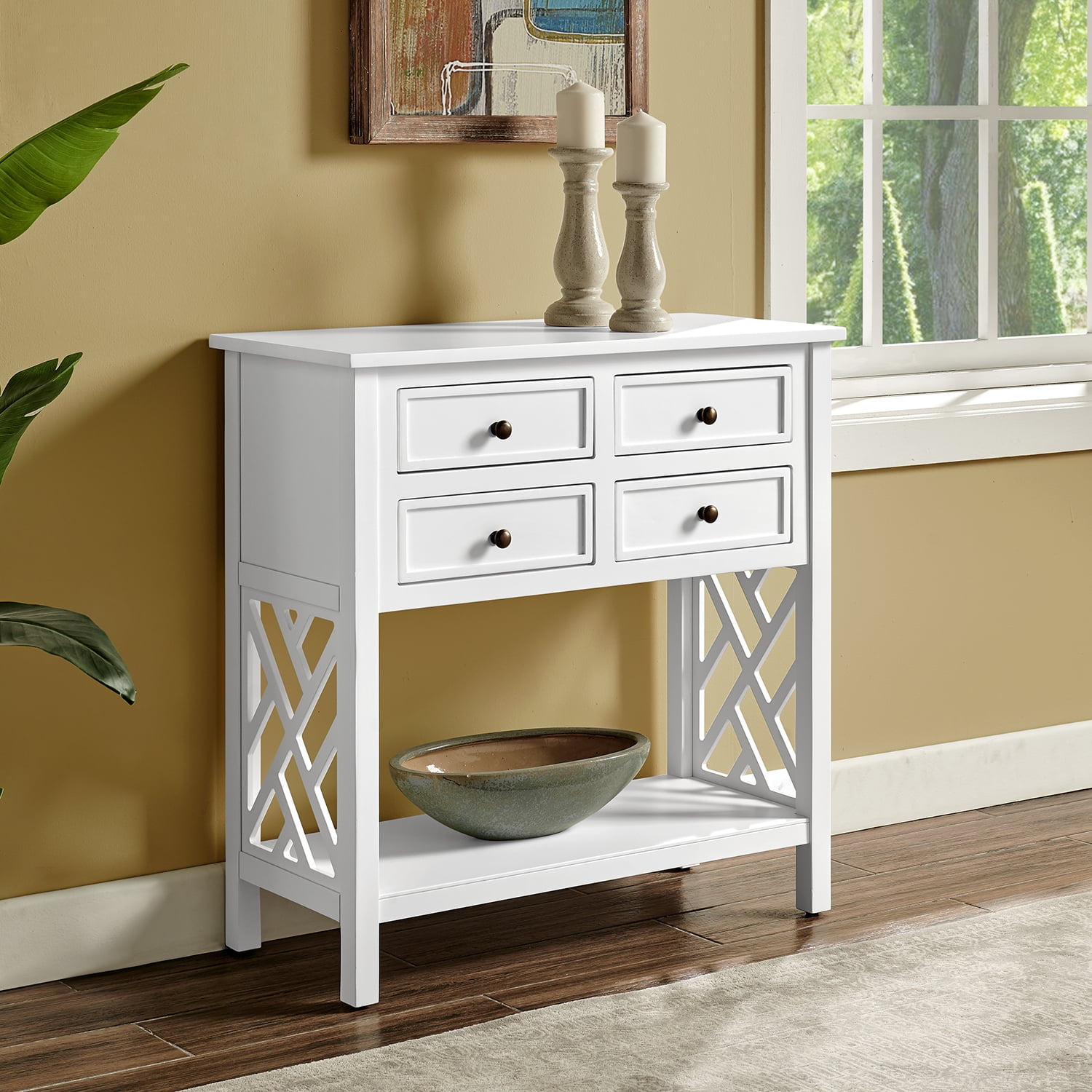 [MODERN LOOK] Transform the ambiance of your living room, entryway, or kitchen with this modernly designed console/sofa table with 4-drawers that includes beautiful open-detailing for a unique designer look [VERSATILE] Versatile console/storage table can be used in your living room, entryway, or even in your kitchen to create a welcoming atmosphere with this classic furniture piece [SPACE SAVING] Bring an airy and spacious feel to your home without compromising space with the four drawers and one shelf included in this console/sofa table [FUNCTIONAL DESIGN] Elevate your home’s aesthetic with the Alaterre Furniture Coventry console table; featuring a 32″ W size that fits perfectly in entryways; includes spacious drawers and a lower shelf for optimal storage options [STYLING] This clean and classic table is perfect for any décor style from traditional to modern, and is the perfect accent piece to complete your makeover
