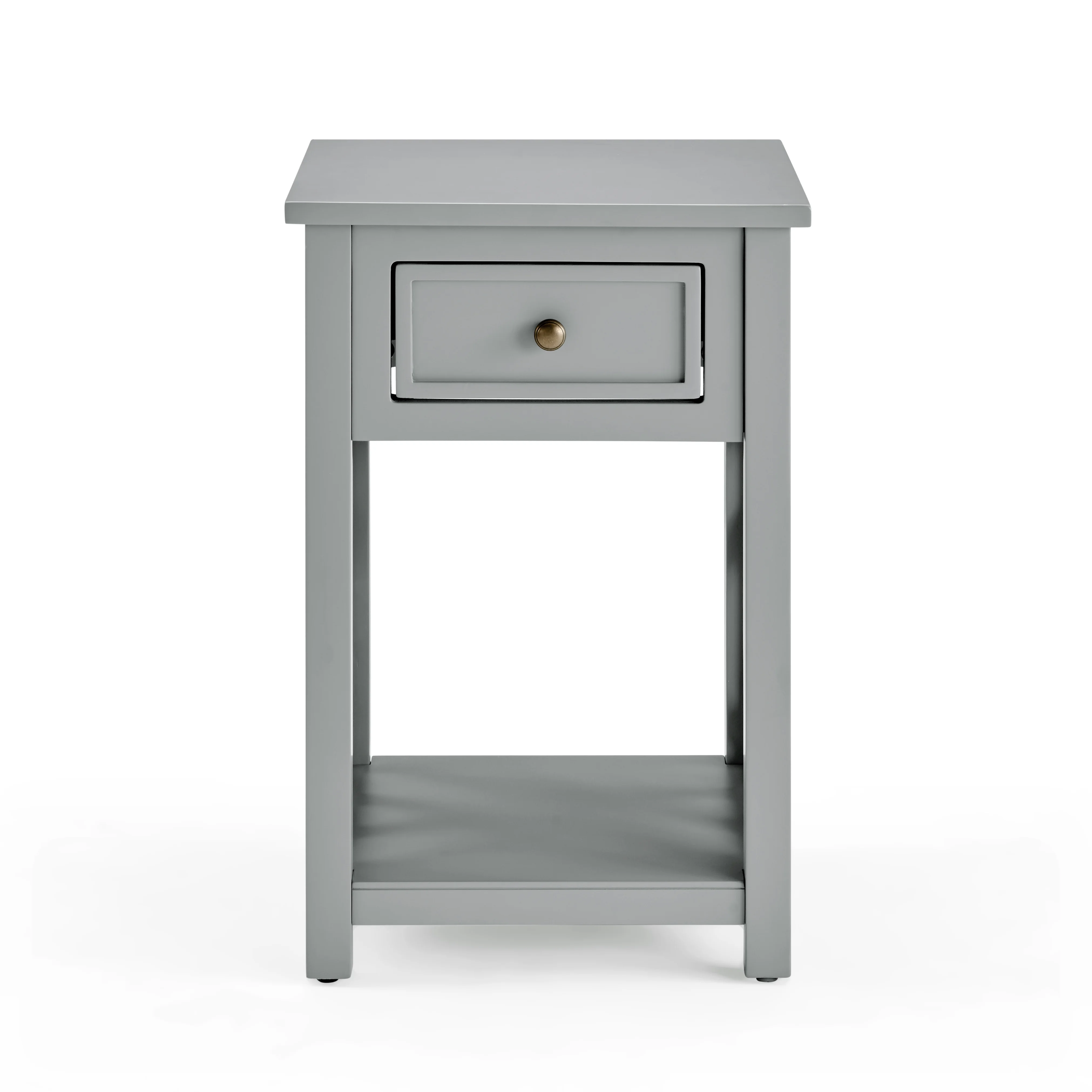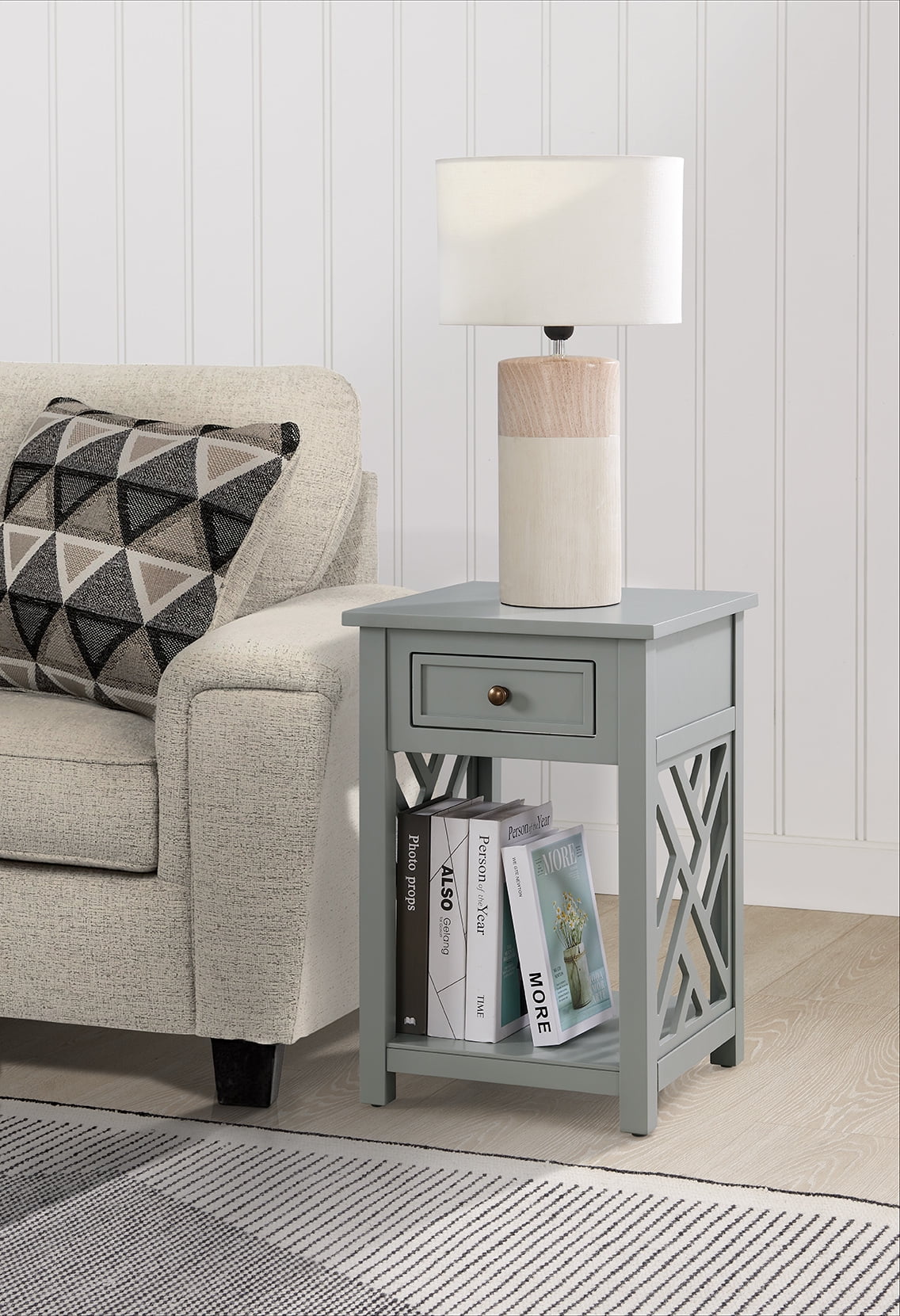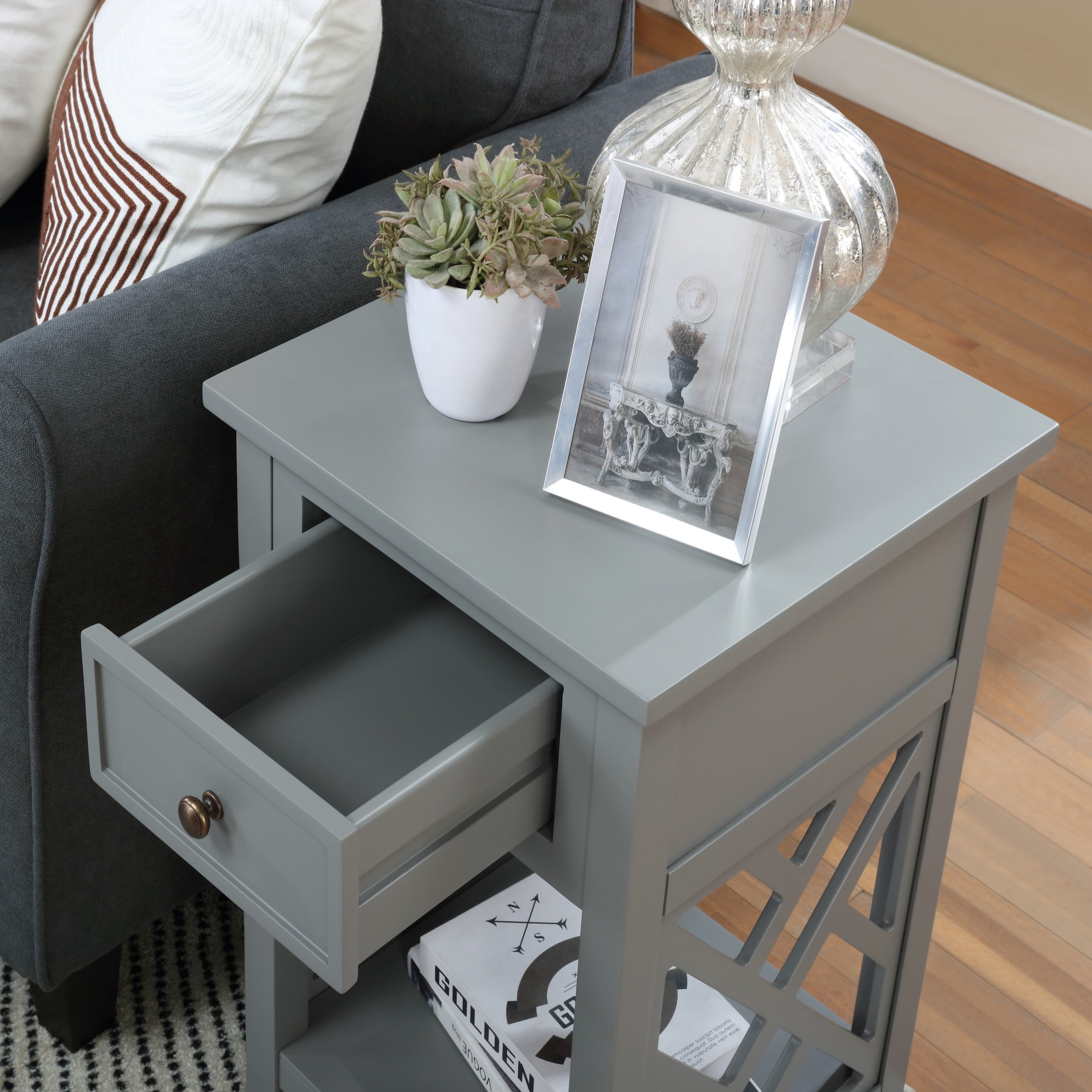 This collection works in a range of decorating styles- from traditional to modern with its clean lines and decorative side-element End table includes drawer and shelf for extra storage Shelf dimensions: 11 3/4″W x 11 3/4″D x 14 1/4″H Drawer dimensions: 9 1/4″W x 11 3/4″D x 3 1/2″H Easy to assemble; do not use power tools for assembly Perfect accent for any space Includes nylon floor levelers Knobs come installed Wood on wood drawer slides