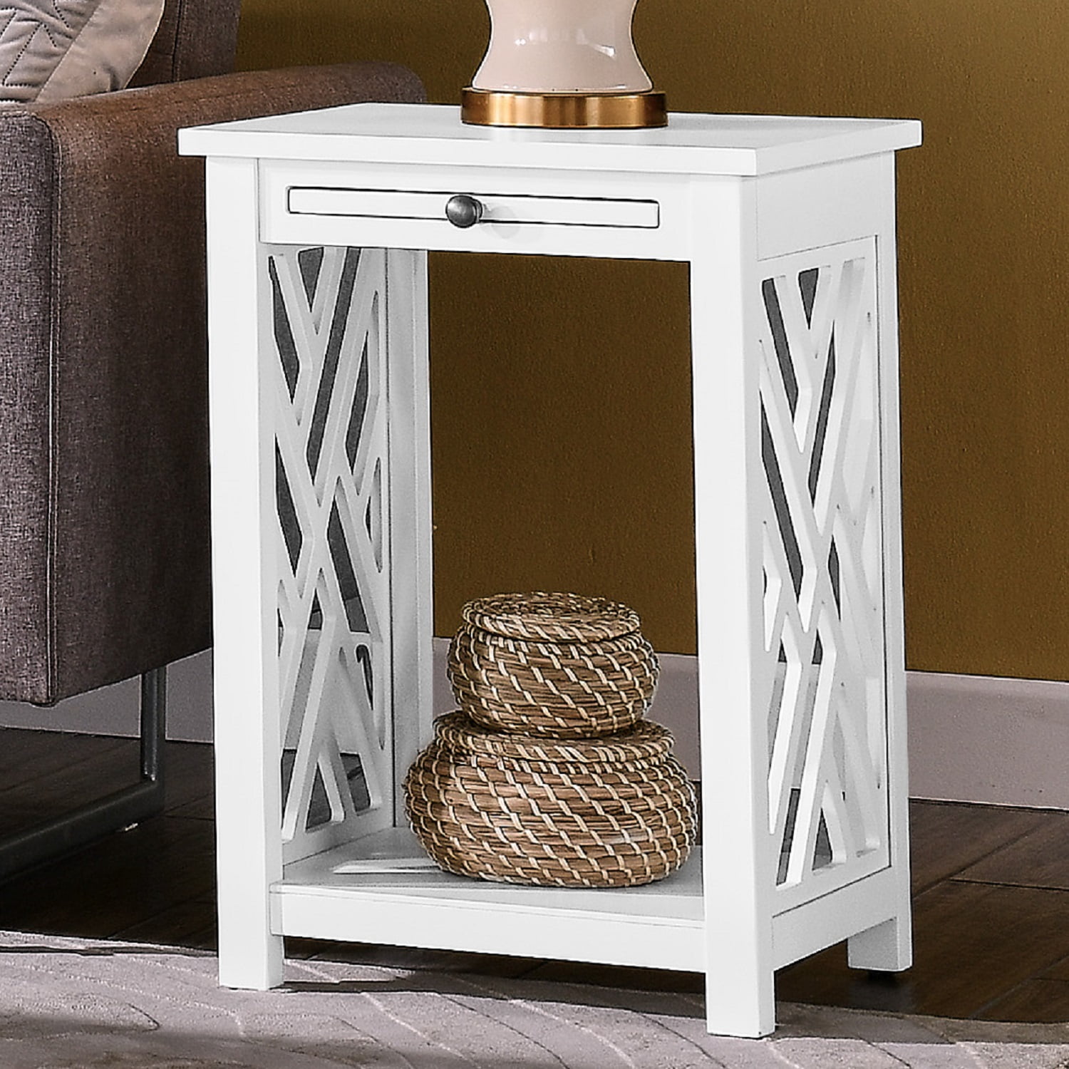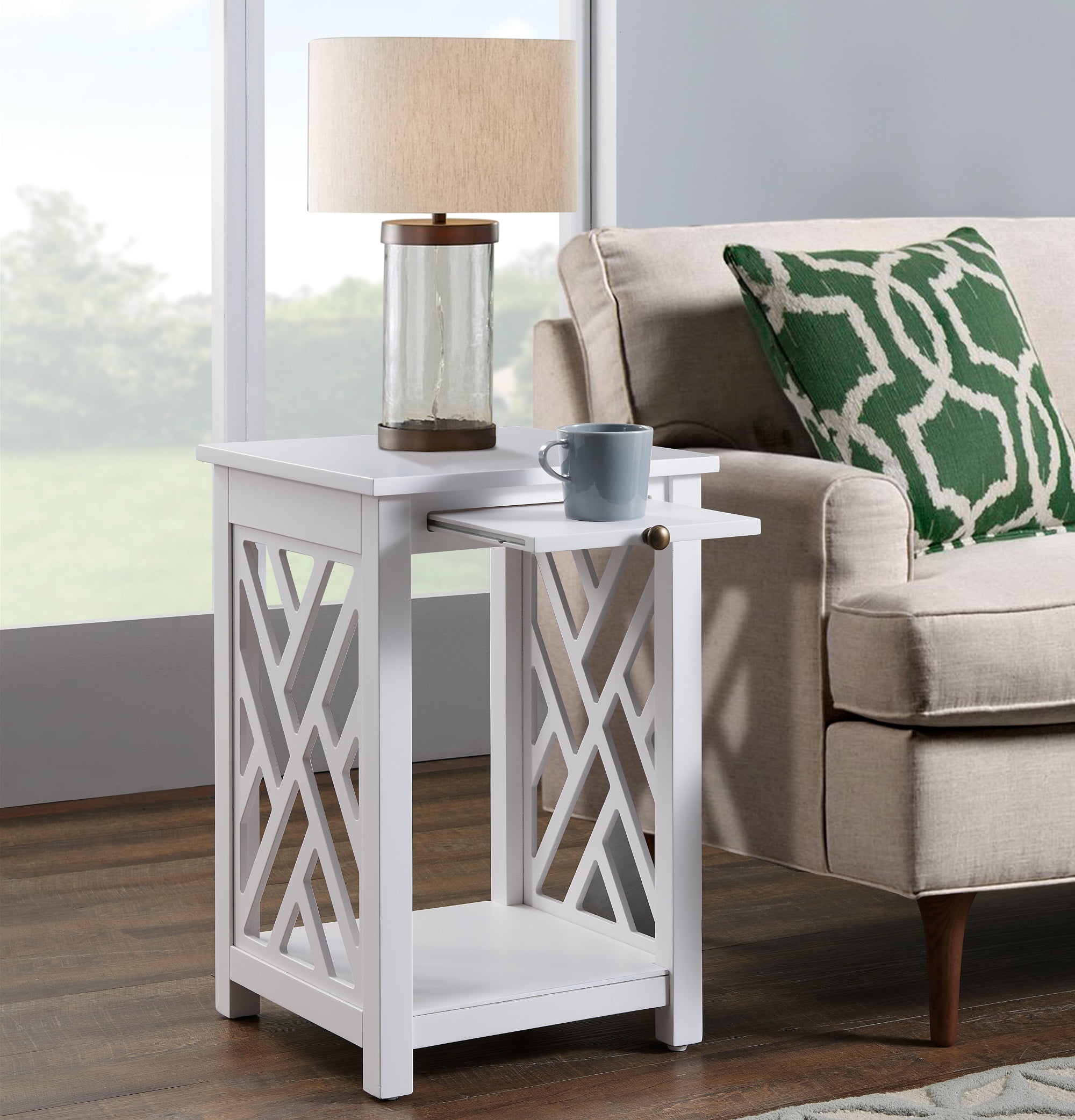 PROVIDE USEFUL STORAGE – Coventry End Table with tray shelf and bottom shelf offers ample storage for books, remotes, and magazines, keeping your living space organized CREATE LOVINGLY CRAFTED AESTHETIC – Open detailing adds an airy feel, making this accent furniture piece an ideal addition to traditional, cottage, or modern loft decor, enhancing any home setting ROBUST BUILT QUALITY – Crafted from premium-aged wood and reinforced with superior construction, this end table is made to last you for years to come. The wide bottom shelf and pull-out tray shelf offer extra stability for heavier home decor items MAXIMIZE YOUR SPACE – Ideal for small apartments, this Alaterre Furniture Coventry Wood Accent Tray Table features a compact design with a pull-out tray and spacious lower shelf; enhances any living room with its simple white finish EASY TO ASSEMBLE – Easily assemble with the helpful step-by-step instructions sheet. Please be aware that during assembly, you must use manual tools for screws and bolts, as power tools may damage the wood finish