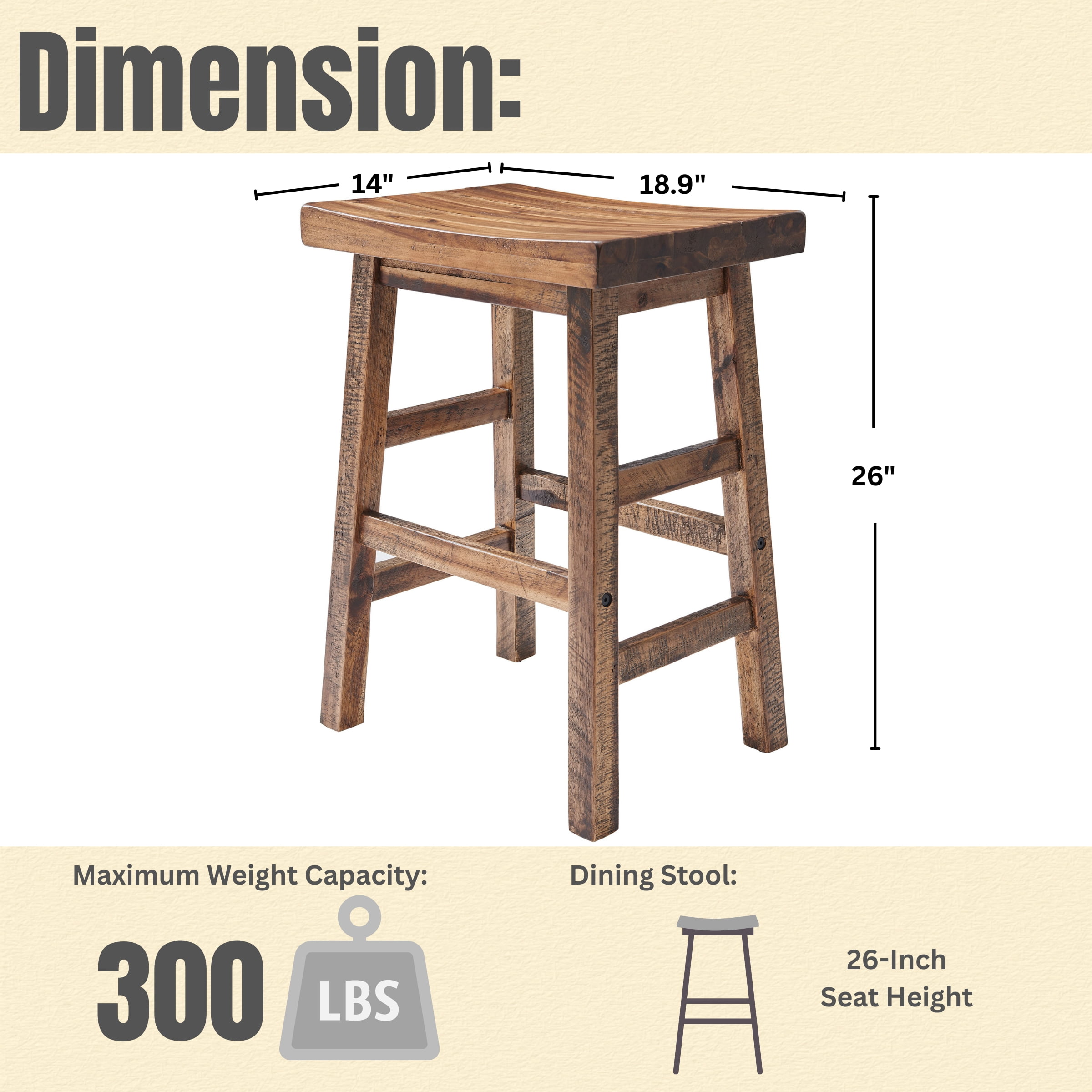 26″H stool is the perfect height for extra seating at a counter or for hanging out near the dart board This piece will allow your décor to be uniquely yours; each piece alone makes a statement Together the pieces in this collection provide a distinct rustic industrial style Saddle-shaped seat for comfort No piece is exactly alike; subtle imperfections such as knots and cracks are part of the wood’s character All wood with metal bolts as accents Weight capacity: 300 lbs. Easy to assemble Hardware and all tools included Nylon floor levelers Overall Dimensions: 18.9″ W x 14″ D x 26″ H