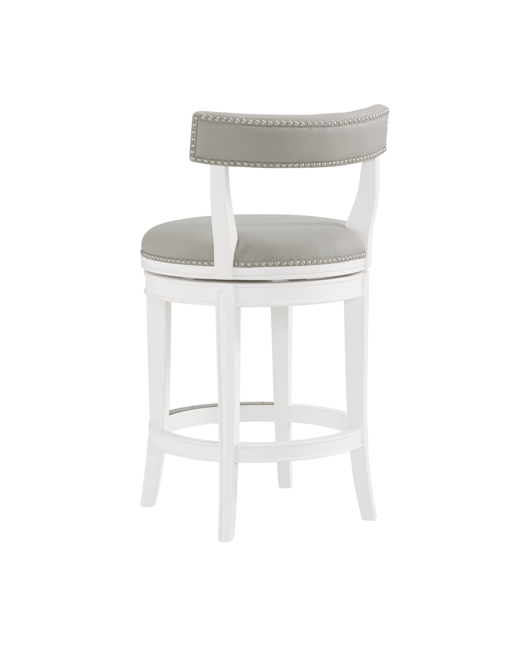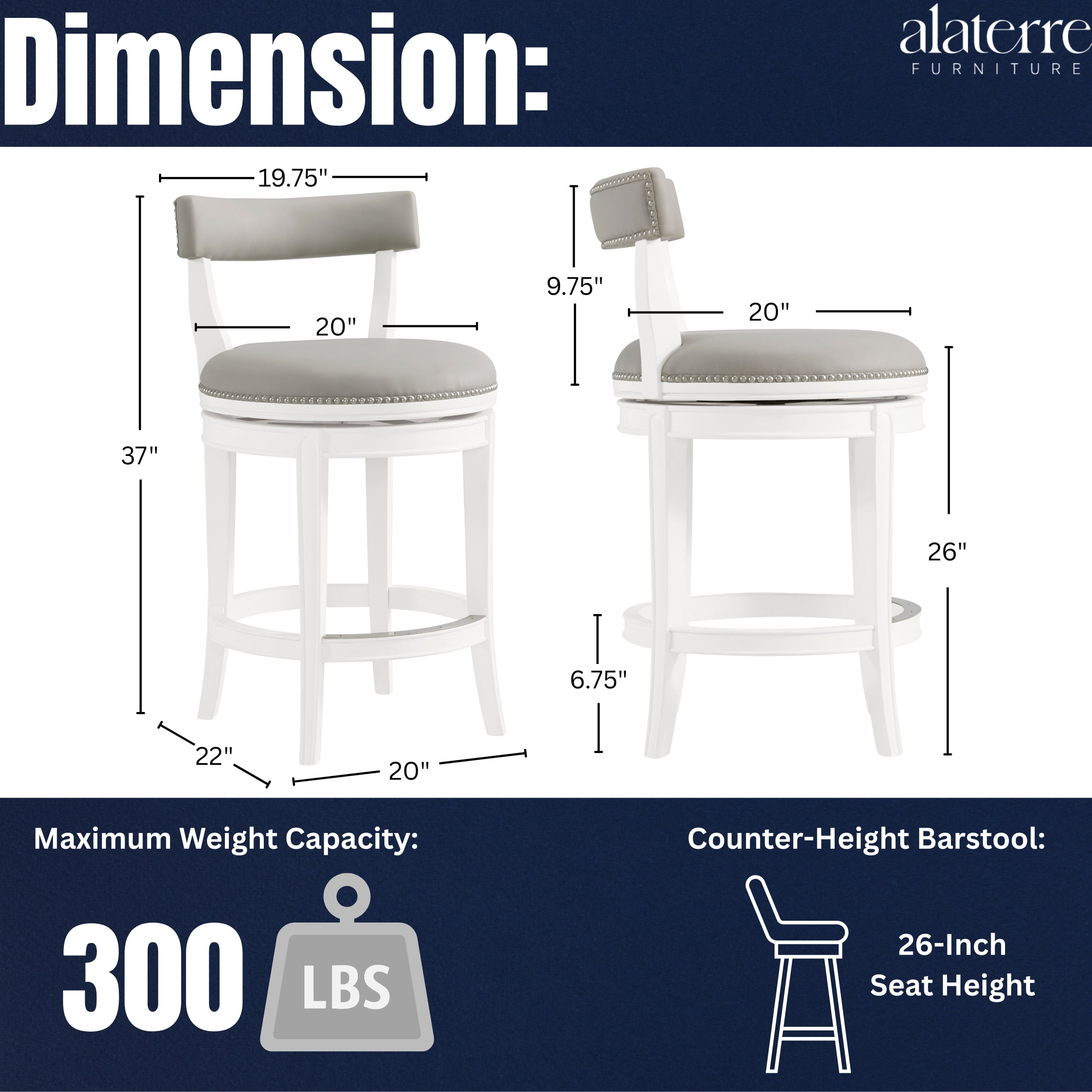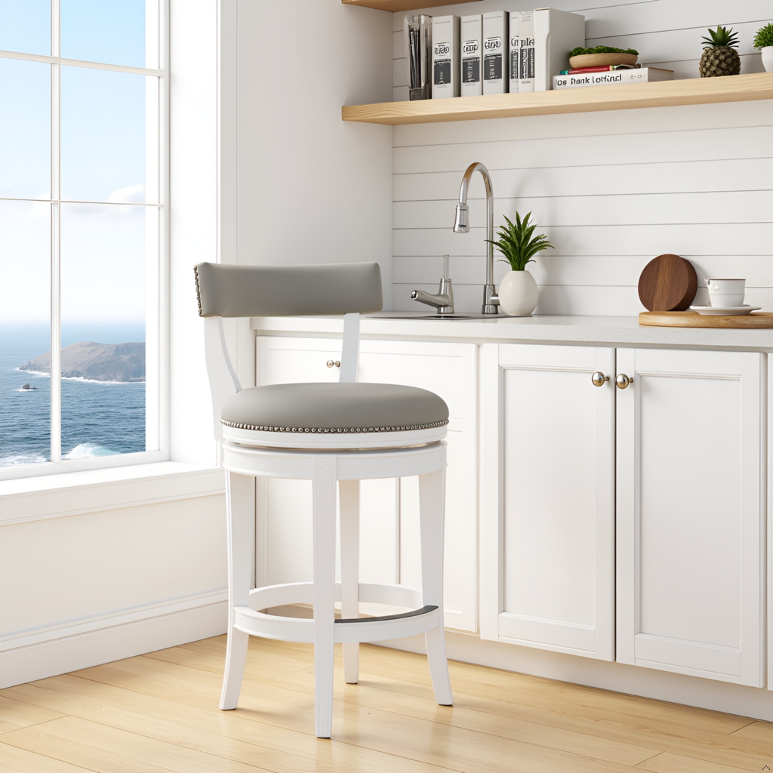 [COMFORT AND STYLE] Features a plush, foam-padded seat and back upholstered in faux leather with elegant nailhead trim; the curved back design enhances comfort, making it ideal for extended seating in kitchens, dining areas, or bars [SWIVEL AND RETURN FUNCTIONALITY] Equipped with a steel memory return swivel mechanism that smoothly rotates and returns the stool to its original position; ideal for bar and counter settings where easy guest interaction is key [ROBUST AND DURABLE CONSTRUCTION] Crafted from solid rubberwood, known for its strength and longevity; ensures stability and durability for daily use in your home’s dining or bar area [ADJUSTABLE AND VERSATILE DESIGN] Available in both bar and counter heights; easily adjust to fit your space whether in a kitchen, dining room, or bar setting; choose from chic white and gray or the classic weathered brown and beige to match your decor [OPTIMAL DIMENSIONS FOR COMFORT] This counter-height chair features dimensions of 20″ W x 22″ D x 37″ H, with a seat height of 26″. It’s ideal for kitchen islands, bars, and dining areas, offering comfort and usability