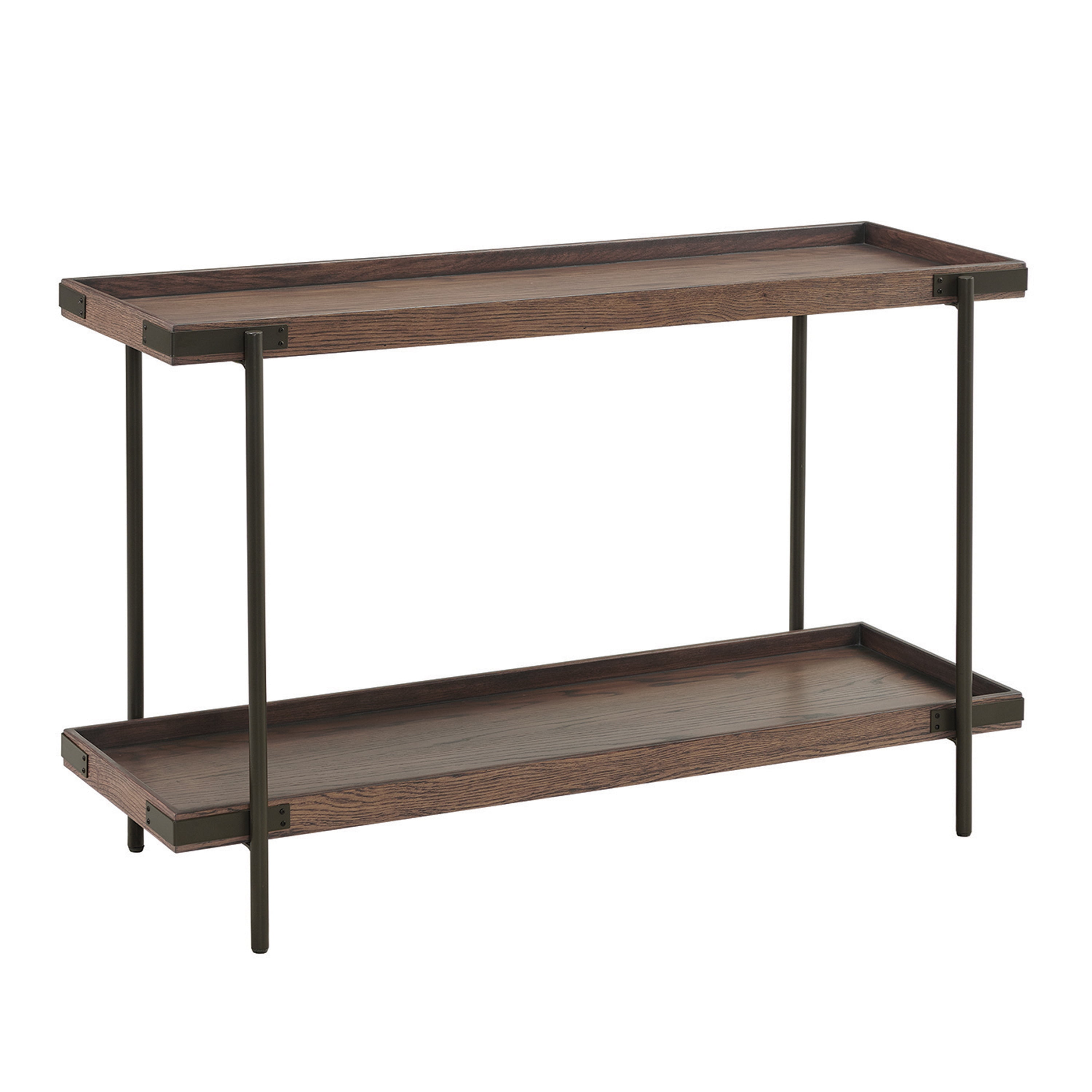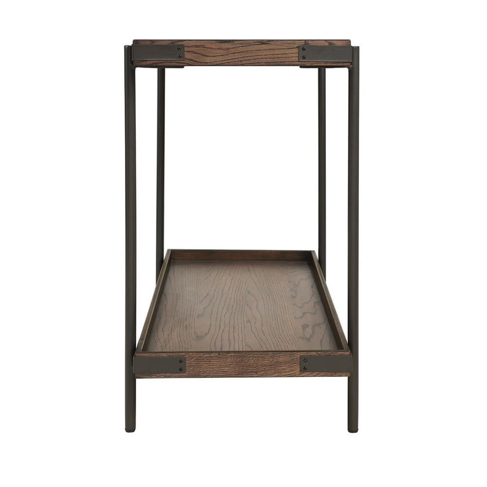 [DESIGN AND FUNCTIONALITY] Combines rustic oak wood tray tops with sturdy metal legs for a durable and stylish addition to any living room; ideal as a sofa table, media console, or entryway table [SPACE-SAVING DIMENSIONS] Measures 48″ W x 18″ D x 30″ H; perfectly sized to fit behind sofas or against walls without overwhelming your living space; includes a spacious lower shelf at 21.25″ H for additional storage or display [ENHANCED STABILITY AND CLEARANCE] With a 5″ clearance from the floor to the shelf, this piece allows easy cleaning and storage of items like shoes or baskets. Its metal legs ensure long-lasting support and stability for everyday use [SEAMLESS STYLE INTEGRATION] Blends industrial and rustic elements; this console table features a solid oak wood top with metal accents, making it a versatile choice for living rooms, entryways, or as a TV stand [COLLECTION VERSATILITY] Offers a cohesive look with other matching tables from the same collection; ideal for creating a harmonized furniture setup in your living room, enhancing the rustic-industrial theme throughout your home