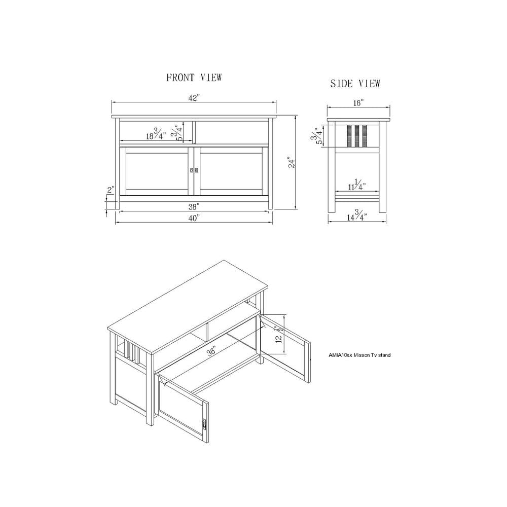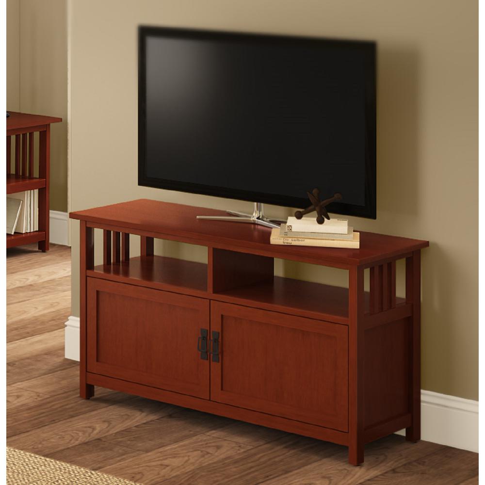 [VERSATILE STORAGE] This Mission TV stand has two glass doors that open to reveal a spacious interior, perfect for storing gaming supplies, videos, and more [MEASURES] Dimensions: 42″ W x 16″ D x 24″ H with open compartments 18.75″ W x 11.25″ D x 5.75″ H [STURDY MATERIALS] Constructed of wood, composite wood, and wood veneer, it is sure to last through years of use [CLASSIC DESIGN MEETS MODERN FUNCTIONALITY] Elevate your living room with the Mission TV Stand; features a rich Cherry finish, glass doors, and ample storage for media devices; easy assembly included [CARE] Wipe clean with a dry cloth for easy maintenance; assembly required