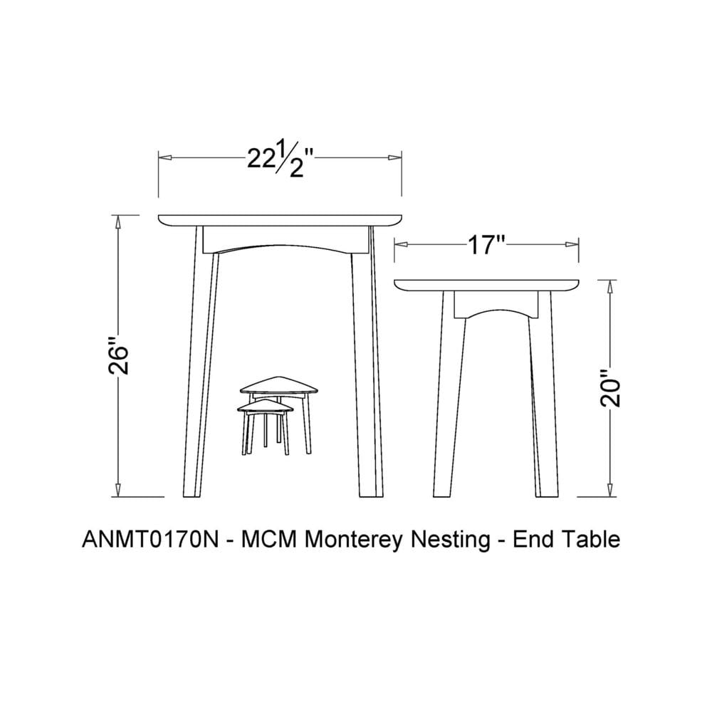[WARM CHESTNUT FINISH] Complete your décor with the perfect accent with this set of two nesting tables in Warm Chestnut finish [TRIANGULAR DESIGN] Stand out with the unique, triangle table top design [NESTING TABLES] Maximize space with the perfect side or accent table for any space [SPACE-EFFICIENT DESIGN] Optimize your living area with these Monterey nesting end tables; ideal for small apartments or tight corners, they easily slide together to free up space when not in use; perfect for accentuating your space [MODERN DESIGN] Enjoy sophistication with a modern take on mid-century design ideal for any living room
