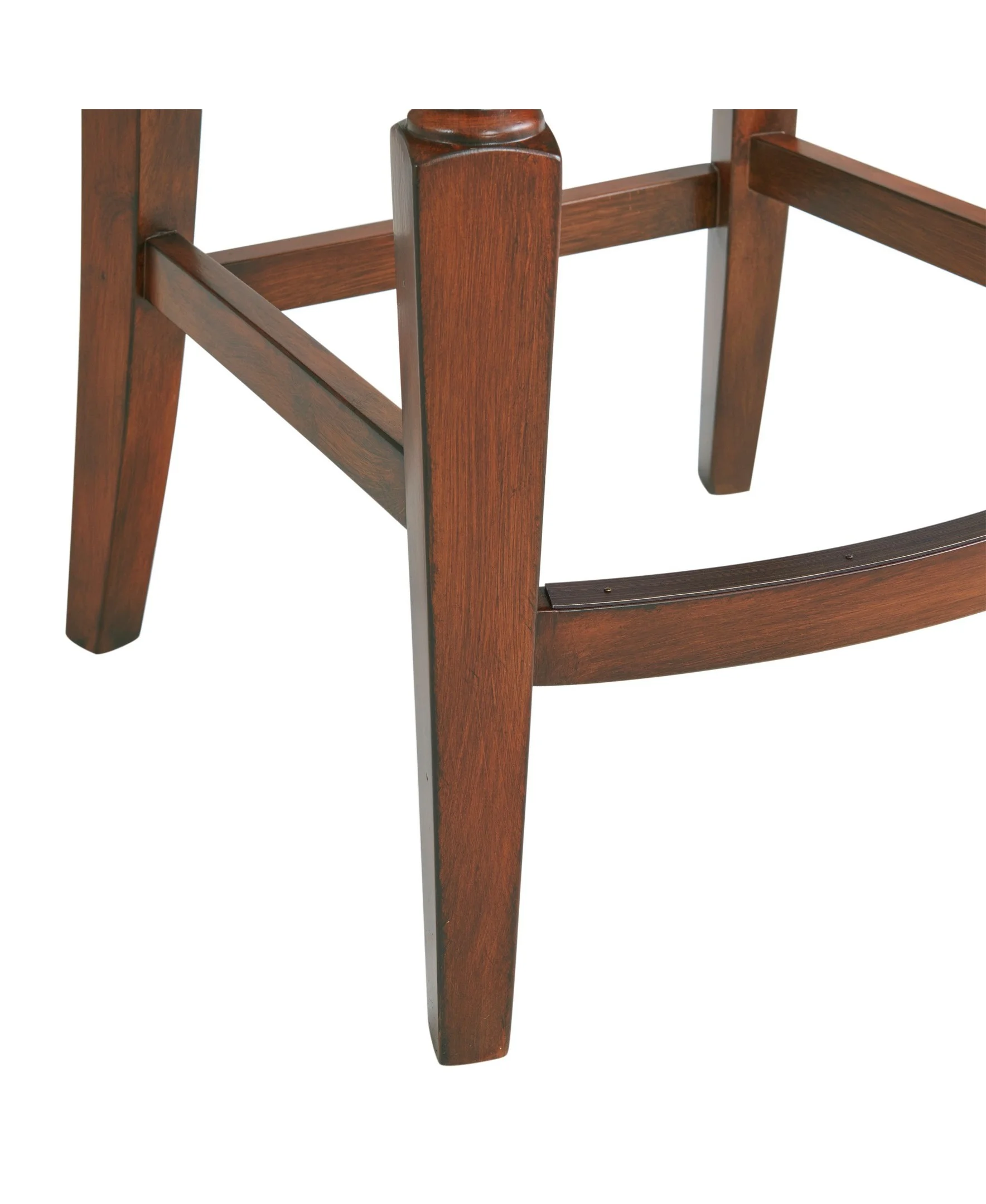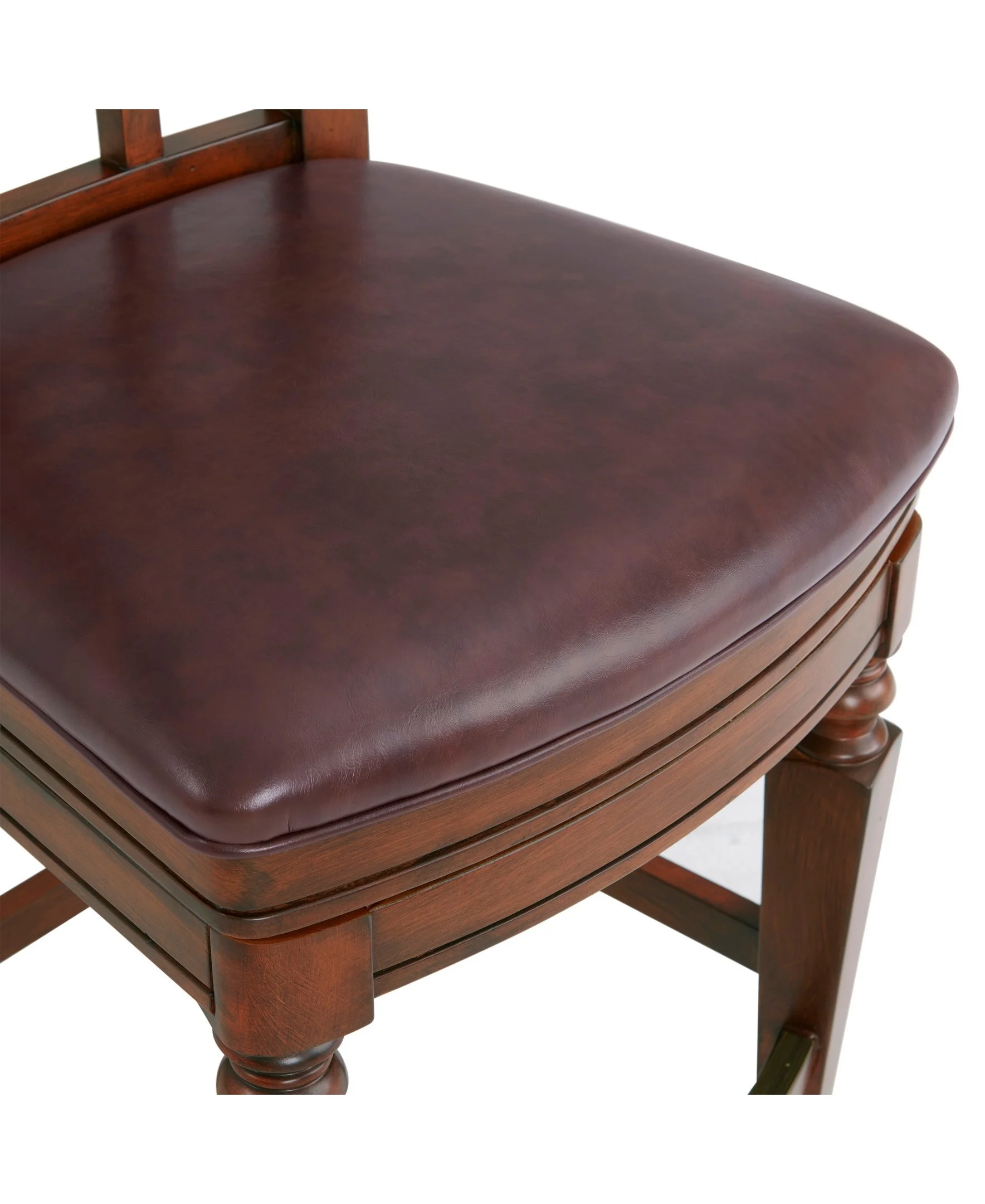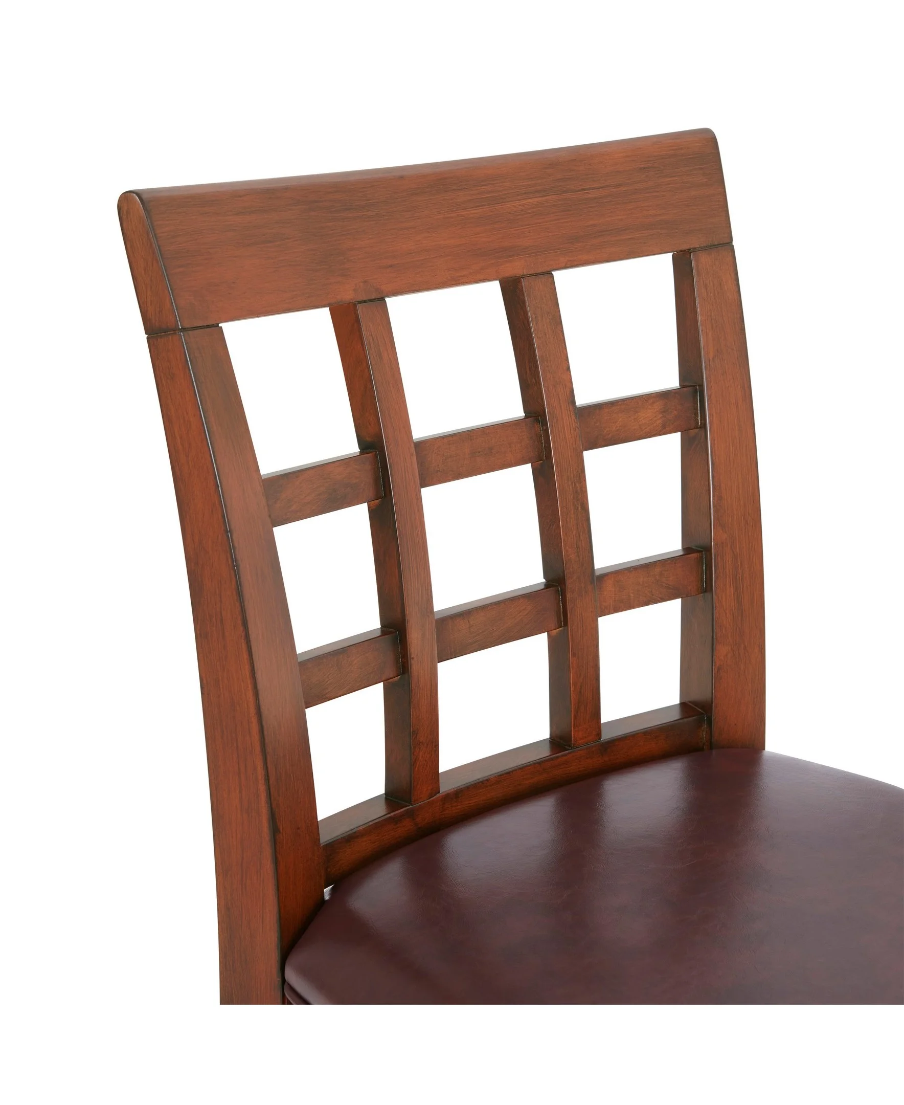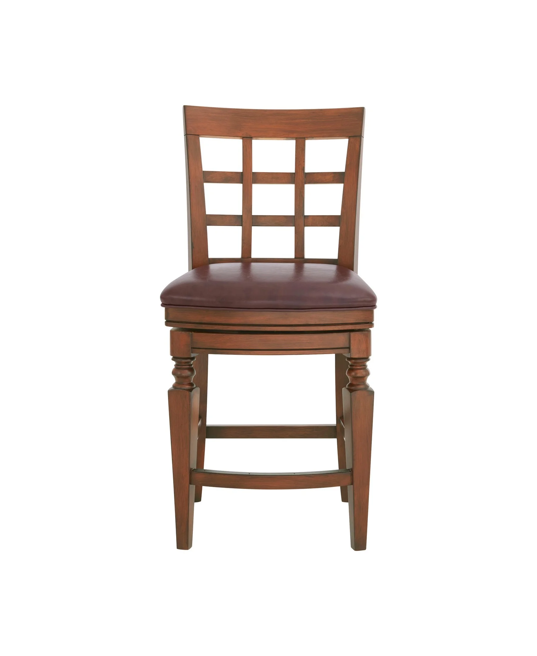 [COMFORT AND ELEGANCE] Faux leather counter-height stool with foam-filled seat and open trellis back. Adds elegance and breathability to kitchen or dining spaces [FUNCTIONAL DESIGN] Equipped with a steel memory return swivel that smoothly rotates and returns to its original position; ideal for pub tables and kitchen counters, enhancing user convenience and comfort [STURDY AND STYLISH CONSTRUCTION] Crafted from solid rubberwood for durability and longevity; features a mahogany finish that adds a warm, inviting look to your bar or dining area; perfect for daily use and adds a classic touch to your space [ENHANCED COMFORT AND ACCESSIBILITY] Offers a counter height design with a seat height of 26 inches, making it easy to align with most kitchen counters and pub tables; includes a footrest positioned 6 3/4 inches from the floor for added comfort [OPTIMAL DIMENSIONS FOR VERSATILITY] Measuring 19″ W x 22″ D x 42″ H with a seat height of 26″, this stool complements kitchen islands and counter-height tables, adding both style and practicality to your dining space