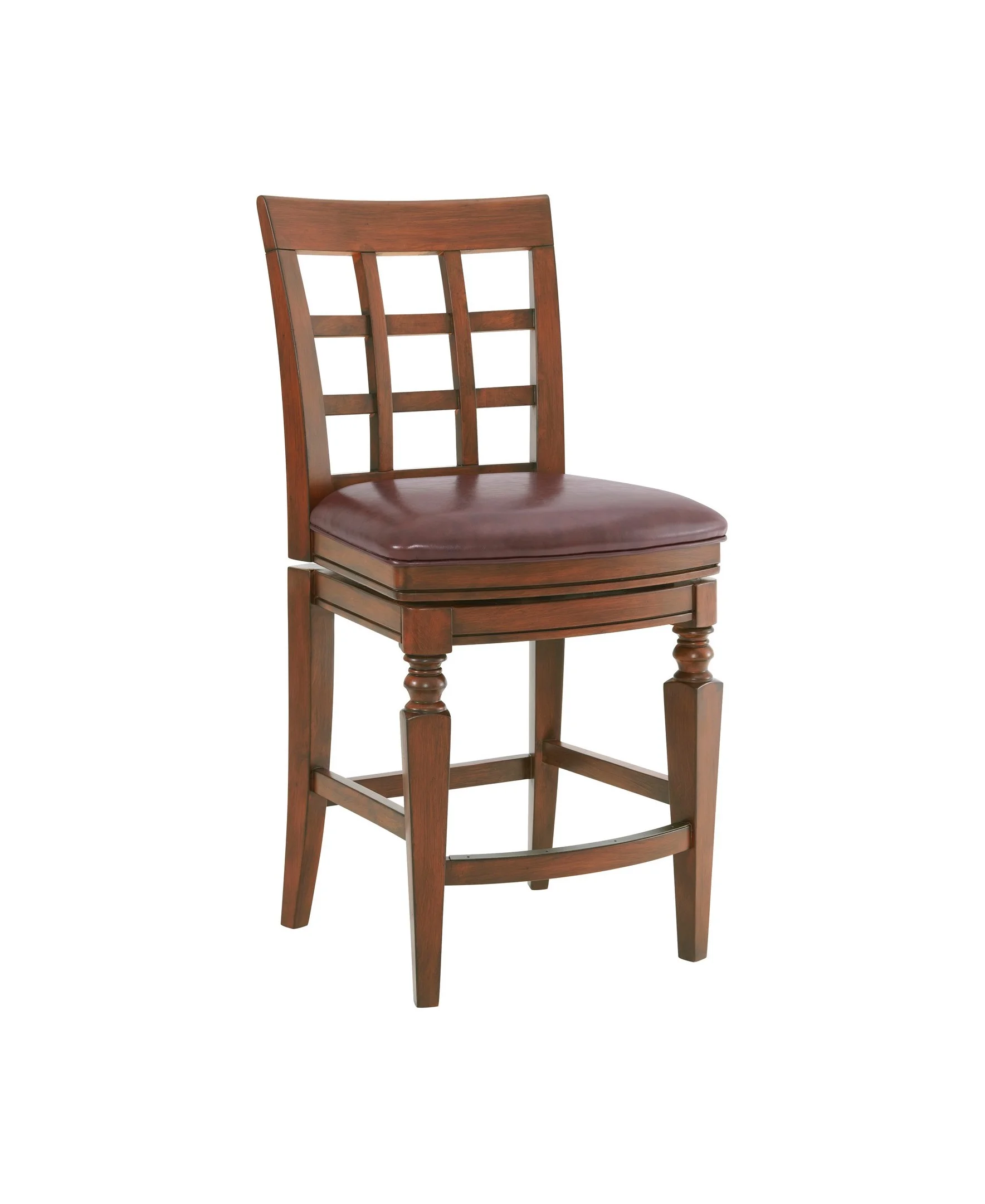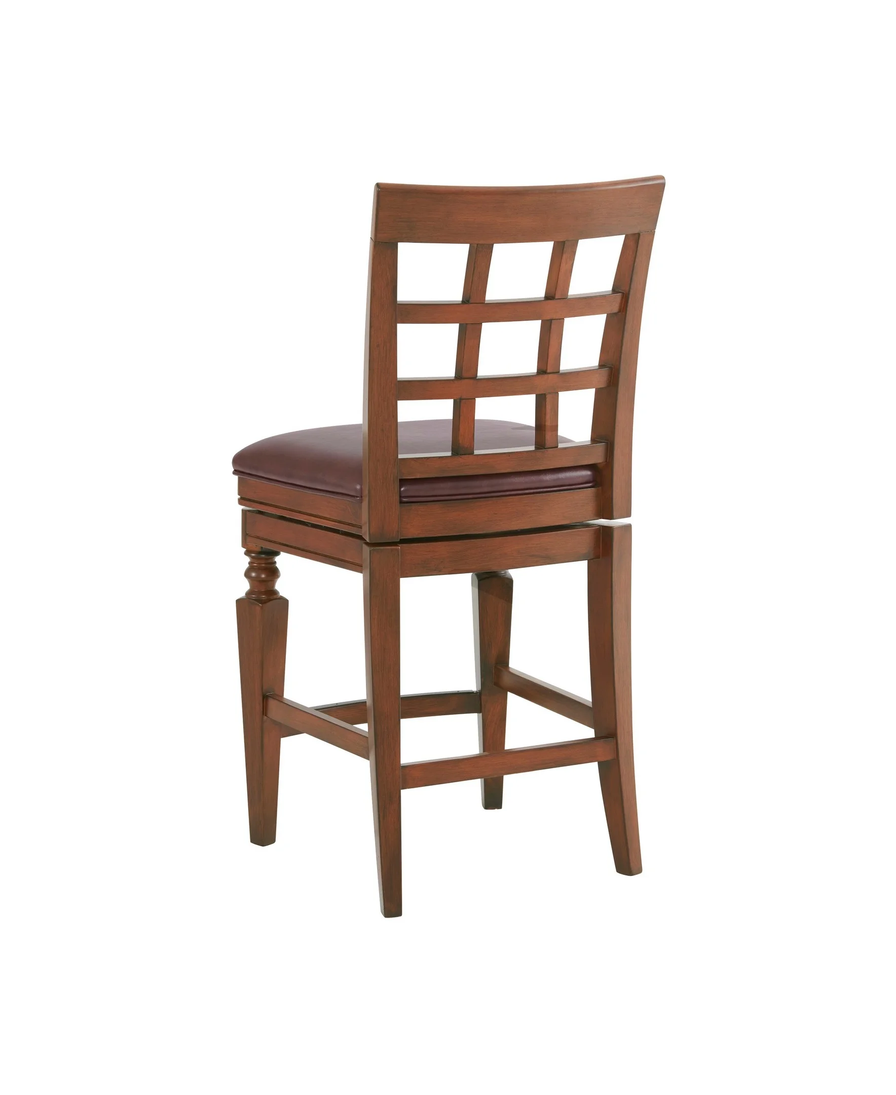 Add elegance to any dining space with this exquisitely crafted counter height stool. The solid rubberwood frame features an open trellis back. Upholstered in faux leather and filled with foam, the seat provides just the right amount of support as you sit. This bar stool features a steel memory return-swivel mechanism, bringing your stool to its original position after removing static weight.