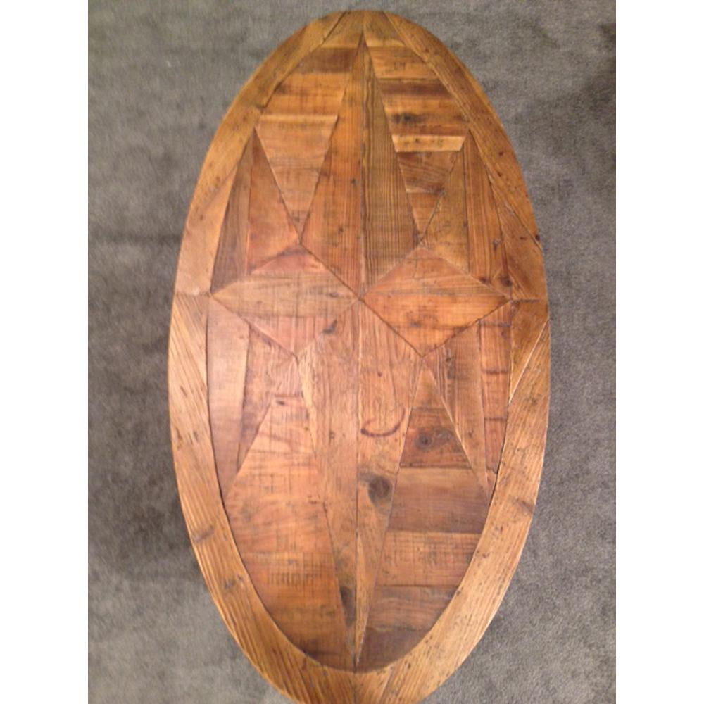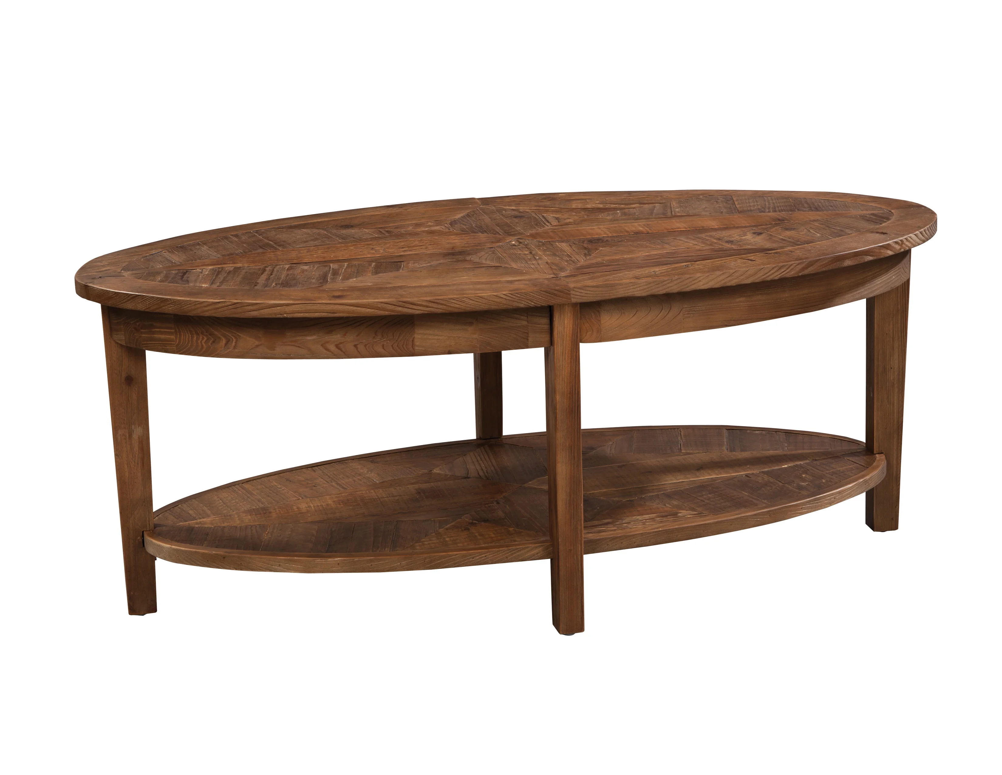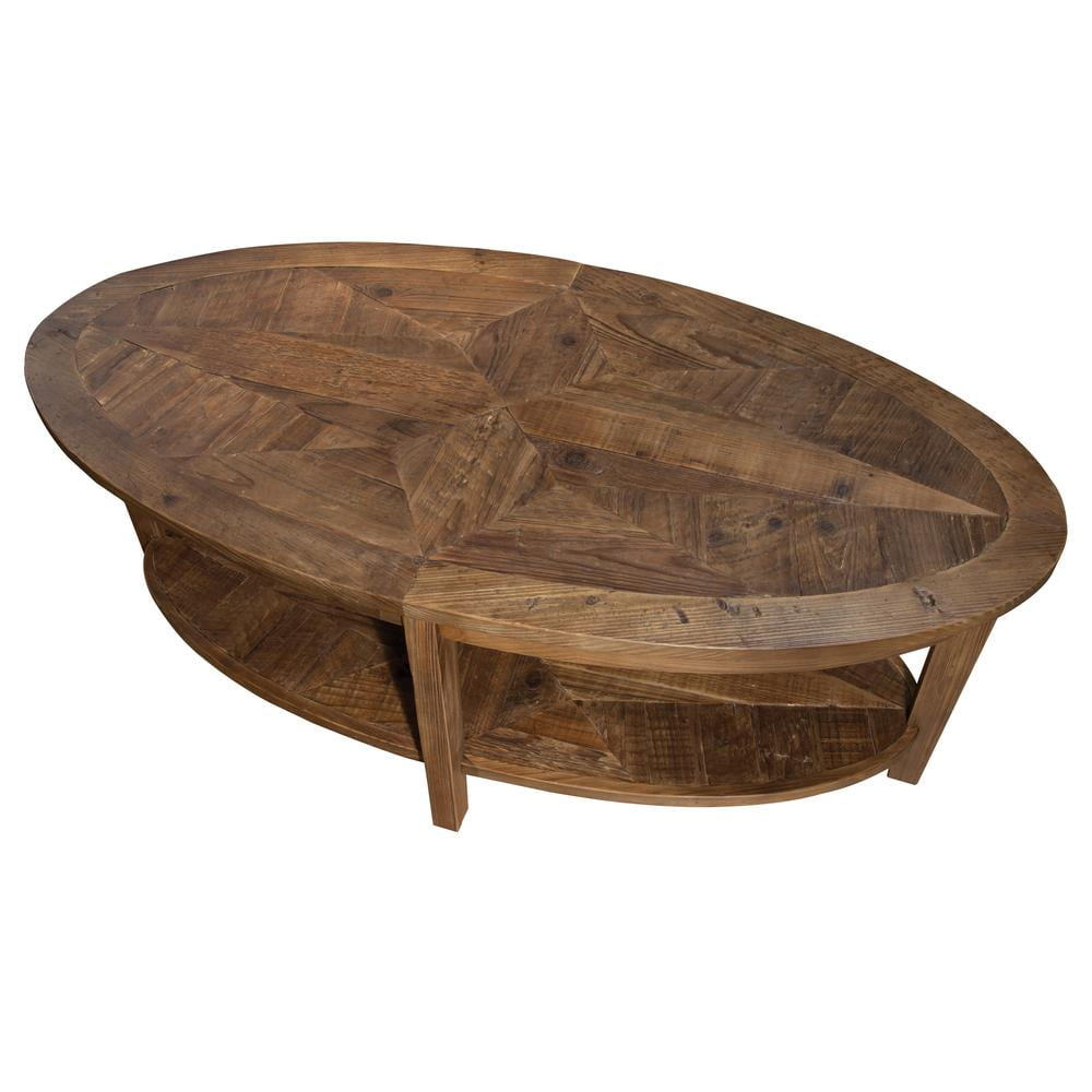 Revive Collection of resourced wood furniture features handcrafted design and a reduced impact on the environment. Resourced wood wears its history proudly and is long lasting. The lacquer finish allows each piece to show its natural wood knots, cracks, and grain. Beautiful detailing in the wood is a surprising feature. This large oval coffee table features one lower shelf for additional storage or display space.