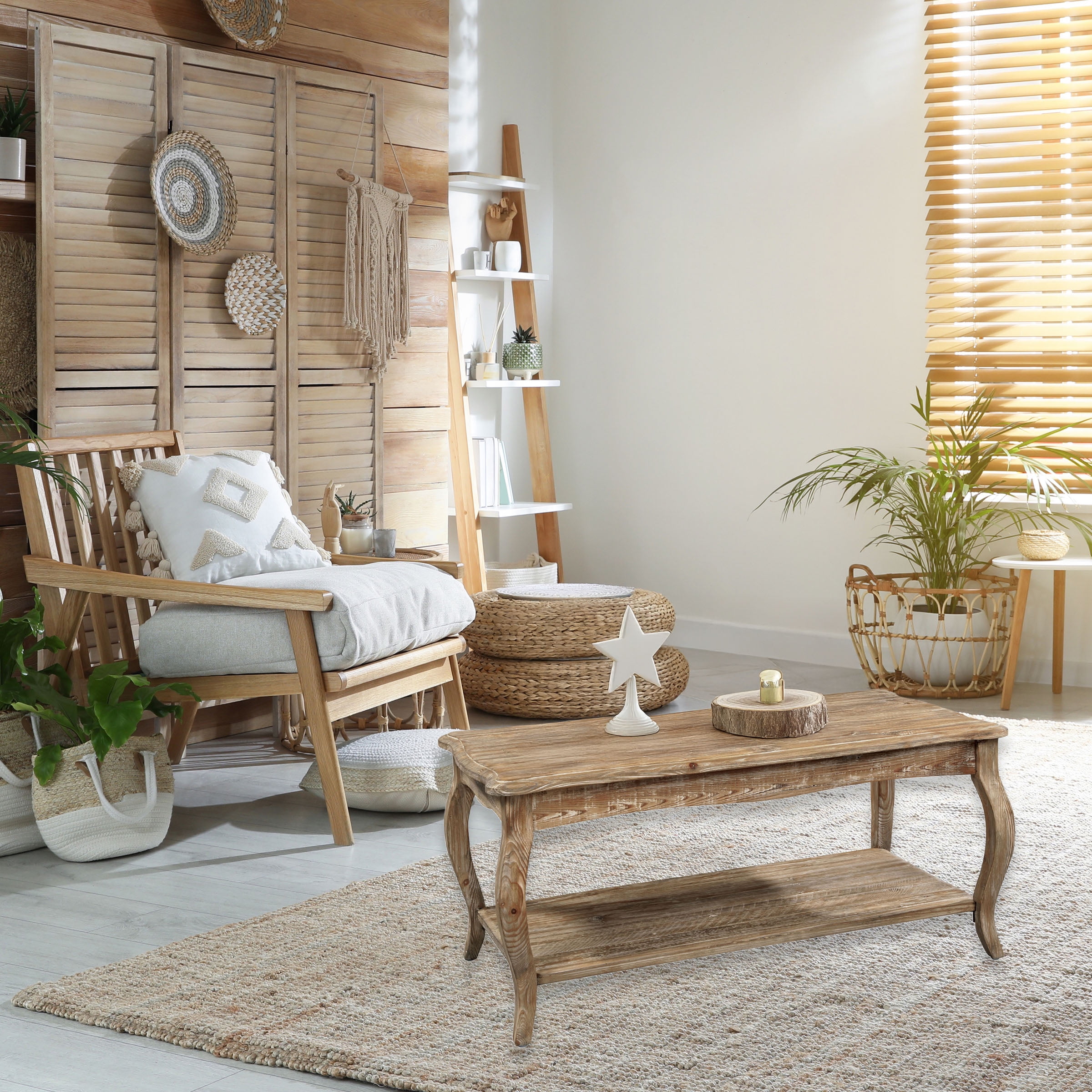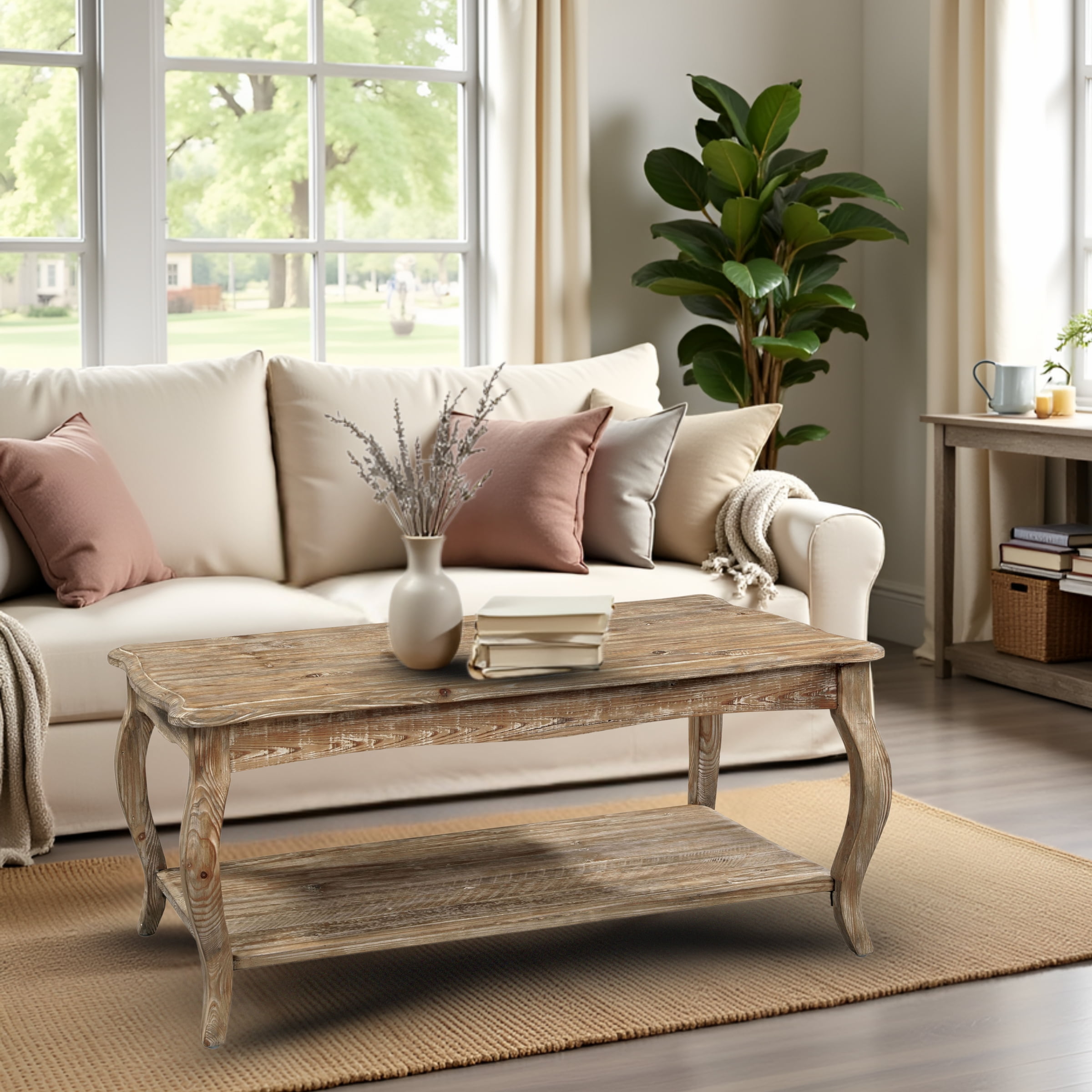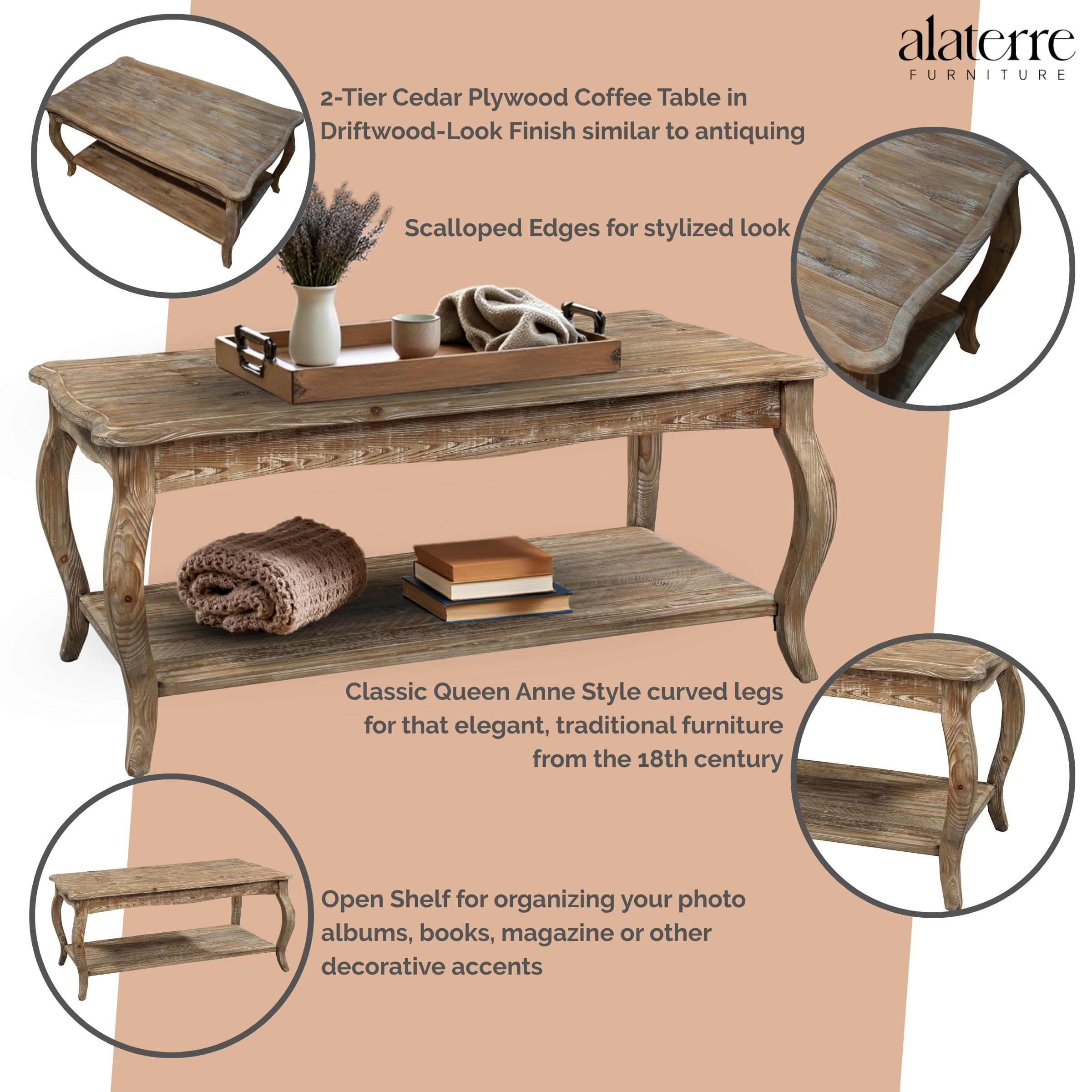 Alaterre Furniture Rustic Coffee Table with Open Shelf, Driftwood Natural Finish, Accent Furniture for Living Room, Curved Legs, Assemble Required