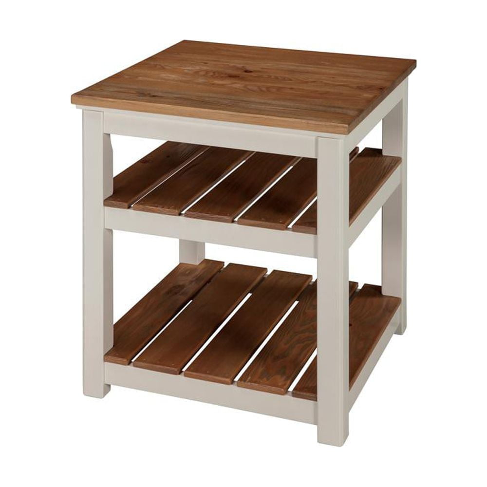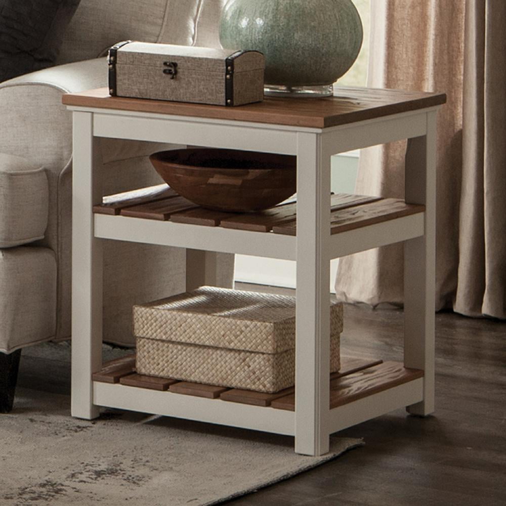[FASHIONABLE & PRACTICAL] Savannah End Table with two shelves, crafted from pine wood with a natural top and ivory legs. Ideal for coastal, cottage, or farmhouse decor [COMPACT STORAGE] The end table measures 21″ W x 21″ D x 24″ H, with two slat shelves offering additional storage; the space between the top and first shelf is 5.25″ inches, and between the second shelf and bottom shelf is 10″ inches [EASY ASSEMBLY] This end table comes with an easy-to-follow assembly guide; all hardware and included tools are provided, and assembly take minutes [EFFORTLESS INTEGRATION] The Savannah 2-Shelf Square End Table blends with any living room; its cream pine finish complements decor while providing a spot for lamps and drinks [STYLE] With its modern, timeless style, this table is perfect for use as an end table, side table, or nightstand. A great budget option for clearance end tables