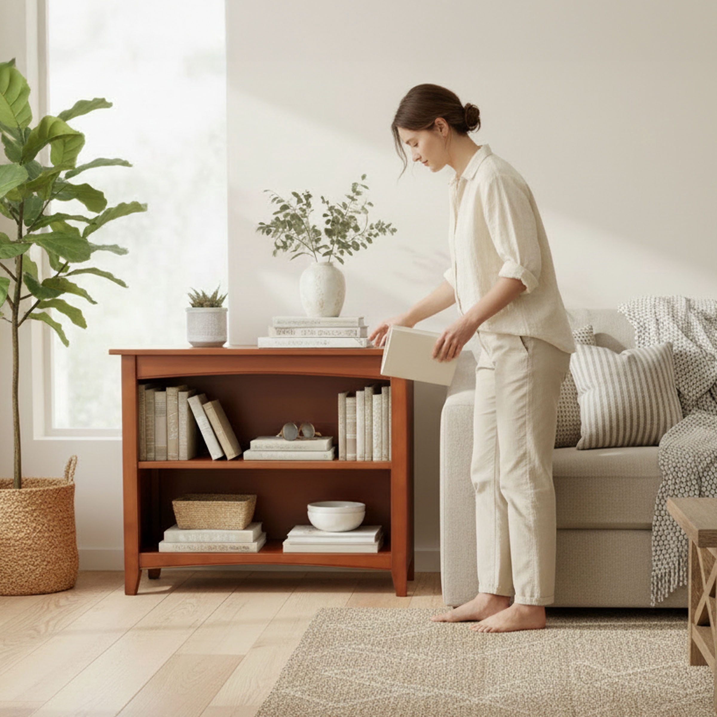 MODERN DESIGN – Alaterre Furniture Shaker Cottage bookcase with 2 shelves provides modern storage solution featuring timeless modern Shaker styling STURDY CONSTRUCTION – Built with select hardwood and composite wood; assembly required for a sturdy frame perfect for any room VERSATILE ORGANIZATION – Practical use in the living room, office, kid’s room, or play area with adjustable shelf useful for items of various sizes TRANSITIONAL CHARM – Elevate your space with the Shaker Cottage Bookcase; features a rich cherry finish that complements any decor; ideal for displaying books and decor EASY MAINTENANCE – Wipe clean with a dry cloth for easy maintenance and compatible with the Shaker Cottage Desk and Tall Bookcase
