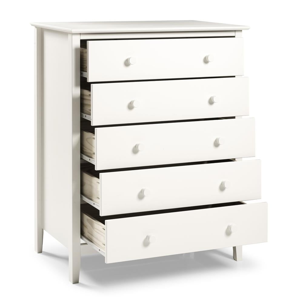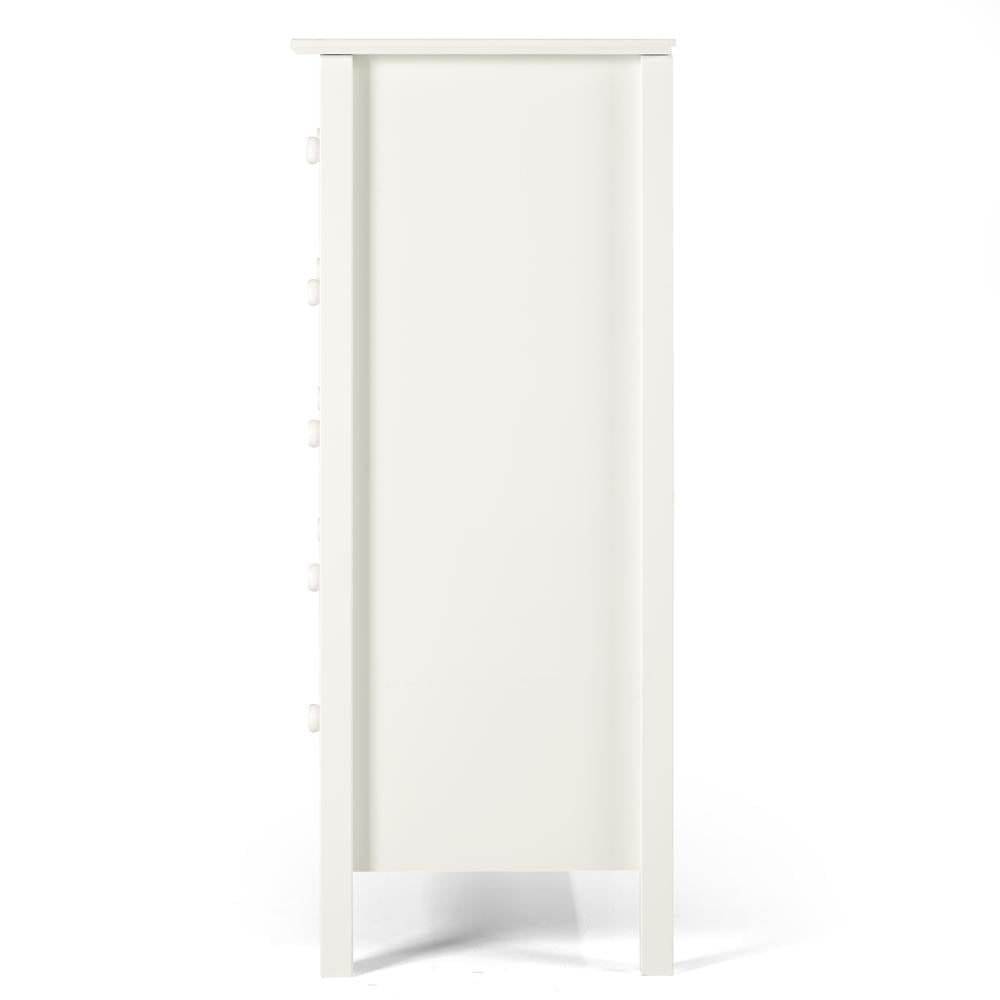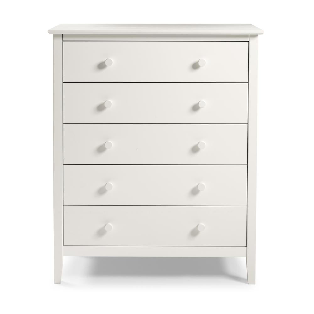 [CONSTRUCTION QUALITY] Crafted from high-quality Brazilian Pine and pine veneers for durability and longevity; ideal for daily use in kids’ bedrooms or guest rooms [STORAGE SOLUTION] The 5-drawer chest with wooden knobs and smooth metal glides offers plenty of storage for clothes and accessories, making it perfect for organizing kids’ rooms or guest spaces [SAFETY ASSURED] Meets stringent anti-tipping standards to ensure safety in kids’ bedrooms; includes an anti-tipping strap kit for added security and peace of mind; designed to protect young ones in active play environments [SEAMLESS STYLE] The Simplicity Wood 5-Drawer Chest in white complements any bedroom decor [EASY ASSEMBLY] Comes with all necessary hardware and clear instructions for quick setup; designed for hassle-free assembly, making it a convenient addition to your child’s bedroom or a compact guest room