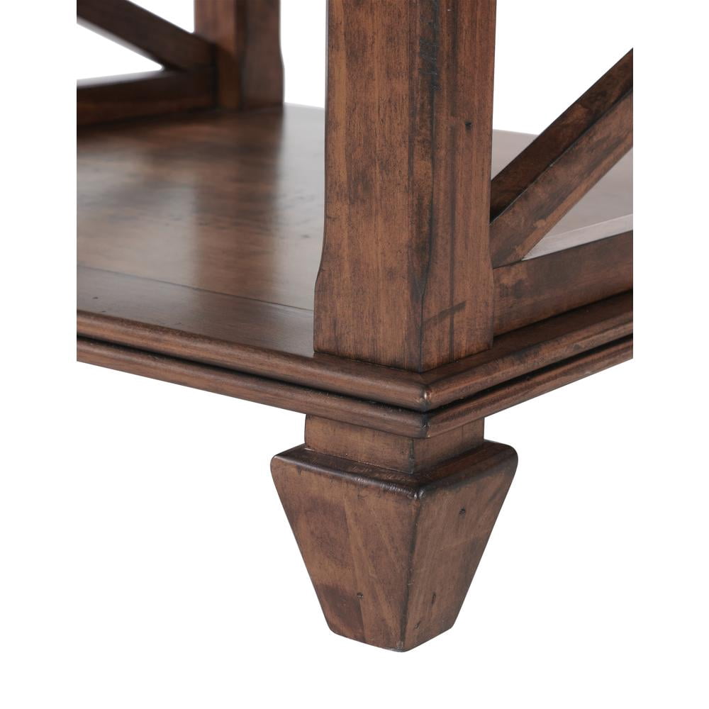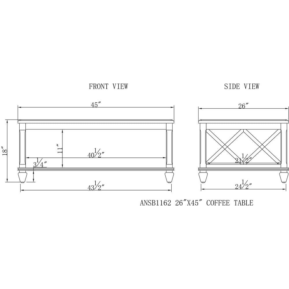 Open side panel design gives a relaxed feel to this timeless collection; the wood’s natural grain, knots, and other imperfections add to the character of the piece. Coffee Table: 45″ L X 26″ D X 18″ H Shelf is 40″ W x 21″ D x 11″ H Distance between table legs: 40″ Distance from floor to bottom of table: 3.25″ Pair with matching tables in this collection Wipe clean with a soft dry cloth Extra shelf included for display Nylon floor levelers Easy to assemble Suggested weight capacity: 150 lbs