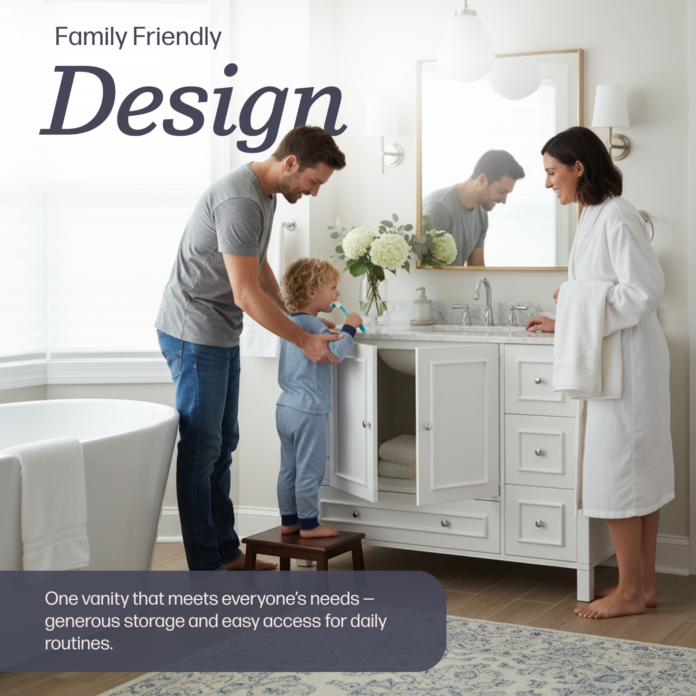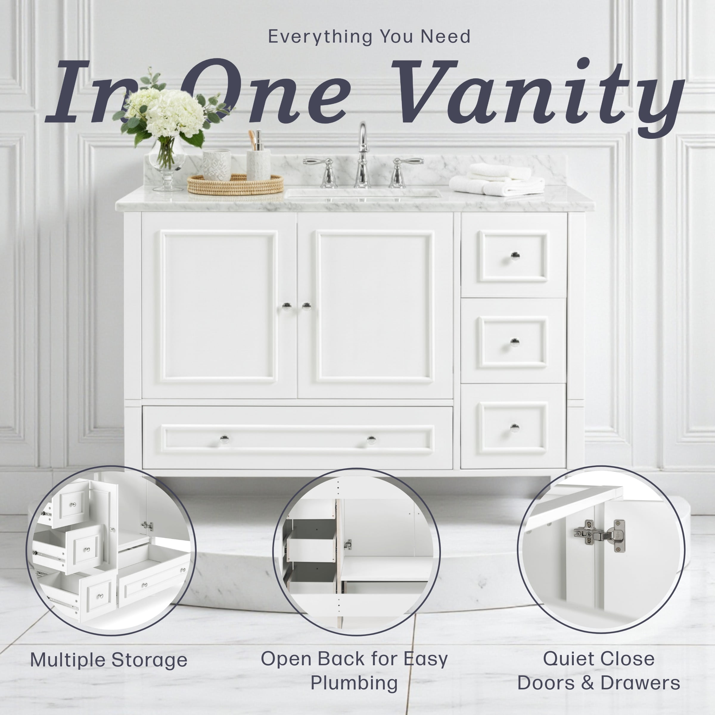 Overall dimensions: 48″ W x 21 1/4″ D x 34″ H Large bottom drawer dimensions: 24 1/3″W x 15 3/4″D x 4 1/4″H; 3 side drawer dimensions: 9″W x 15 3/4″D x 4 1/4″H Interior cabinet dimensions: 32 3/4″W x 19 1/3″D x 21 1/2″H Soft-close drawers, polished nickel hardware, adjustable height levelers Free standing vanity is seated on the floor providing a functional design that doesn’t overwhelm the space; Distance from floor to the bottom of the cabinet: 3 15/16″ H Faucets, sinks, and countertop not included Cabinet offers generous space for linens, toiletries, or other bath essentials Accommodates a 49″ W x 22″ D vanity top with 1 center-set basin (sold separately) Partial open back to allow easy access for plumbing Painted white finish fits in perfectly with most design styles Recommended weight capacity: 200 lbs