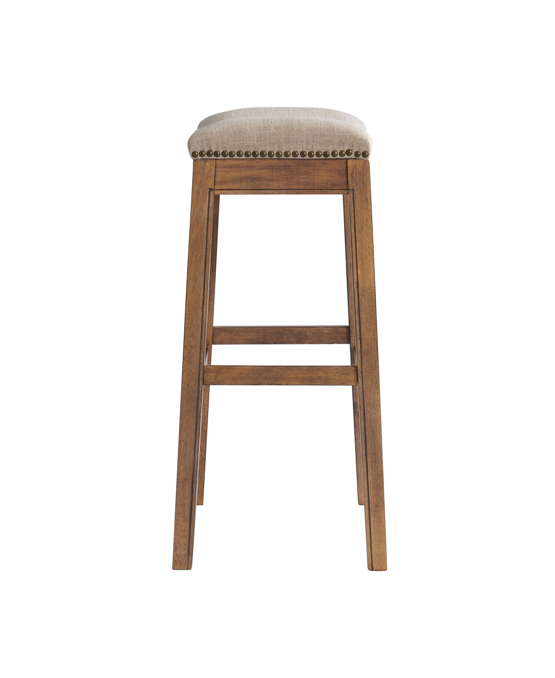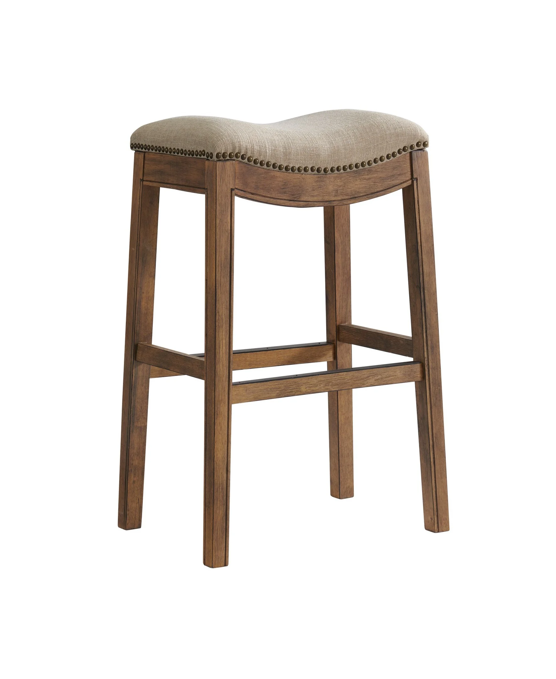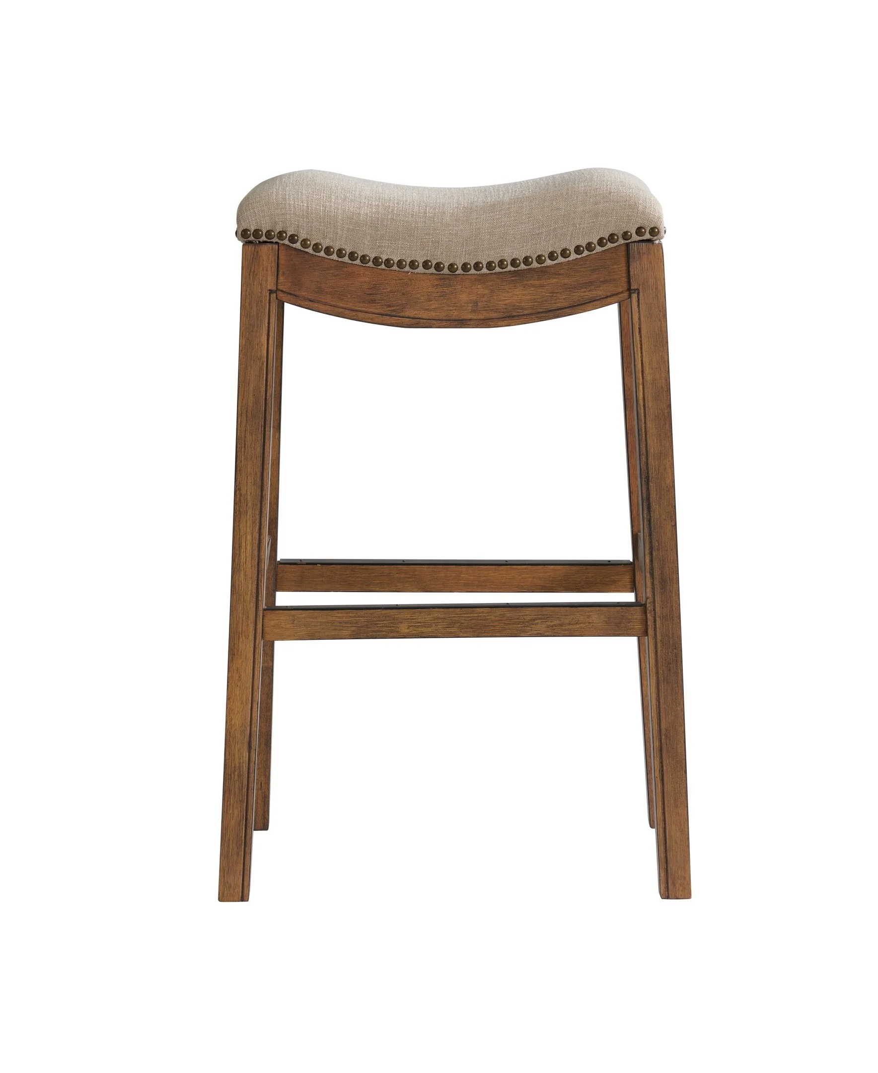 Add a touch of style to your home with this classic bar height stool. The legs are made from rubberwood for extra durability. The backless saddle seat is lined with nail head trim, while cushioned padding provides extra support when you need it most. Stretcher bars between the legs provide stability and comfort, and a metal kick plate protects the footrest from wear. This piece of furniture will put the finishing touch on your bar, kitchen island or tall bistro table.