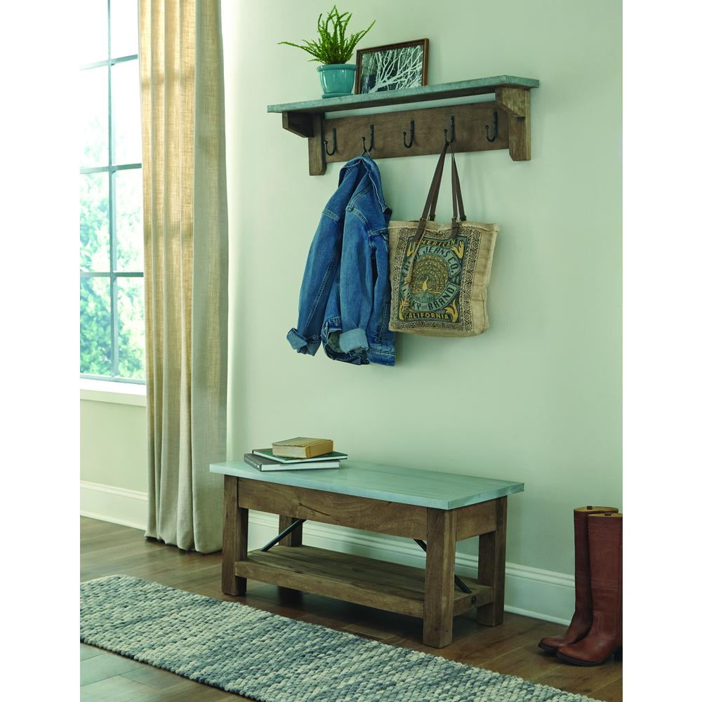 Zinc metal mixed with wood and antique iron hooks lends modern industrial style to your living space. This stunning coat hook offers a balance of sturdy and solid with the lightness of the zinc metal tops. Unique design for your space. Bench has lower shelf storage for shoes, baskets or any small items that need extra space. Perfect for entryway, mudroom or laundry room. This coat hook and bench set is sure to make an impact in your entryway or mudroom. Pair with other pieces in the collection to create the perfect living space!