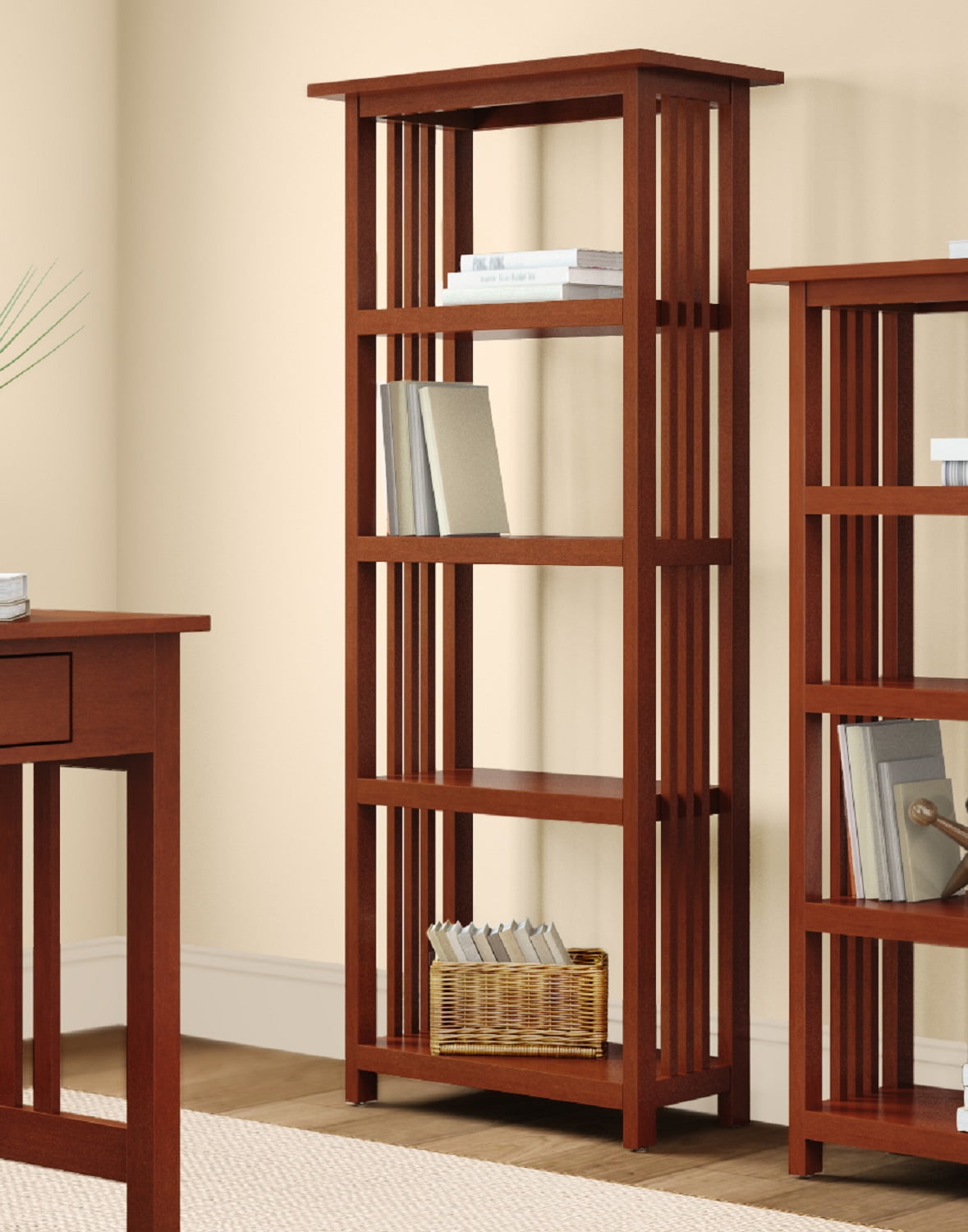 [STORAGE AND STYLE] 24″ Mission-style bookcase with four shelves, perfect for storing books or decor. Rich Cherry finish coordinates seamlessly with the Classic Mission collection [FUNCTIONAL ELEGANCE] Enhance your living space or office with the Mission 60″ Bookcase; crafted from select hardwoods with a timeless cherry finish; each shelf supports up to 50 lbs, perfect for books, collectibles, or office essentials [DECOR VERSATILITY] The Mission 60″ Bookcase, designed to fit under windows or in small nooks, adapts to various room settings. Its arts-and-crafts styling adds charm to living areas and home offices [CRAFTSMAN DETAILING] The Mission 60″ Bookcase features a beautiful Cherry finish, perfect for displaying or storing books and decor, blending utility with style [STURDY AND SPACIOUS] The Mission 60″ Bookcase is designed to hold up to 50 lbs per shelf, making it perfect for heavy books or large decorations while enhancing any space with its elegant Cherry finish
