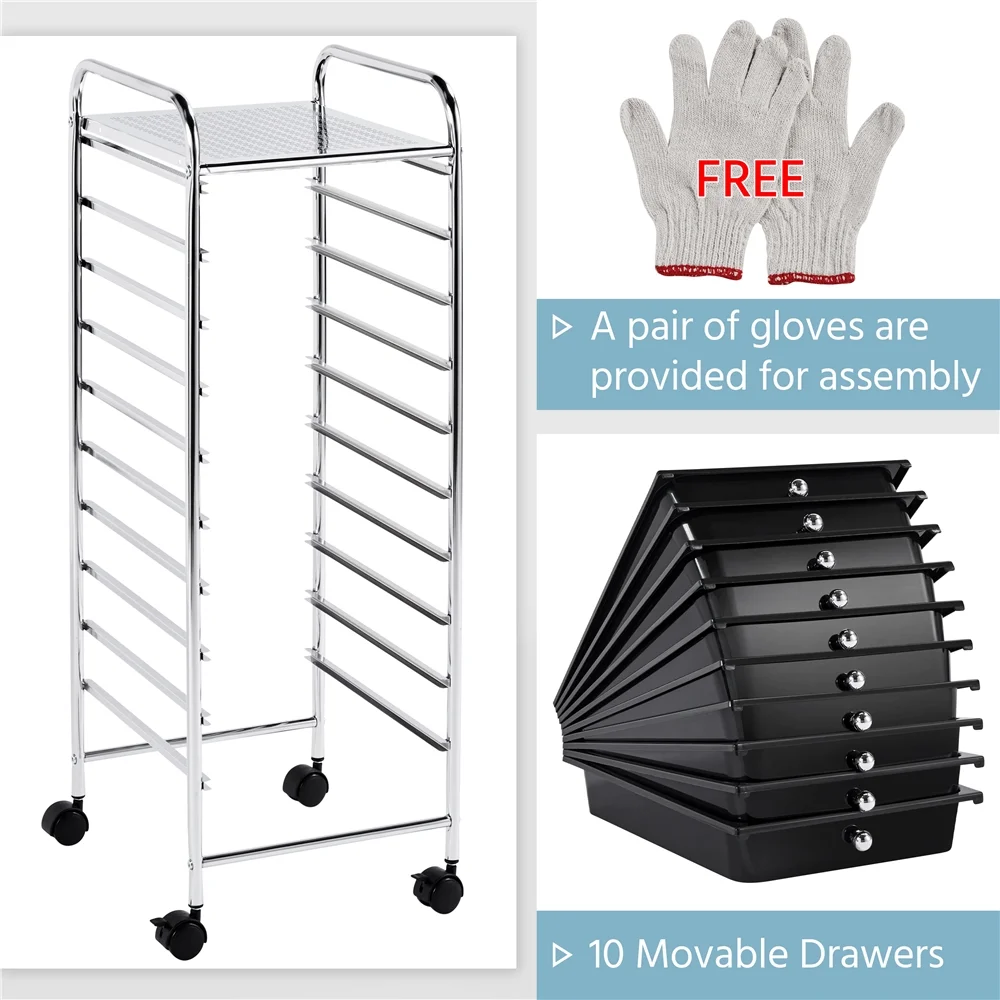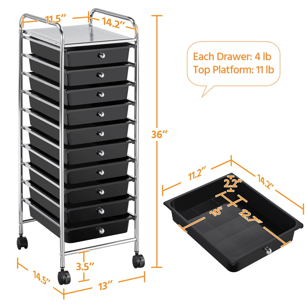 Color: black; Drawer Quantity: 10; Material: Steel. PP Dimension: 32 x 36.5 x 90.5 cm/ 13 x 14.5 x 36ââ (L x W x H) Drawer: 36 x 28.5 x 6 cm/ 14.2 x 11.2 x 2.4ââ (L x W x H) Bearing: each drawer:2 kg/ 4 lb; top platform: 5 kg/ 11 lb G.W.: 5 kg/ 11 lb N.W.: 4 kg/ 9 lb Note: Please allow ± 1 cm error due to manual measurement. Please do not place items which exceed the max. weight capacity of this storage cart.