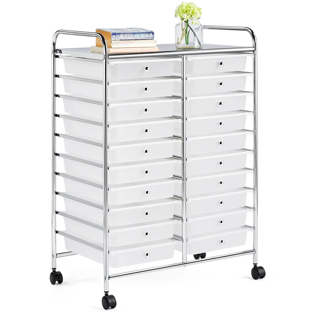 This 10-drawer storage trolley is arranged on 4 360° wheels, wherein, 2 of them are lockable, ensuring both flexibility and stability. The smart design of the 10 vertically aligned drawers makes full use of limited space, allowing users to store different items separately. Besides, each of the drawers can be removed separately, therefore, you can use them independently as single storage boxes or install them back after organization.
