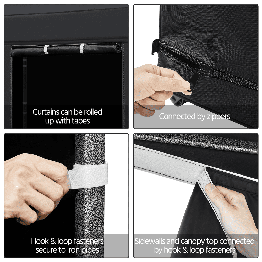 Specifications: Material: Steel, nylon plastic, 500D oxford cloth, PU coating, and polyester cloth Color: Black Overall size: 300 x 300 x 323-341cm (L x W x H); Window size: 91 x 85cm (W x H); Curtain size: 90 x 85cm (W x H); Sidewall size: 300 x 203cm (W x H); N.W.: 26.2kg; G.W.: 28.4kg Overall size: 118 x 118 x 127-134.5inch (L x W x H); Window size: 36 x 33.4inch (W x H); Curtain size: 35.4 x 33.4inch (W x H); Sidewall size: 118 x 80inch (W x H); N.W.: 57.7lb; G.W.: 62.6lb Note: Please allow ±1cm/0.5inch error due to manual measurement.