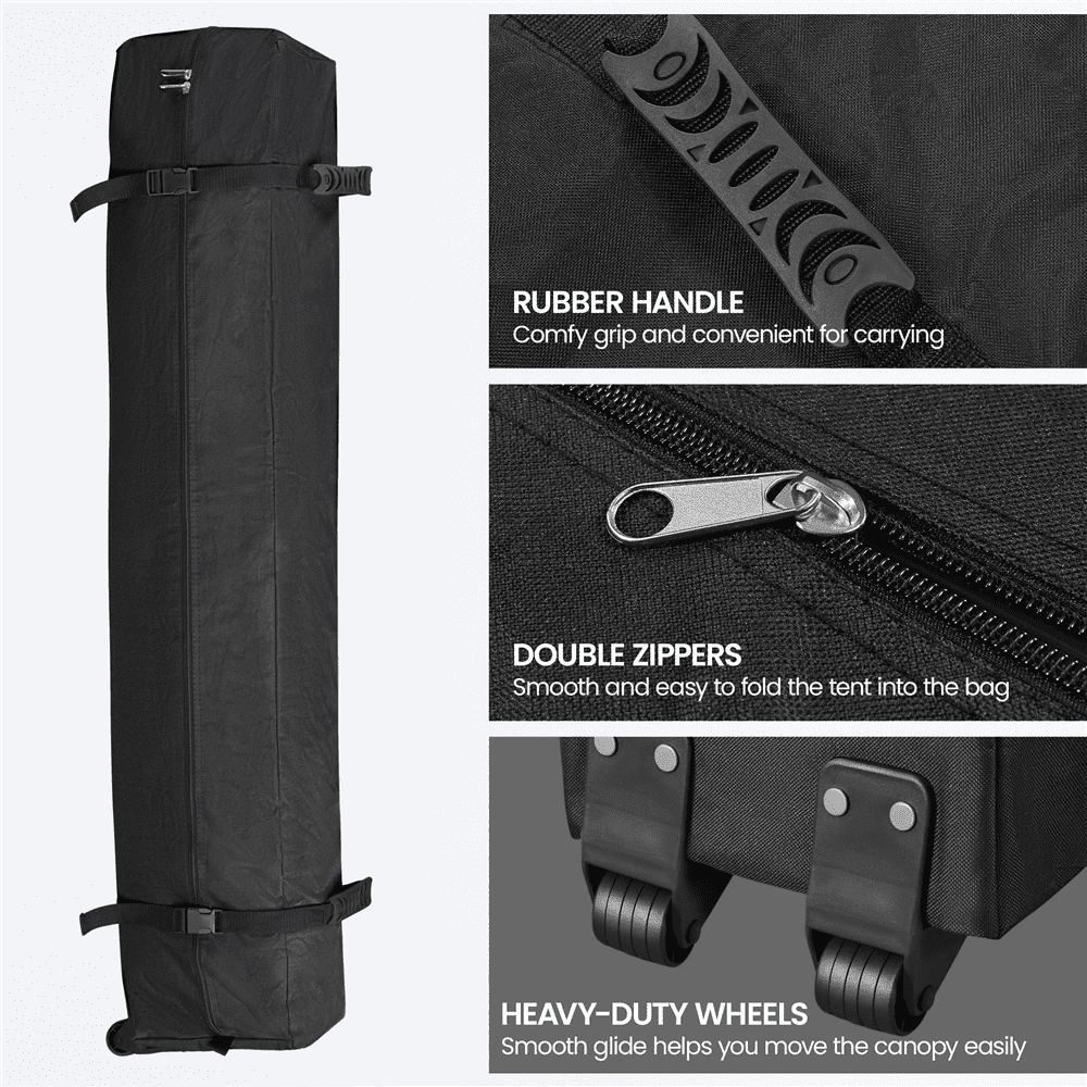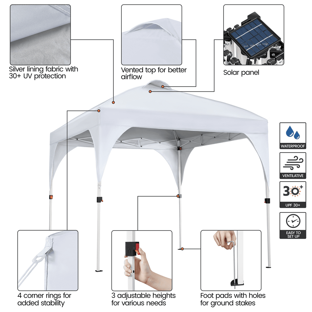Ready to protect you from the direct sunlight and unpleasant heat, this 10ft × 10ft pop-up canopy tent is a perfect shelter for garage sales, backyard/beach parties, group tours, weekend markets, and commercial events. Made of UPF 30+ polyester oxford fabric with silver lining and powder-coated steel bracket, this canopy boasts high weather resistance and strength. The 17 LED lights on the roof is the highlight of this outdoor tent. The built-in LED lights are powered by a solar panel or a power bank (not included), and the brightness and on/off switch can be remotely controlled. Besides that, the adjustable tent height is also a plus. You can easily adjust the height from 8.3′ to 9′ in 4″ increments by the snap buttons on the legs. Best of all, this cost-effective canopy tent set comes with a rugged roller storage bag, 4 anchor ropes, 8 metal ground anchors, and 4 sandbags.
