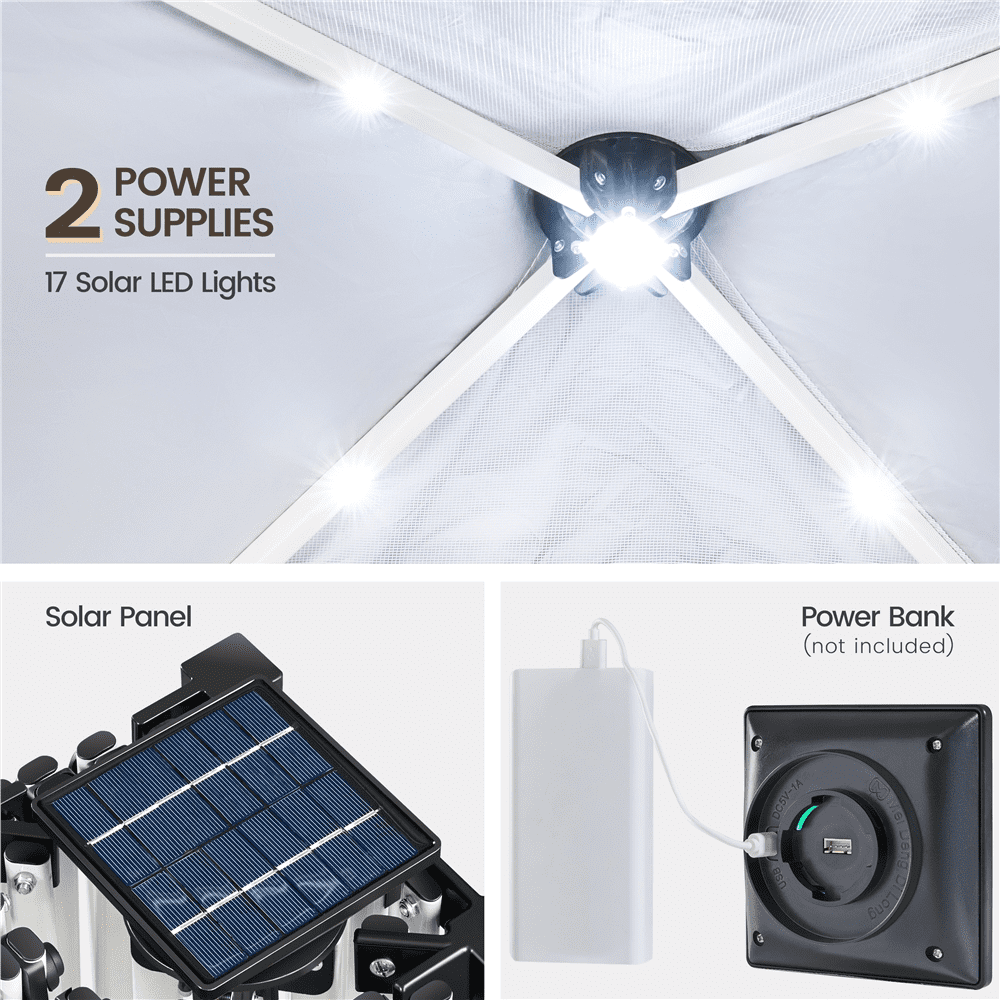 Alden Design 10 × 10 ft Portable Pop-Up Canopy Tent with 17 Solar LED Lights for Home & Commercial Use, White 1 Solar Panel Overall Dimensions: 10′ L × 10′ W × (8.3-9)′ H 1 Remote Control Adjustable Canopy Height: 8.3′, 8.6′, 9′ LED Power Supply: Solar Panel, Power Bank 1 Charge Cord Note: 1. Please allow measuring deviation due to manual measurement. 4 Sandbags Materials: Powder-Coated Steel, Polyester Fabric Shipping Weight: 32.4 lb Lightbulb Type: LED 2. Please do not use this canopy in a strong breeze, continuous light rain, heavy rain, or other extreme weather conditions. 4 Anchor Ropes Package Includes: Lightbulb Quantity: 17 3. Please anchor the canopy tent to the ground when in use. 8 Ground Anchors 1 Canopy Tent 4. Two or more adults are required to set up/take down this canopy tent. Rolling Storage Bag: 10″ L × 8″ W × 45.3″ H Canopy Color: White 1 Rolling Storage Bag Item Weight: 29.5 lb