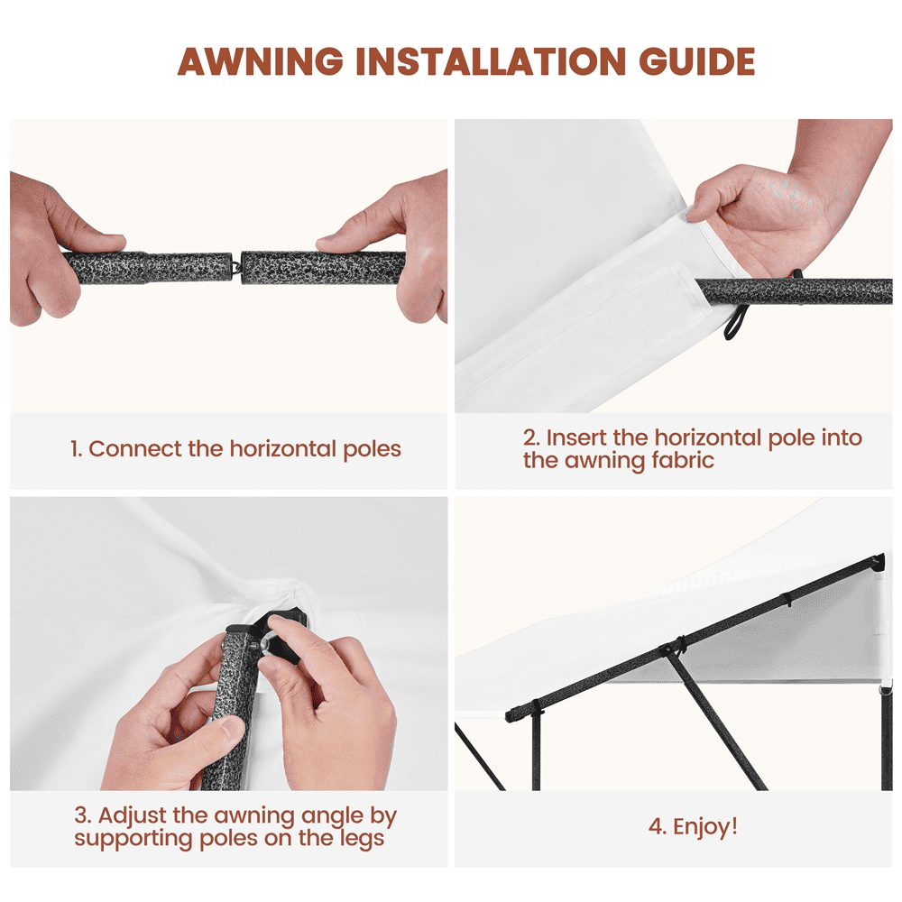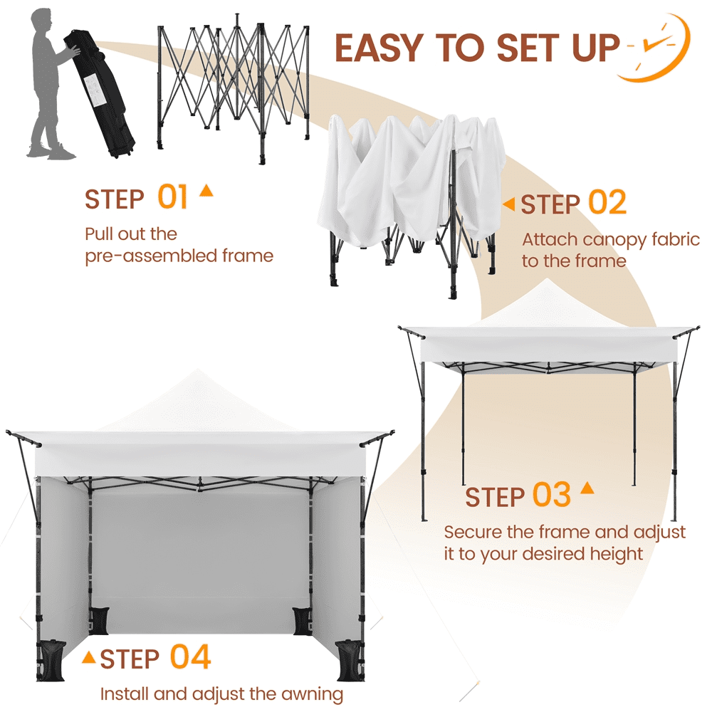 Alden Design 10ft Commercial Pop-up Canopy W/ 3 Sidewalls & Adjustable Awning for Outdoor, White Canopy Color: White Materials: Powder-coated Steel, Polyester Fabric Assembled Dimensions: 10′ L × 10′ W × 10-11′ H Adjustable Height: 10′, 10.5′, 11′ Awning: 10′ L × 3.3′ W Banner Section: 10′ L × 1′ W Roller Bag: 11.4″ L × 11″ W × 67.3″ H / 1′ L × 0.9′ W × 5.6′ H Item Weight: 63 lb Shipping Weight: 68.8 lb Set Includes: 1 Canopy Tent 1 Roller Bag 3 Sidewalls 4 Sandbags 4 Guy Lines 4 Ground Stakes Note: 1. Please allow measuring deviation due to manual measurement. 2. For optimal performance and safety, do not use this canopy tent in conditions of strong breeze, continuous light rain, heavy rain, or any other extreme weather scenarios. 3. Please anchor the canopy tent to the ground when in use. 4. Two or more adults are needed to set up/take down this canopy tent. Detachable Sidewalls for Protection & Privacy Adjustable Height & Awning For Flexibility