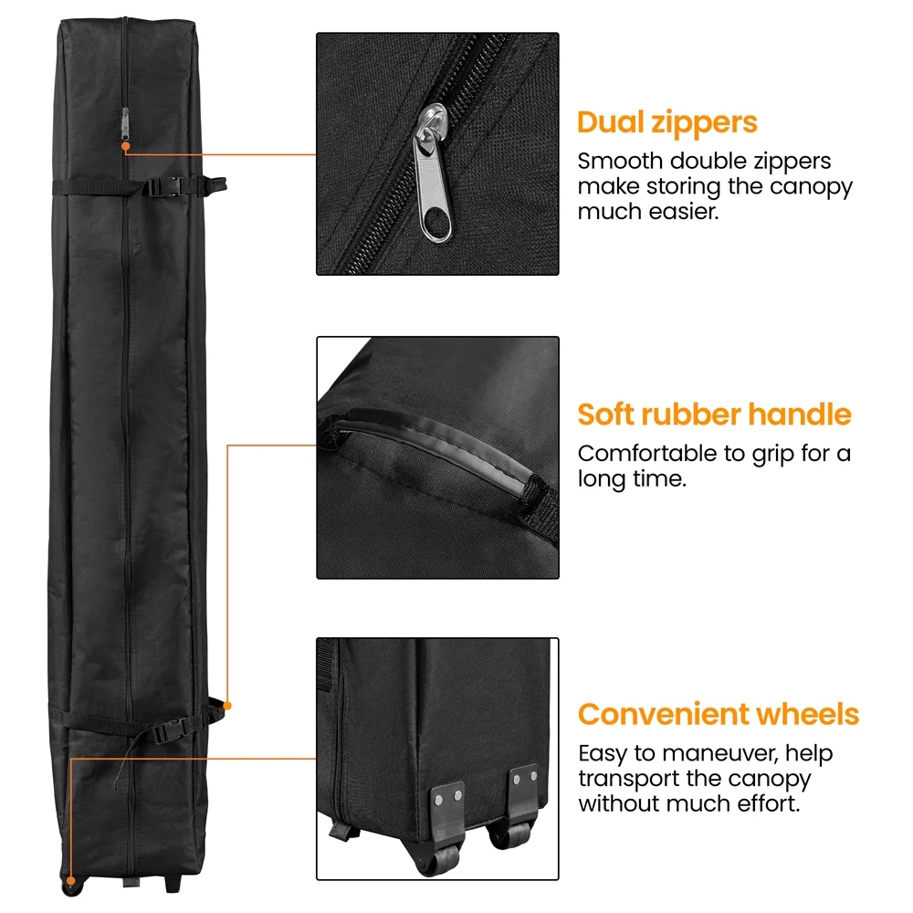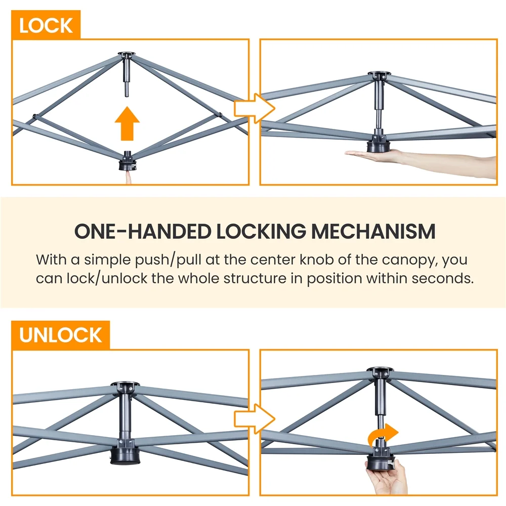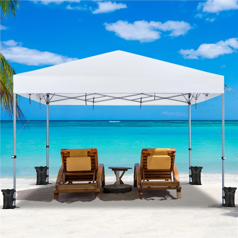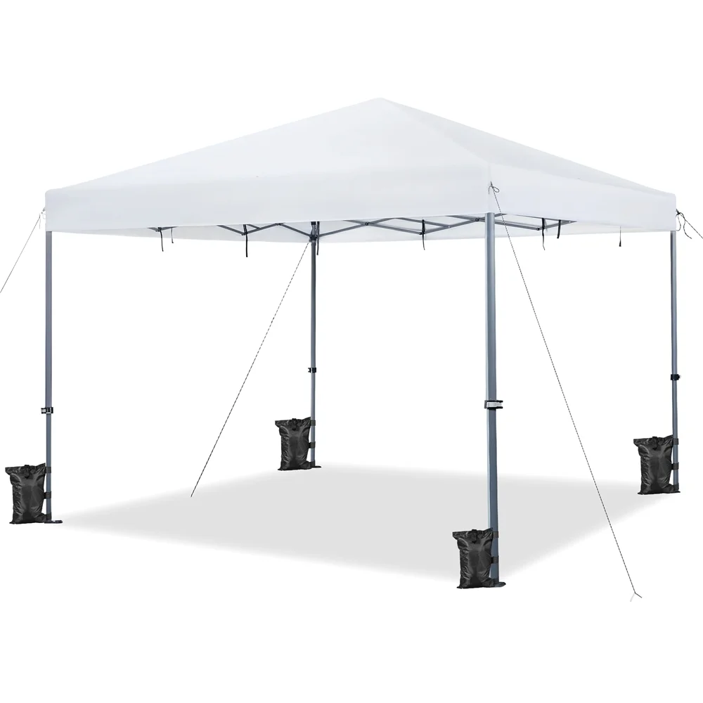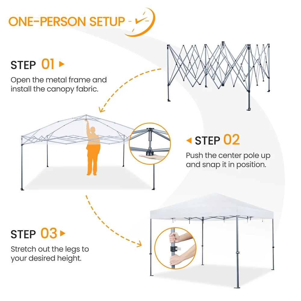 Durable Weather Protection: Featuring water-resistant Oxford fabric, UPF 50+ protection, and a sturdy steel frame, this 12 × 12ft canopy is designed to withstand the elements Quick Setup with One Push: The one-push-to-lock system allows for fast and easy setup and takedown, securing the entire canopy with a simple press of the center knob Adjustable Height Options: With its height-adjustable feature, this outdoor canopy can be set between 7′ and 9.5′, giving you complete control over your shade coverage Easy Transport & Storage: The included wheeled storage bag ensures hassle-free transport and storage, with convenient handles and snap buckle straps for added protection Complete Accessory Kit: This pop-up canopy equipped with everything you need for easy outdoor use, including a roller bag, 4 guy lines, 8 L-shaped metal anchors, and 4 sandbags Canopy Color: White Materials: Powder-coated Steel, Polyester Fabric Assembled Dimensions: 12′ L × 12′ W × 7-9.5′ H Roller Bag: 9″ L × 9″ W × 57″ H / 0.7′ L × 0.7′ W × 4.8′ H Item Weight: 47.1 lb Note: Please allow measuring deviation due to manual measurement Note: For optimal performance and safety, do not use this canopy in conditions of strong breeze, continuous light rain, heavy rain, or any other extreme weather scenarios