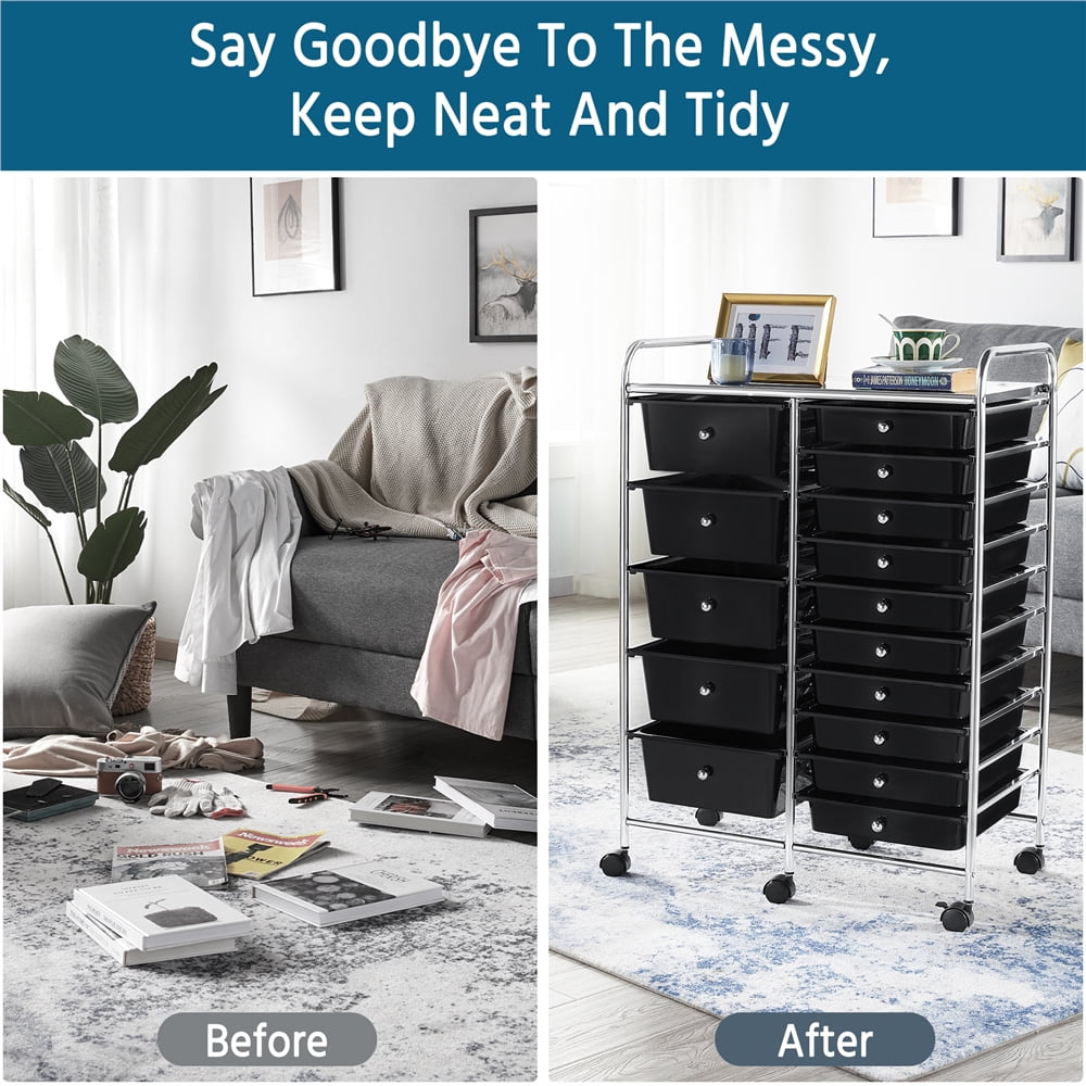SmileMart 15 Drawers Metal Frame Storage Cart Rolling Bin Organizer Trolley with Lockable Wheels, Black: Color: Black Drawer Quantity: 15 Material: Steel. PP Dimension: 63 x 37 x 91 cm/ 25 x 15 x 36’’ (L x W x H) Drawer: Large: 36 x 28.5 x 12 cm/ 14 x 12 x 5’’ (L x W x H) Small: 36 x 28.5 x 6 cm/ 14 x 12 x 2.5 (L x W x H) Bearing: large drawer (each): 5kg/ 11 lb small drawer(each):2 kg/ 4 lb top platform: 10 kg/ 22 lb G.W.: 9 kg/ 20 lb N.W.: 7 kg/ 15 lb Note: Please allow ± 1 cm error due to manual measurement. Please do not place items which exceed the max. weight capacity of this storage cart.