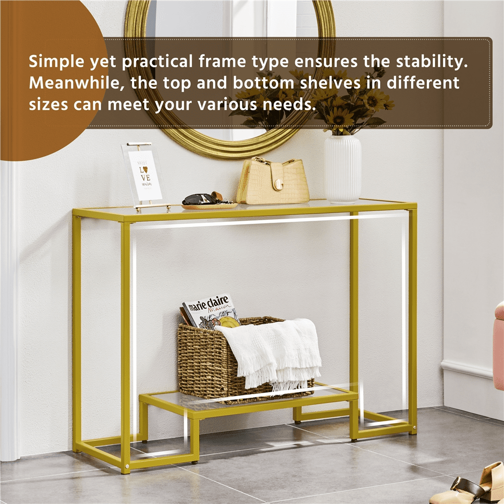 Alden Design 2-Layer Modern Tempered Glass Console Table with Metal Frame for Hallway, Gold