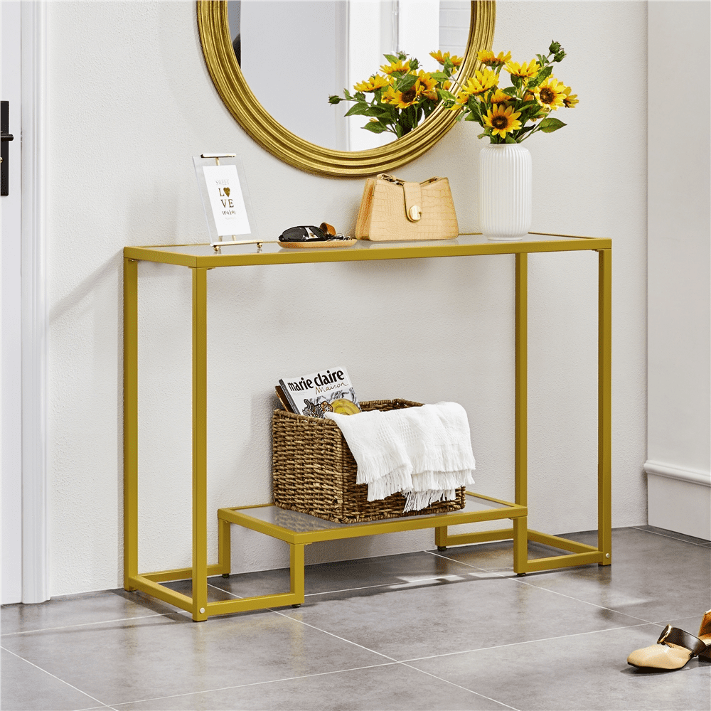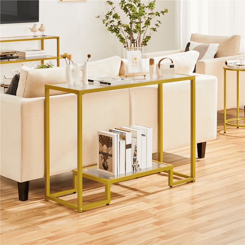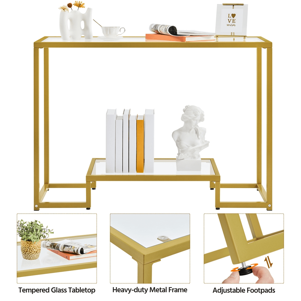 Effortless Versatility: Whether in a bright hallway or a cozy living room, this sofa table blends seamlessly with different settings. Its crystal-clear tempered glass and sleek metal frame serve as an understated addition that adds clarity and style. Timeless Appeal: With a transparent glass top and frame in black or gold, this sofa table complements modern and classic interiors—from minimalist apartments to traditional homes. For those who enjoy a well-styled space, it fits seamlessly in entryways, living rooms, or hallways. Scratch-Resistant Elegance That Lasts: Made with high-strength tempered glass, this modern console table keeps its flawless appearance even with daily use. It’s resistant to scratches and light bumps, so you can enjoy its fresh, polished look longer. Quick Cleanup, Always Ready: Spilled coffee or dusty corners? Just grab a damp cloth. This tempered-glass table is simple to maintain, giving you more time to enjoy your space and less time cleaning. Specifications: Color: Gold; Materials: Tempered Glass, Iron; Assembled Dimensions: 42″ L × 14″ W × 29.5″ H; Maximum Weight Capacity: Tabletop: 99 lb; Bottom Shelf: 55 lb; Shipping Weight: 30.2 lb; Item Weight: 22.5 lb.