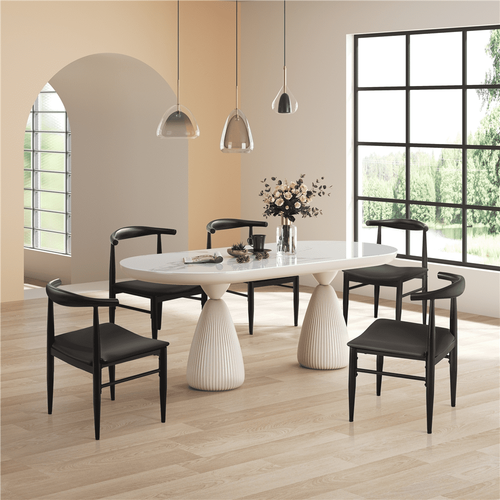 Do you consider upgrading your kitchen or living room? How about this set of two modern dining chairs? Each dining chair is crafted with a water-resistant PU leather surface, a high-density foam-padded seat, and smooth powder-coated metal legs, which are easy-matching and have a strong capacity of 136 kg / 300 lb. Their armless design, clean lines, and classic color scheme bring a fresh, elegant touch to your space, seamlessly complementing your kitchen table, dining table, and coffee table.