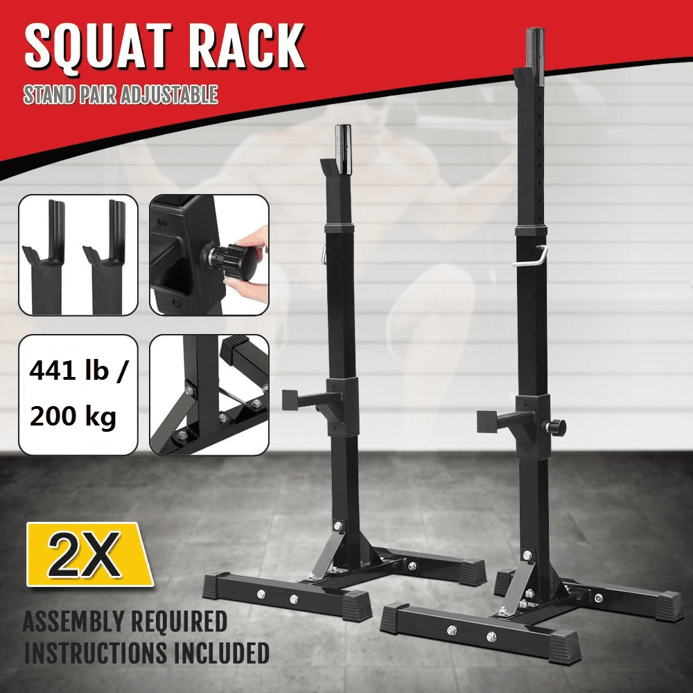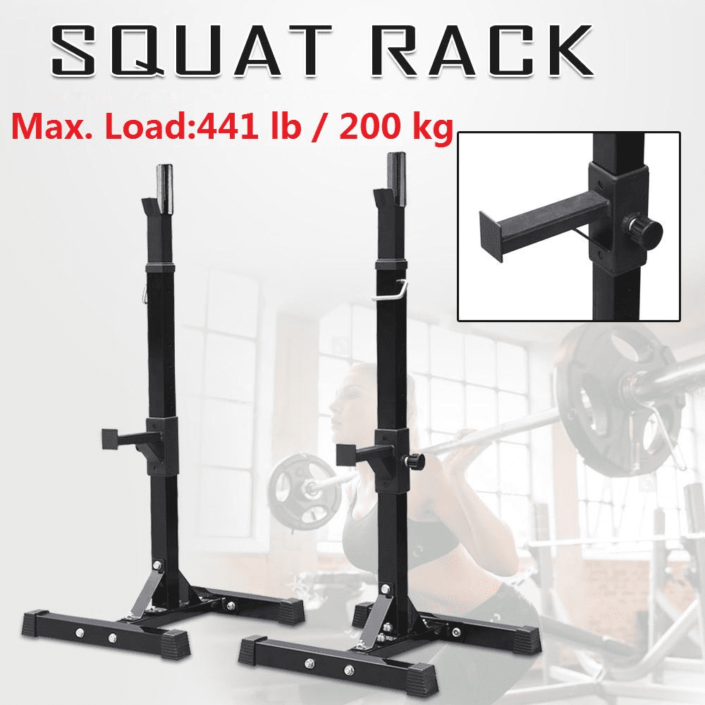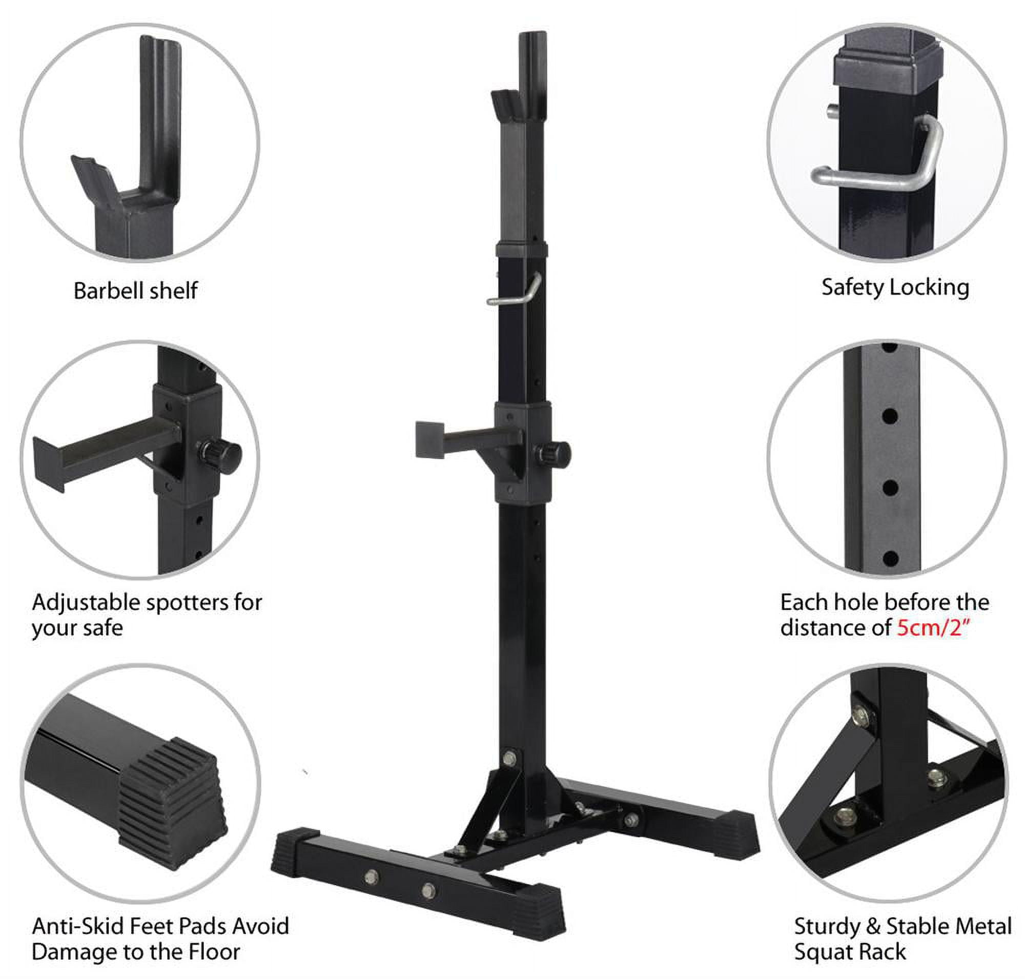 SmileMart 2 Pieces Adjustable Standard Solid Squat Barbell Weight Rack Stands: G.W.: 19.9 kg/ 43.9 lb Material: Metal black finish Max Load: (Approx.) 200 kg / 441 lb Overall Size (Approx.): 54.5 x 50.5 x (114-179) cm/ 21.5 x 20 x (45-70.5)” (L x W x H) Base Size (Approx.): 54.5 x 50.5 cm/ 21.5 x 20″ (L x W) Square Tube (Approx.): 5 x 5 cm/2 x 2″ Hole Spacing: 5 cm/2″