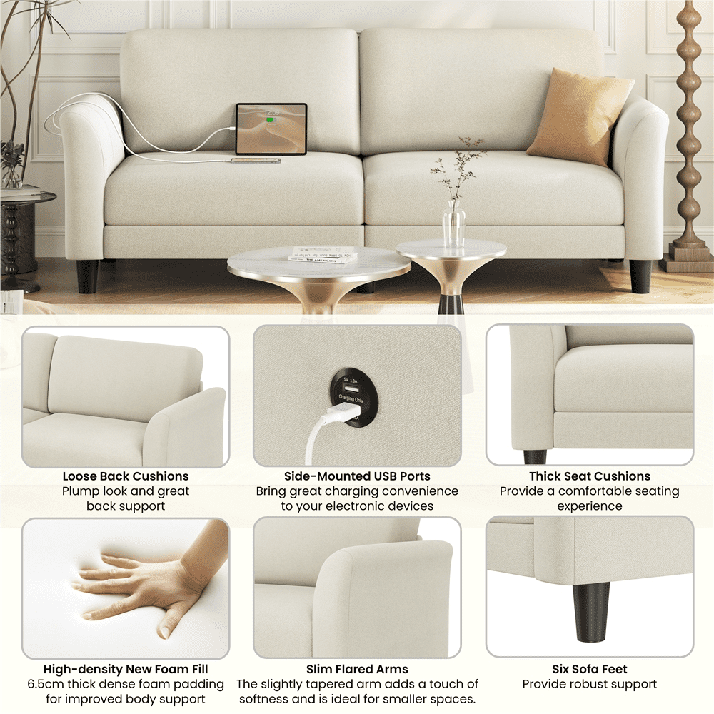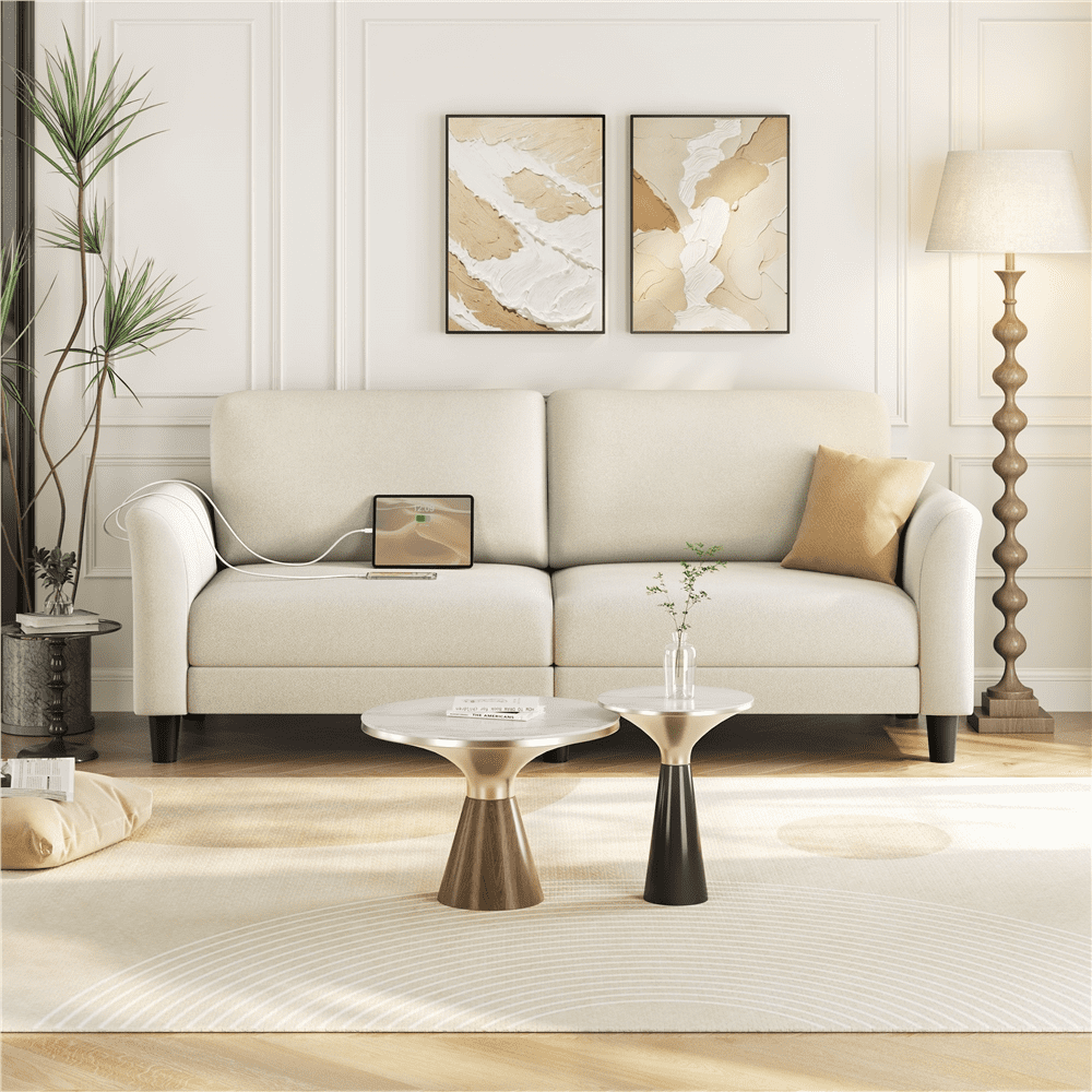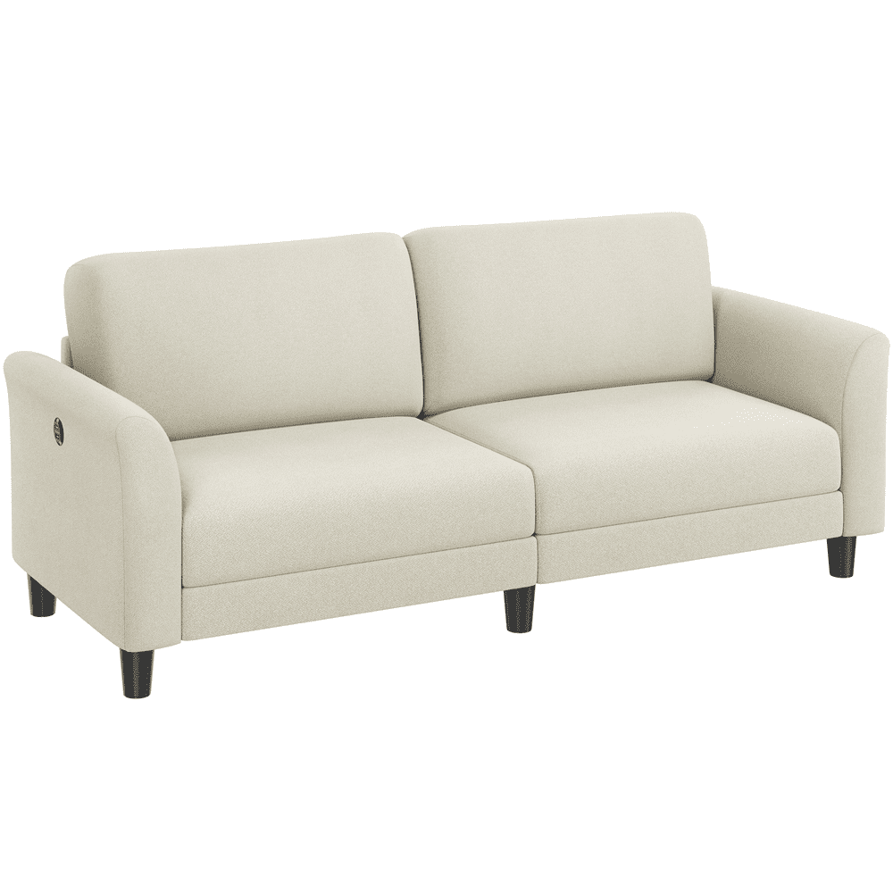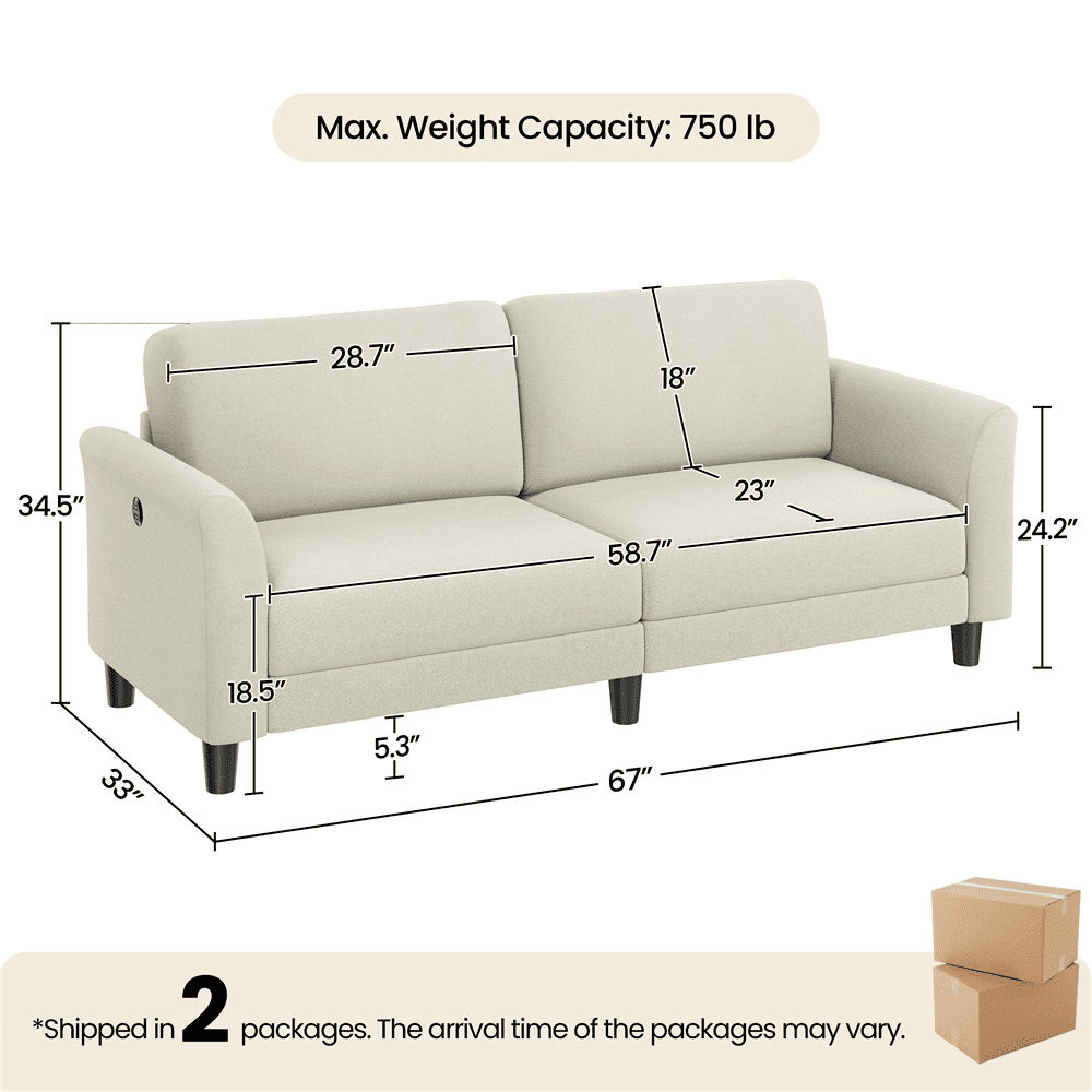 Alden Design 2-Seater 67″W Upholstered Sofa with USB Charging Ports for Living Room, Beige Solid Construction: This loveseat sofa is built with a blend of solid wood and engineered wood frame, with a maximum load capacity of 750 lb. The durable terry fabric is gentle on the skin and resistant to wear. Comfy Seat: With a seat size of 58.7 x 23″ (WxD), this 2-seater sofa can accommodate 2-3 family members or guests, and it’s also ideal for one person to sit in various positions for a more cozy relaxation. Loose Back Cushion & Flared Arms: These 2 loose back cushions are generously stuffed with polyester fiberfill to bring softer comfort, the back cushion covers are detachable for easy washing. The flared arms not only offer a comfortable place to rest, but also add a visually appealing element that enhances the overall appearance. Convenient USB Ports: Designed with the user’s current demands in mind, this fabric couch for living room includes 2 integrated USB ports on the right. Painstaking Details: This contemporary sofa is equipped with six felt pads on the legs to prevent floor scratches. It also features 5.3 inches of clearance under the seat, making it easier to clean the area beneath the sofa. Specifications: Color: Beige; Materials: Polyester, iron, foam, plywood, MDF, solid wood, plastic; Assembled Dimensions: 67″W x 33″D x 34.5″H; Seat Size: 58.7 x 23″ (WxD); Seat Height: 18.5″; Arm Height: 24.2″; Maximum Weight Capacity: 750 lb; Ground Clearance: 5.3″ Item Weight: 77.8 lb; Shipping Weight: Box #1: 44.1 lb, Box #2: 47.4 lb.