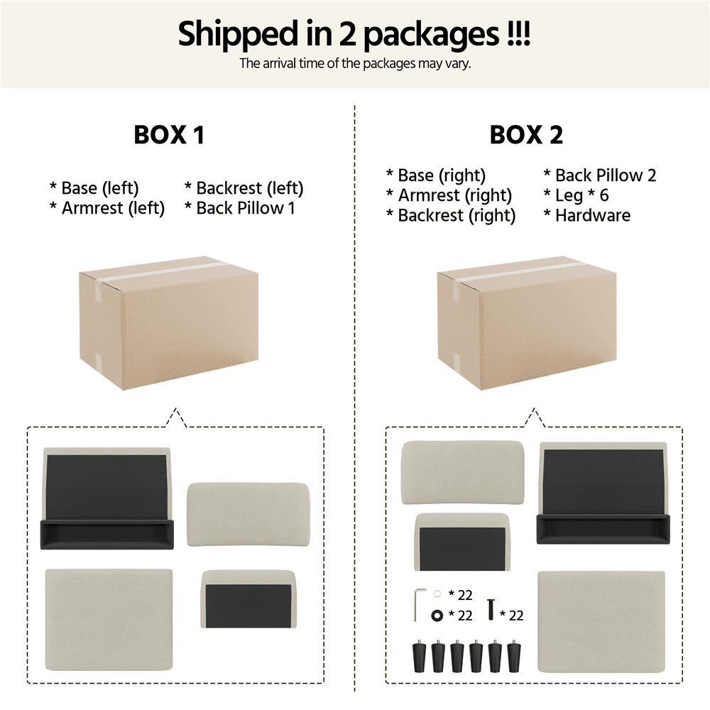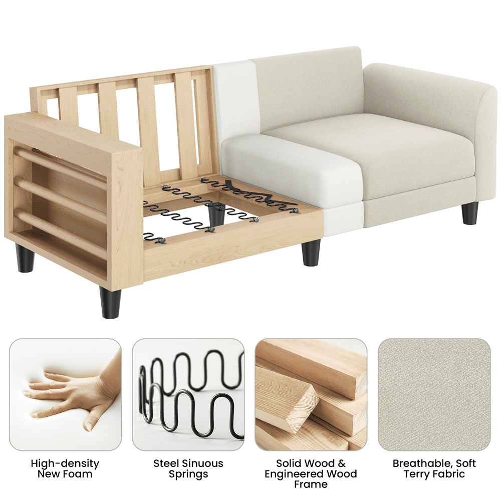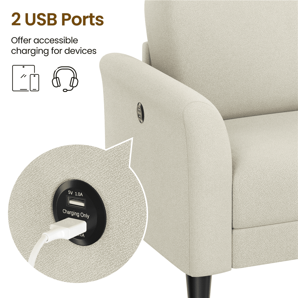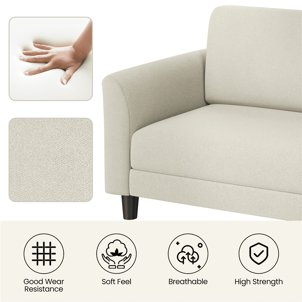Alden Design 2-Seater 67″W Upholstered Sofa with USB Charging Ports for Living Room, Beige Solid Construction: This loveseat sofa is built with a blend of solid wood and engineered wood frame, with a maximum load capacity of 750 lb. The durable terry fabric is gentle on the skin and resistant to wear. Comfy Seat: With a seat size of 58.7 x 23″ (WxD), this 2-seater sofa can accommodate 2-3 family members or guests, and it’s also ideal for one person to sit in various positions for a more cozy relaxation. Loose Back Cushion & Flared Arms: These 2 loose back cushions are generously stuffed with polyester fiberfill to bring softer comfort, the back cushion covers are detachable for easy washing. The flared arms not only offer a comfortable place to rest, but also add a visually appealing element that enhances the overall appearance. Convenient USB Ports: Designed with the user’s current demands in mind, this fabric couch for living room includes 2 integrated USB ports on the right. Painstaking Details: This contemporary sofa is equipped with six felt pads on the legs to prevent floor scratches. It also features 5.3 inches of clearance under the seat, making it easier to clean the area beneath the sofa. Specifications: Color: Beige; Materials: Polyester, iron, foam, plywood, MDF, solid wood, plastic; Assembled Dimensions: 67″W x 33″D x 34.5″H; Seat Size: 58.7 x 23″ (WxD); Seat Height: 18.5″; Arm Height: 24.2″; Maximum Weight Capacity: 750 lb; Ground Clearance: 5.3″ Item Weight: 77.8 lb; Shipping Weight: Box #1: 44.1 lb, Box #2: 47.4 lb.