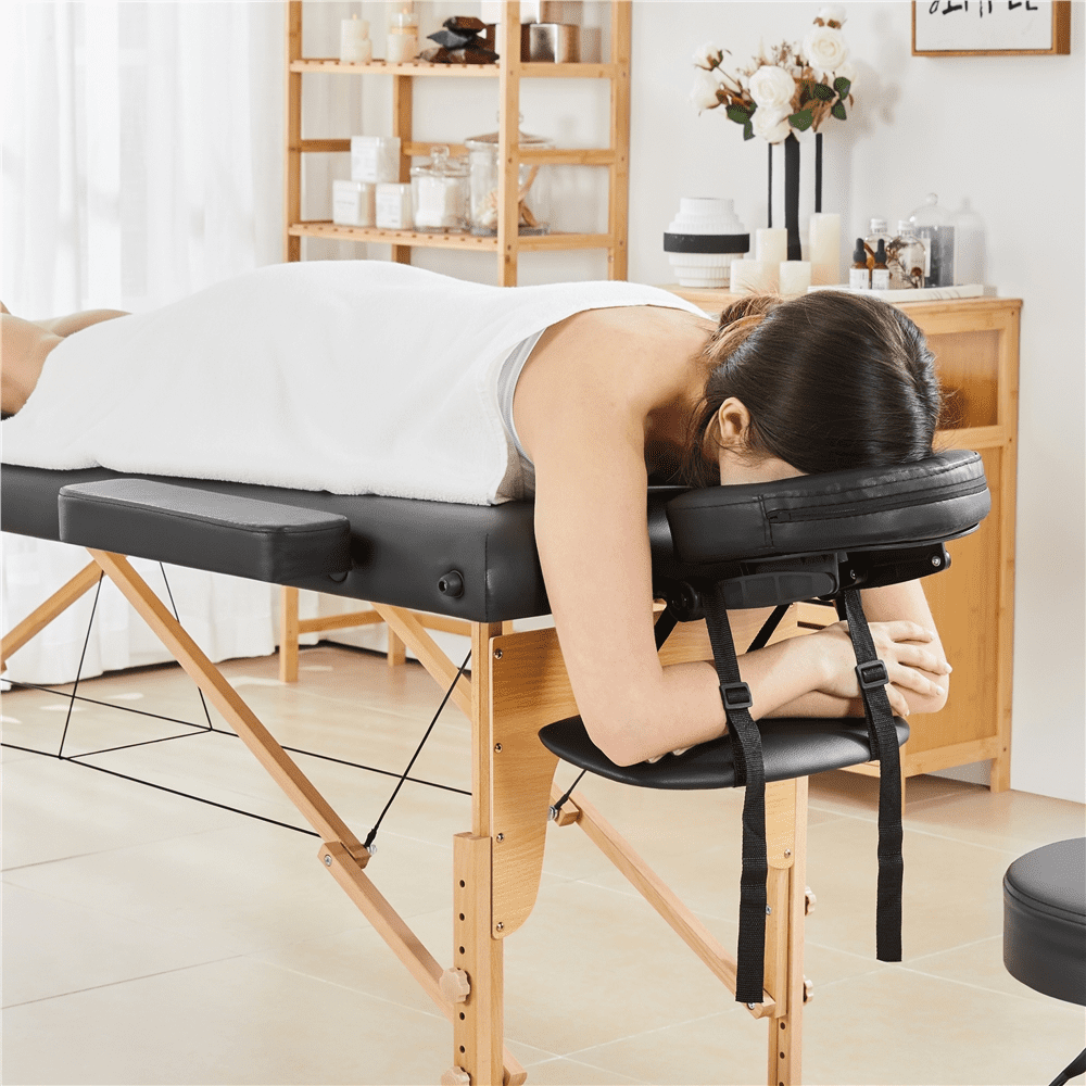 Alden Design 2 Section Portable and Adjustable Wooden Massage Table, 84″ x 32.3″, Black Constructed from durable materials: Beech wood legs, composite board, and a cushioned surface made of plywood, non-woven fabrics, sponge, and PVC Excellent workmanship ensures a comfortable experience with a professional design A 2-inch thick sponge provides optimal comfort during use Unfolded dimensions: 83.9 x 32.3 x 25.2-33.7 inches L x W x H Compact folding size: 36.4 x 23.6 x 7.3 inches (L x W x H) for easy storage and transport Headrest dimensions: 11 x 10.4 x 2.8 inches (L x W x H) for added comfort Armrest dimensions: 13.8 x 4.3 x 2 inches (L x W x H) for enhanced support Lightweight design with a gross weight of 33.5 lbs for easy handling Strong weight capacity: Supports up to 551.2 lbs, ensuring stability during use Easy to assemble: Tool-free setup allows for quick and convenient adjustments Note: Please allow for a 1-2 cm (0.4-0.8″) error due to manual measurement
