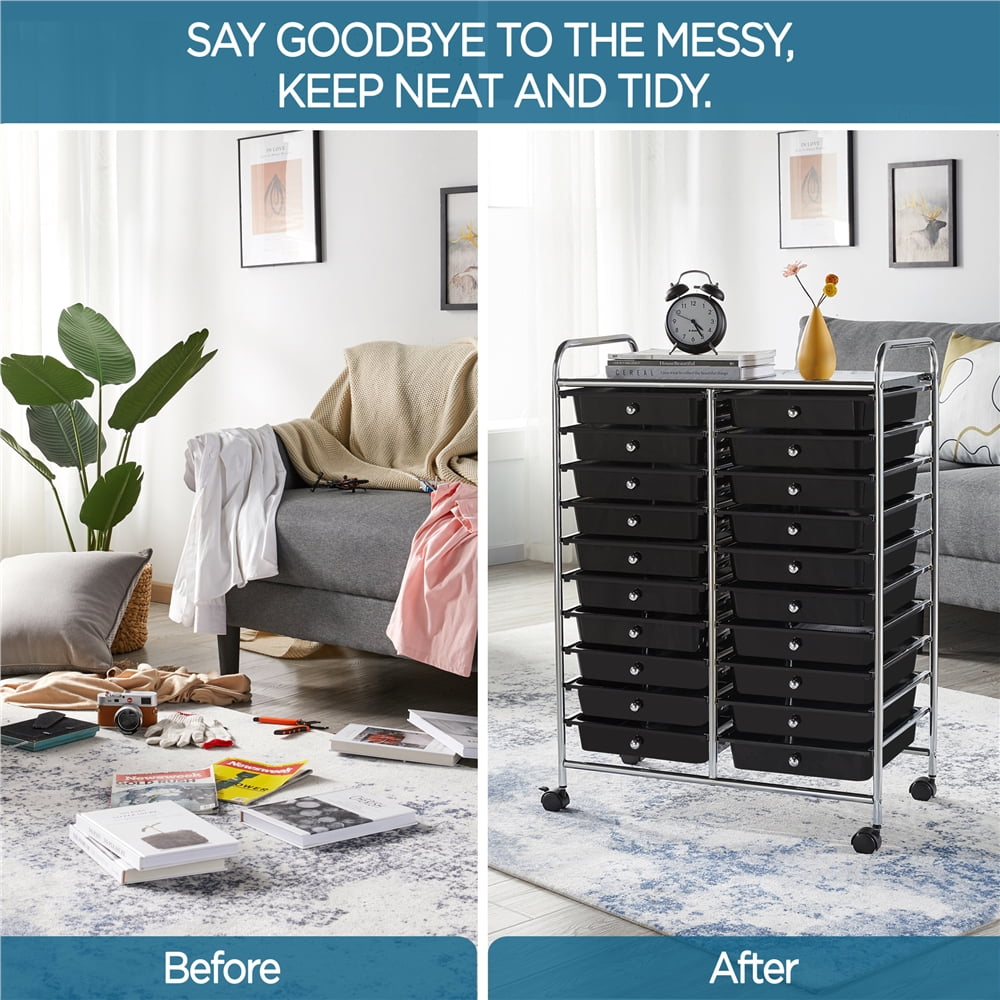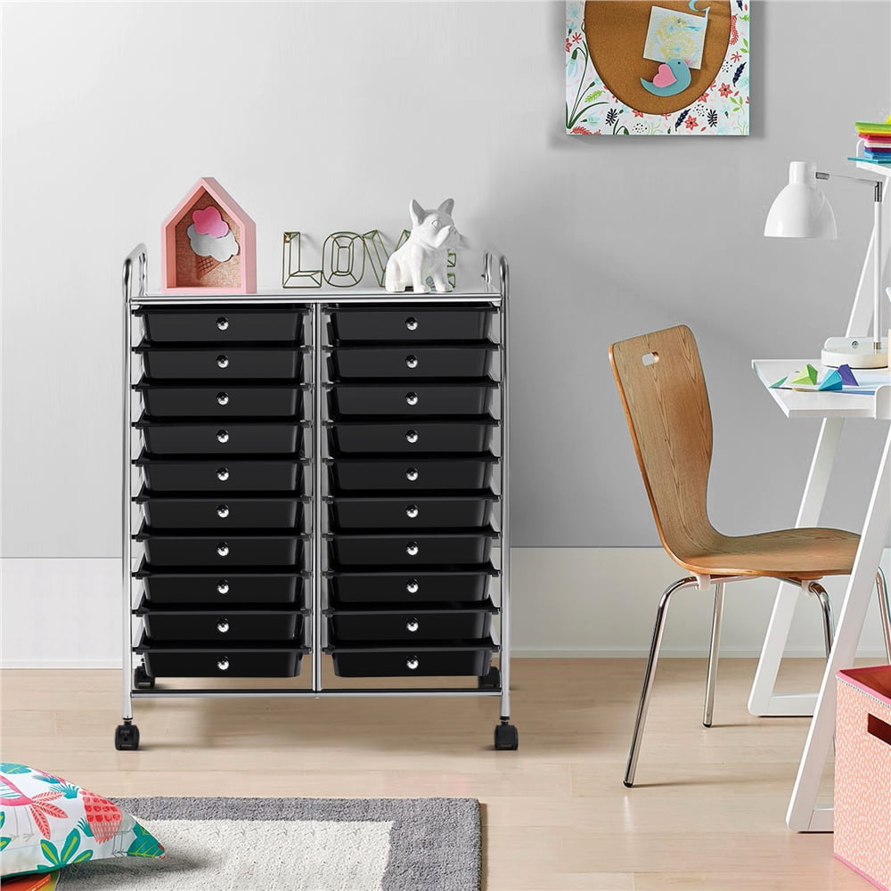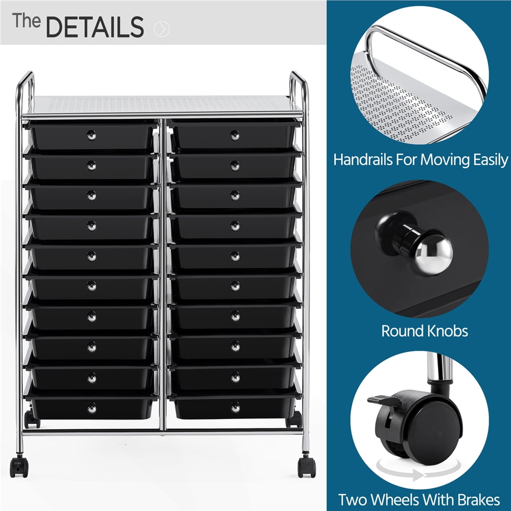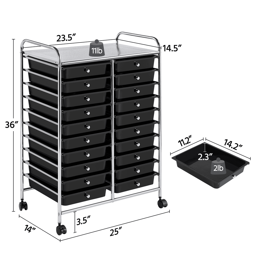 SmileMart 20 Drawers Metal Frame Storage Cart Rolling Bin Organizer Trolley with Lockable Wheels, Black: Materials: iron, PP Color: Black Drawer Quantity; 20 Dimensions: 62.5 x 36 x 91 cm/ 25 x 14 x 36’’ (L x W x H); Drawer (inner): 32 x 24.8 x 6 cm/ 13 x 10 x 2.5’’ (L x W x H); Bearing: total: 15 kg/ 33 lb; each drawer: 1 kg/ 2 lb; top platform: 5 kg/ 11 lb; N.W.: 8 kg/ 17 lb G.W.: 9.5 kg/ 21 lb Note: 1.Please do not place or store items that exceed the max. weight capacity of this storage trolley. 2.Please allow slight errors due to manual measurement.